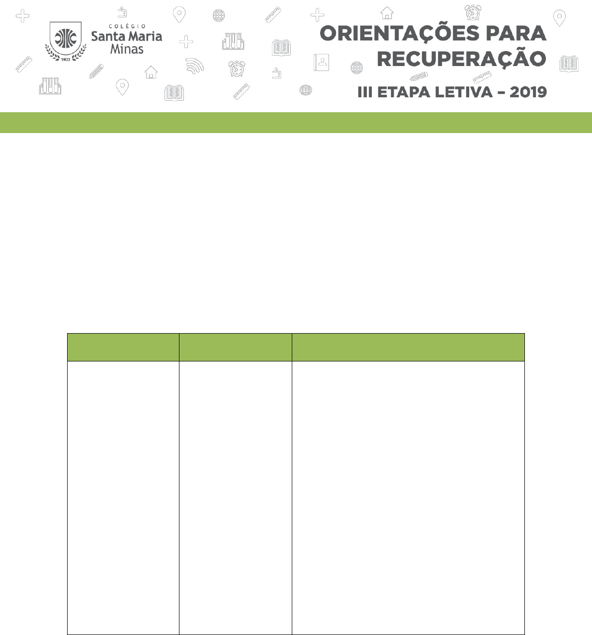 ORIENTAÇÕES PARA RECUPERAÇÃO – III ETAPA – FÍSICA – 9.º ANO/EF FÍSICA – 9.º ANO/EF A Recuperação é uma estratégia do processo educativo que visa à superação de dificuldades específicas encontradas pelo aluno durante a Etapa Letiva. Trata-se de uma oportunidade para que o aluno possa desenvolver as competências e as habilidades contempladas nos componentes curriculares e, dessa forma, alcançar o desempenho esperado. Segue abaixo a relação de Unidades Temáticas, Objetos de Conhecimento e Habilidades que serão verificados na Avaliação de Recuperação. UNIDADES TEMÁTICAS OBJETOS DE CONHECIMENTO HABILIDADES TERMODINÂMICA ONDULATÓRIA ELETROMAGNETISMO Calor e energia Ondas Eletricidade e magnetismo (EM09FI09) Reconhecer o calor como forma de energia em trânsito. (EM09FI10) Identificar o estado de equilíbrio térmico. (EM09FI11) Apresentar a onda como meio de transporte de energia e não de matéria. (EM09FI12) Reconhecer os tipos de onda quanto ao meio, natureza e forma. (EM09FI14) Identificar fenômenos eletrostá- ticos. (EM09FI16) Analisar o funcionamento da bússola (EM09FI17) Reconhecer as propriedades magnéticas do ímã. ORIENTAÇÕES Refaça todos os exercícios feitos em casa e em sala. Revise toda matéria anotada no caderno. Faça as atividades indicadas no item III. ORIENTAÇÕES PARA RECUPERAÇÃO – III ETAPA – FÍSICA – 9.º ANO/EF SUGESTÕES DE ATIVIDADES 01. (G1 – IFSUL 2017) A cidade de São Paulo, como muitas outras do nosso país, é bastante castigada pela poluição do ar no inverno, pois os poluentes ficam com temperaturas mais baixas que o ar puro das camadas superiores, o que faz com que não ocorra a dispersão dos poluentes. Esse fenômeno físico é conhecido por A) convecção. B) radiação. C) inversão térmica. D) condução. 02. (G1 1996) O que é calor? 03. (G1 1996) Como o calor se propaga? 04. (G1 1996) Defina Calor e Temperatura. 05. (UNESP 1989) Numa experiência clássica, coloca-se dentro de uma campânula de vidro onde se faz o vácuo, uma lanterna acesa e um despertador que está despertando. A luz da lanterna é vista, mas o som do despertador não é ouvido. Isso acontece porque A) o comprimento de onda da luz é menor que o do som. B) nossos olhos são mais sensíveis que nossos ouvidos. C) o som não se propaga no vácuo e a luz sim. D) a velocidade da luz é maior que a do som. E) o vidro da campânula serve de blindagem para o som mas não para a luz. 06. (G1 1996) Defina "Ondas" e dê no mínimo dois exemplos. 07. (G1 1996) Defina "Onda Mecânica". EXEMPLIFIQUE. 08. (G1 1996) Diferencie "ondas eletromagnéticas" e "ondas mecânicas". 09. (UNESP 1996) Nas últimas décadas, o cinema tem produzido inúmeros filmes de ficção científica com cenas de guerras espaciais, como "Guerra nas Estrelas". Com exceção de "2001, Uma Odisseia no Espaço", estas cenas apresentam explosões com estrondos impressionantes, além de efeitos luminosos espetaculares, tudo isso no espaço interplanetário. a) Comparando "Guerra nas Estrelas", que apresenta efeitos sonoros de explosão, com "2001, uma Odisseia no Espaço", que não os apresenta, qual deles está de acordo com as leis da Física? JUSTIFIQUE. b) E quanto aos efeitos luminosos, que todos apresentam? JUSTIFIQUE. ORIENTAÇÕES PARA RECUPERAÇÃO – III ETAPA – FÍSICA – 9.º ANO/EF 10. (FAAP 1997) O som é uma onda .____________. Para se propagar necessita __________ e a altura de um som refere-se à sua ______________ A) plana – do ar – intensidade B) mecânica – do meio material – frequência C) mecânica – do vácuo – frequência D) transversal – do ar – velocidade E) transversal – do meio material – intensidade 11. (PUCSP 1999) Na figura está representado, em um determinado instante, o perfil de uma corda por onde se propaga uma onda senoidal. Sabe-se que a frequência de propagação da onda é de 1,5hertz. O comprimento de onda e a velocidade de propagação da onda na corda são, respectivamente, A) 6 cm e 18 cm/s B) 12 cm e 18 cm/s C) 12 cm e 8 cm/s D) 4 cm e 8 cm/s E) 4 cm e 6 cm/s 12. (UFSM 2000) Considere as afirmações a seguir, a respeito da propagação de ondas em meios elásticos. I. Em uma onda longitudinal, as partículas do meio no qual ela se propaga vibram perpendicularmente à direção de propagação. II. A velocidade de uma onda não se altera quando ela passa de um meio para outro. III. A frequência de uma onda não altera quando ela passa de um meio para outro. Está(ão) correta(s) A) apenas I. B) apenas II. C) apenas III. D) apenas I e II. E) apenas I e III. 13. (G1 1996) Você liga um televisor, o material que reveste a tela internamente, perde uma grande quantidade de elétrons e se torna eletricamente carregado. Você pode verificar a presença dessa carga aproximando o braço da tela e notando como os pelos ficam "em pé". Qual é o sinal da carga adquirida pela tela? ORIENTAÇÕES PARA RECUPERAÇÃO – III ETAPA – FÍSICA – 9.º ANO/EF 14. (G1 1996) Têm-se três esferas metálicas A, B e C eletrizadas. Aproximando-se uma da outra constata-se que A atrai B e B repele C. Então podemos afirmar que: A) A e B possuem cargas positivas e C possui carga negativa; B) A e B possuem cargas negativas e C possui carga positiva; C) A e C possuem cargas positivas e B possui carga negativa; D) A e C possuem carga de mesmo sinal e B possui carga de sinal contrário ao sinal de A; E) A e C possuem cargas de sinais contrários e B possui carga de sinal contrário ao sinal de A. 15. (G1 1996) Esfregando-se um bastão de vidro com um pano de seda, o bastão passa a trair pedacinhos de papel. A explicação mais correta deste fato é que: A) o bastão eletrizou-se; B) o pano não se eletrizou; C) o bastão é um bom condutor elétrico; D) o papel é um bom condutor elétrico; E) o papel estava carregado positivamente. 16. (G1 1996) Qual é a carga elétrica de um corpo que possui 2.980 prótons e 3.010 elétrons?