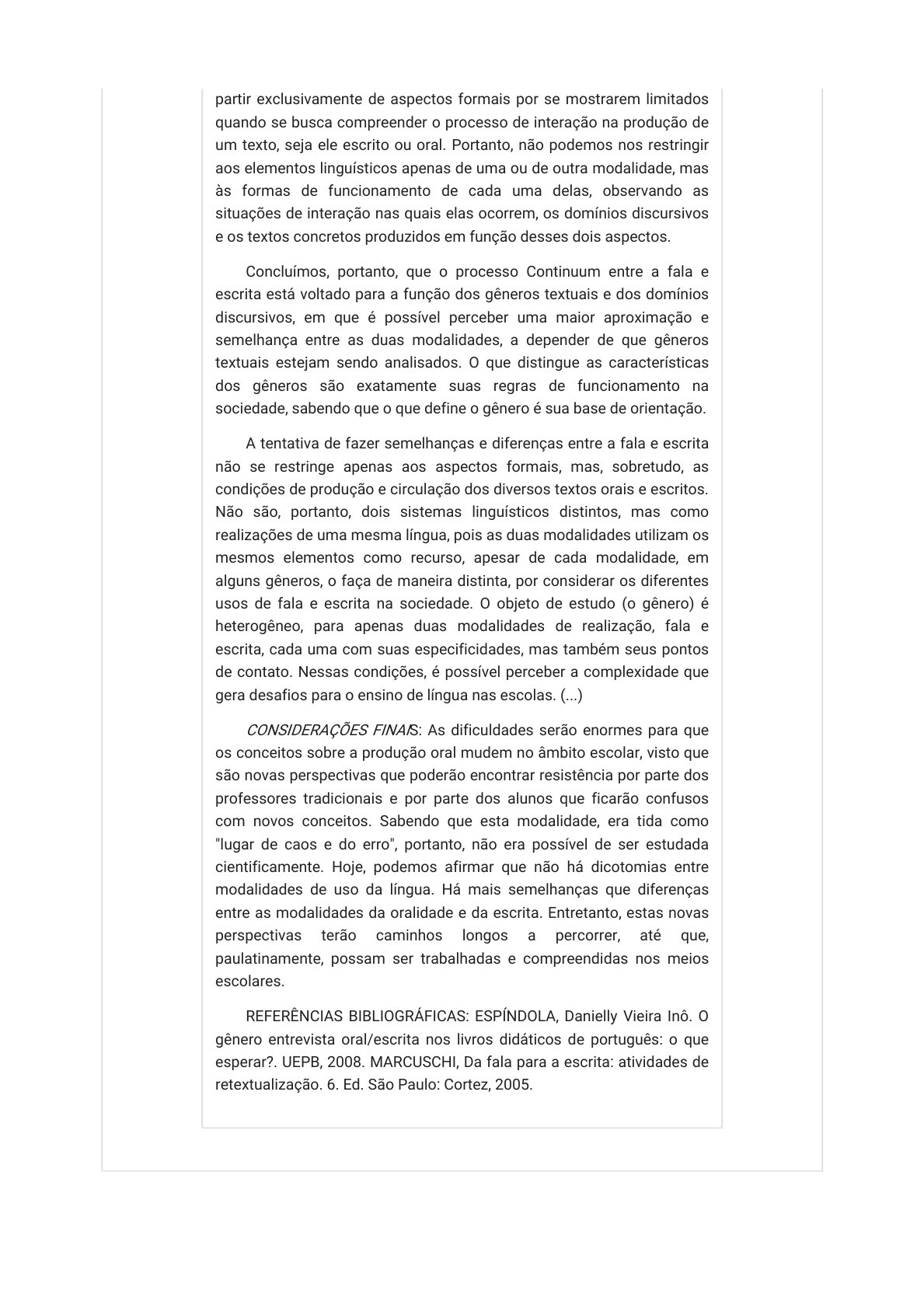 partir exclusivamente de aspectos formais por se mostrarem limitados quando se busca compreender o processo de interação na produção de um texto, seja ele escrito ou oral. Portanto, não podemos nos restringir aos elementos linguísticos apenas de uma ou de outra modalidade, mas às formas de funcionamento de cada uma delas, observando as situações de interação nas quais elas ocorrem, os domínios discursivos e os textos concretos produzidos em função desses dois aspectos. Concluímos, portanto, que o processo Continuum entre a fala e escrita está voltado para a função dos gêneros textuais e dos domínios discursivos, em que é possível perceber uma maior aproximação e semelhança entre as duas modalidades, a depender de que gêneros textuais estejam sendo analisados. O que distingue as características dos gêneros são exatamente suas regras de funcionamento na sociedade, sabendo que o que define o gênero é sua base de orientação. A tentativa de fazer semelhanças e diferenças entre a fala e escrita não se restringe apenas aos aspectos formais, mas, sobretudo, as condições de produção e circulação dos diversos textos orais e escritos. Não são, portanto, dois sistemas linguísticos distintos, mas como realizações de uma mesma língua, pois as duas modalidades utilizam os mesmos elementos como recurso, apesar de cada modalidade, em alguns gêneros, o faça de maneira distinta, por considerar os diferentes usos de fala e escrita na sociedade. O objeto de estudo (o gênero) é heterogêneo, para apenas duas modalidades de realização, fala e escrita, cada uma com suas especificidades, mas também seus pontos de contato. Nessas condições, é possível perceber a complexidade que gera desafios para o ensino de língua nas escolas. (...) CONSIDERAÇÕES FINAIS: As dificuldades serão enormes para que os conceitos sobre a produção oral mudem no âmbito escolar, visto que são novas perspectivas que poderão encontrar resistência por parte dos professores tradicionais e por parte dos alunos que ficarão confusos com novos conceitos. Sabendo que esta modalidade, era tida como "lugar de caos e do erro", portanto, não era possível de ser estudada cientificamente. Hoje, podemos afirmar que não há dicotomias entre modalidades de uso da língua. Há mais semelhanças que diferenças entre as modalidades da oralidade e da escrita. Entretanto, estas novas perspectivas terão caminhos longos a percorrer, até que, paulatinamente, possam ser trabalhadas e compreendidas nos meios escolares. REFERÊNCIAS BIBLIOGRÁFICAS: ESPÍNDOLA, Danielly Vieira Inô. O gênero entrevista oral/escrita nos livros didáticos de português: o que esperar?. UEPB, 2008. MARCUSCHI, Da fala para a escrita: atividades de retextualização. 6. Ed. São Paulo: Cortez, 2005. 66