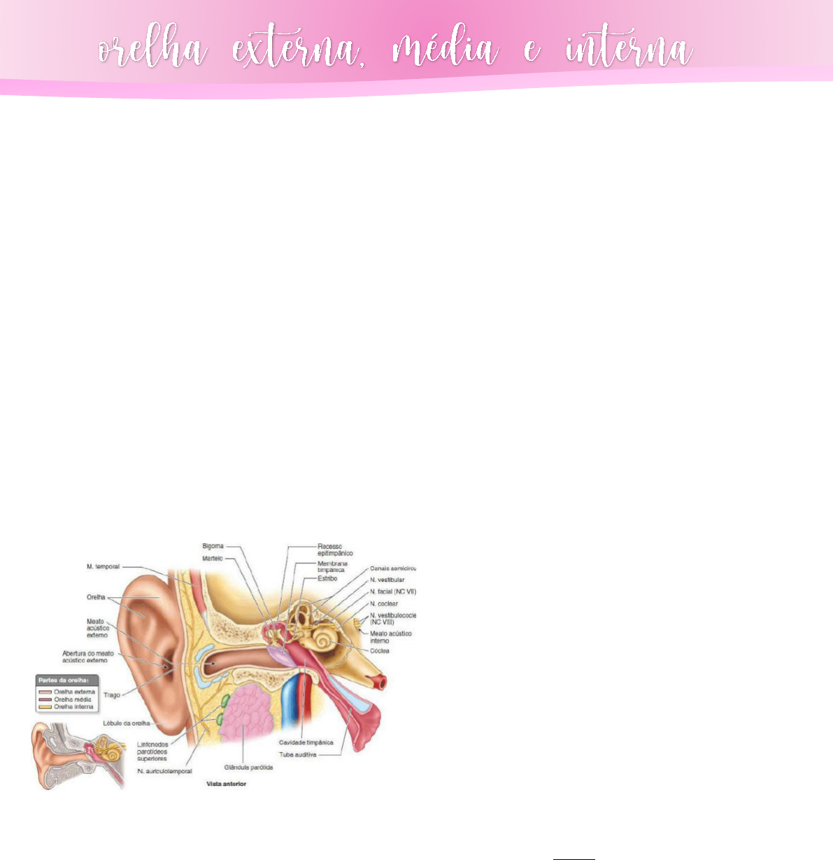 Por @med_rabiscos Referência literária: NETTER e MOORE Dividida em 3 porções: orelha externa, média e interna Orelha externa • Do pavilhão auricular até a membrana do tímpano • Orelha propriamente dita (pavilhão auricular) e meato acústico externo • Inflamação nessa porção: otite Orelha média • Pequena cavidade cheia de ar, dentro do osso temporal • Cavidade pequena que se comunica com nasofaringe • Cavidade timpânica – cavidade da tuba auditiva • Contém a membrana do tímpano • Inflamação: otite Orelha interna • Totalmente dentro do osso temporal (parte petrosa) • Contém o órgão vestibulococlear (mergulhados na endolinfa) • Labirinto membranáceo: contém endolinfa • Labirinto ósseo: contém perilinfa • Meato acústico interno: onde entra o nervo vestibulococlear • Inflamação: labirintite ORELHA (PAVILHÃO AURICULAR) • Molde de cartilagem elástica – coberto por pele • Lóbulo (sem cartilagem; tecido adiposo e pele) • Hélice: margem mais externa • Anti-hélice • Concha • Fossa triangular • Trago • Anti-trago • Inervação sensitiva: - n. auriculotemporal: supre da parte anterior da orelha ao meato acústico externo, penetrando em direção à orelha - n. auricular magno: supre o <dorso da orelha= e a parte posterior da face lateral da orelha - - nervo occipital menor: parte posterior da orelha Meato acústica externo • Capta a onda sonora até a membrana do tímpano • 2/3 medial ósseo • 1/3 lateral cartilaginoso • Curvo, estreito, angulado • Glândulas ceruminosas e sebáceas • Membrana timpânica (limite) ORELHA MÉDIA (OU CAVIDADE TIMPÂNICA) • Membrana do tímpano: fina, oval e semitransparente; separa o meato acústico externo e a cavidade timpânica • Ossículos - martelo; malleus (em contato com a membrana timpânica) - bigorna; incus (em contato com martelo e estribo) - estribo; stape (em contato com a perilinfa) • Articulação incudomalear: martelo e bigorna • Articulação incudoestapedial: bigorna e estribo • M. estapédio: sai da parede posterior da orelha média e insere no estribo – eminência piramidal óssea • M. tensor do tímpano: insere no cabo do martelo • Estapédio e tensor do tímpano protegem contra a vibração excessiva da membrana timpânica • Tuba auditiva: comunicação com a nasofaringe; igualar pressões; o ar entra pela tuba auditiva e ocupa a orelha média, o que ajuda a controlar a pressão, mantendo igual na membrana do tímpano dos dois lados • Músculo tensor do véu palatino e levantador do véu palatino: abrem a tuba Paredes da cavidade timpânica • Parede tegmental (sup) • Parede jugular (inf) • Carótida (ant) • Mastoidea (post) • Membranácea (lat) • Labiríntica (med) ORELHA INTERNA (LABIRINTO) Labirinto ósseo • Repleto de perilinfa, circundado pela cápsula óptica da parte petrosa do osso temporal • Cóclea: <caracol= – audição • Vestíbulo: parte intermediária dilatada – equilíbrio • Canais semicirculares (3): se implantam no vestíbulo através de uma dilatação nos canais denominada ampola óssea – equilíbrio também • Janela vestibular e janela coclear são fechadas por fina membrana; onda entra pela vestibular e é dissipada pela coclear • Labirintite: causada pela alta vascularização das células ciliadas (maioria das vezes – idosos) e pelo estresse (jovens) Por @med_rabiscos Referência literária: NETTER e MOORE Labirinto membranáceo • Sacos e ductos comunicantes que estão suspensos no labirinto ósseo • Contem endolinfa • Ducto coclear (labirinto coclear) - lâmina ou membrana basilar e vestibular - órgão espiral - membrana tectória: gelatinosa • Sáculo: mácula sacular (área especializada do epitélio sensitivo) • Utrículo: mácula utricular • Sáculo e utrículo possuem células pilosas que são receptoras cujos cílios se movimentam de acordo com a movimentação da endolinfa • Ductos semicirculares: ampola (crista ampular – células pilosas) • Canais semicirculares: anterior, lateral, posterior • Vestíbulo: janela oval onde encaixa parte do estribo • Cóclea • Rampa vestibular e rampa timpânica • Possui um eixo ósseo (modíolo) e ao redor há lâmina espiral óssea • Janela coclear • Membrana secundária do tímpano: fecha a janela coclear • Perilinfa: dentro das rampas, do vestíbulo e dos canais semicirculares • Endolinfa: ducto coclear – movimenta células ciliadas • Aqueduto do vestíbulo • Aqueduto da cóclea Vascularização da orelha interna: artéria labiríntica