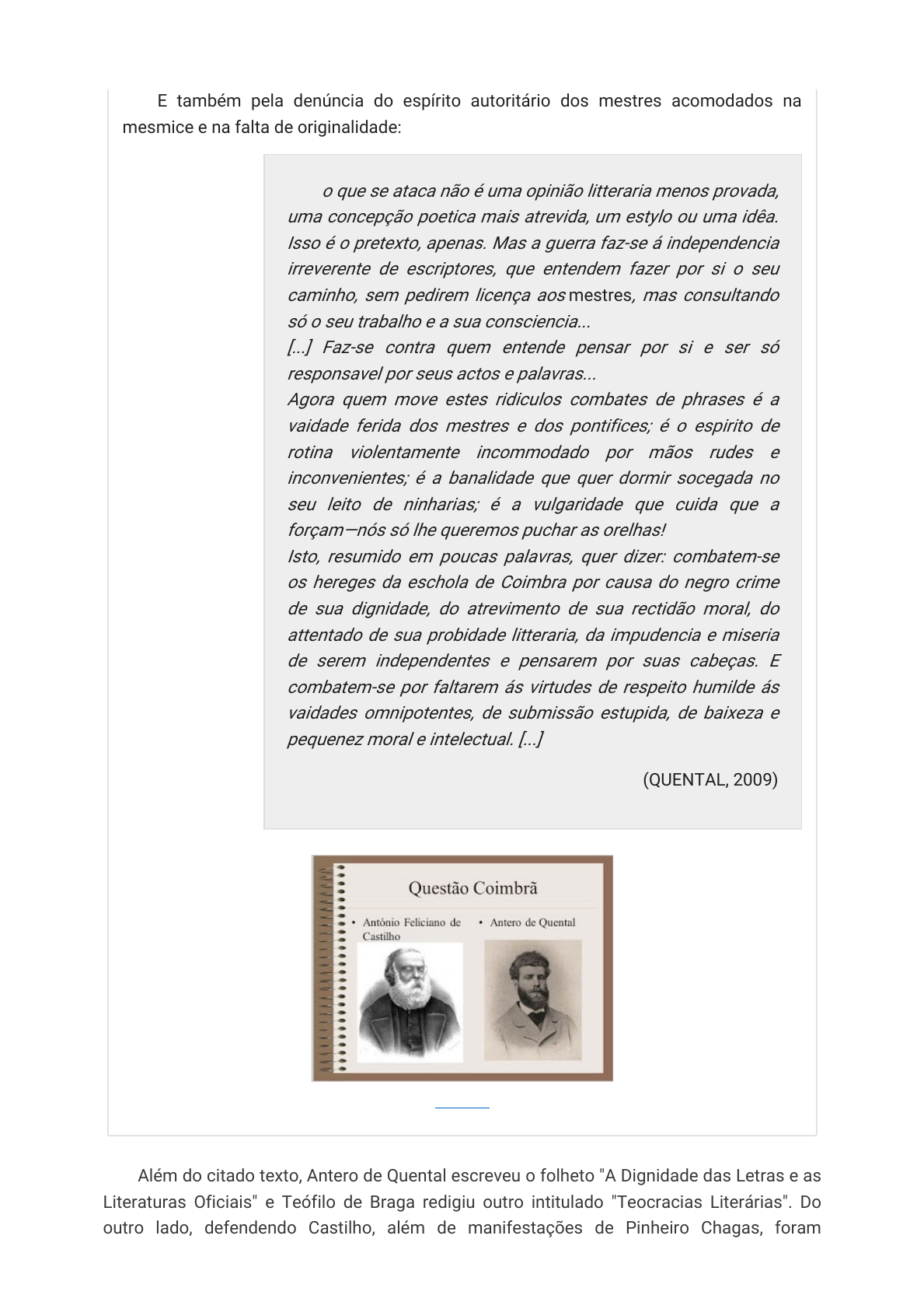 E também pela denúncia do espírito autoritário dos mestres acomodados na mesmice e na falta de originalidade: o que se ataca não é uma opinião litteraria menos provada, uma concepção poetica mais atrevida, um estylo ou uma idêa. Isso é o pretexto, apenas. Mas a guerra faz-se á independencia irreverente de escriptores, que entendem fazer por si o seu caminho, sem pedirem licença aos mestres, mas consultando só o seu trabalho e a sua consciencia... [...] Faz-se contra quem entende pensar por si e ser só responsavel por seus actos e palavras... Agora quem move estes ridiculos combates de phrases é a vaidade ferida dos mestres e dos pontifices; é o espirito de rotina violentamente incommodado por mãos rudes e inconvenientes; é a banalidade que quer dormir socegada no seu leito de ninharias; é a vulgaridade que cuida que a forçam—nós só lhe queremos puchar as orelhas! Isto, resumido em poucas palavras, quer dizer: combatem-se os hereges da eschola de Coimbra por causa do negro crime de sua dignidade, do atrevimento de sua rectidão moral, do attentado de sua probidade litteraria, da impudencia e miseria de serem independentes e pensarem por suas cabeças. E combatem-se por faltarem ás virtudes de respeito humilde ás vaidades omnipotentes, de submissão estupida, de baixeza e pequenez moral e intelectual. [...] (QUENTAL, 2009) Fonte [3] Além do citado texto, Antero de Quental escreveu o folheto "A Dignidade das Letras e as Literaturas Oficiais" e Teófilo de Braga redigiu outro intitulado "Teocracias Literárias". Do outro lado, defendendo Castilho, além de manifestações de Pinheiro Chagas, foram 81