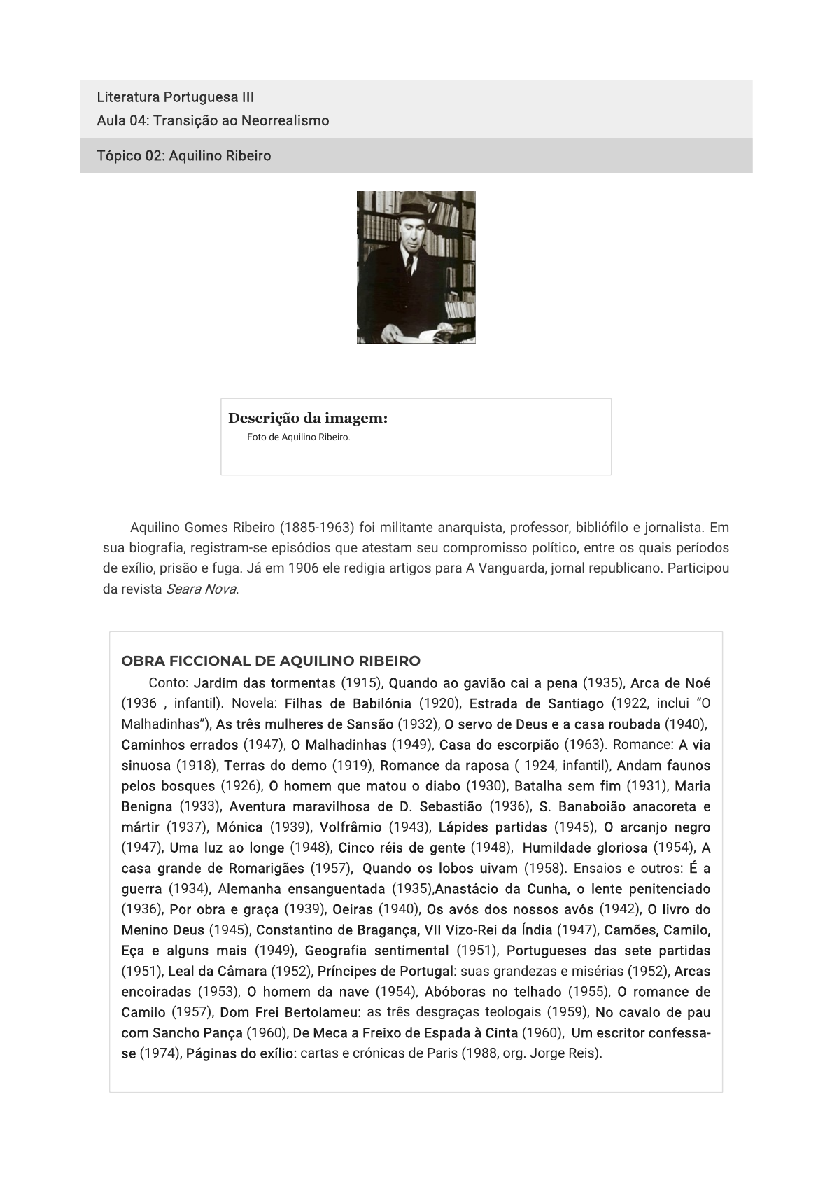 Literatura Portuguesa III Aula 04: Transição ao Neorrealismo Tópico 02: Aquilino Ribeiro Descrição da imagem: Foto de Aquilino Ribeiro. Aquilino Ribeiro [3] Aquilino Gomes Ribeiro (1885-1963) foi militante anarquista, professor, bibliófilo e jornalista. Em sua biografia, registram-se episódios que atestam seu compromisso político, entre os quais períodos de exílio, prisão e fuga. Já em 1906 ele redigia artigos para A Vanguarda, jornal republicano. Participou da revista Seara Nova. OBRA FICCIONAL DE AQUILINO RIBEIRO Conto: Jardim das tormentas (1915), Quando ao gavião cai a pena (1935), Arca de Noé (1936 , infantil). Novela: Filhas de Babilónia (1920), Estrada de Santiago (1922, inclui “O Malhadinhas”), As três mulheres de Sansão (1932), O servo de Deus e a casa roubada (1940), Caminhos errados (1947), O Malhadinhas (1949), Casa do escorpião (1963). Romance: A via sinuosa (1918), Terras do demo (1919), Romance da raposa ( 1924, infantil), Andam faunos pelos bosques (1926), O homem que matou o diabo (1930), Batalha sem fim (1931), Maria Benigna (1933), Aventura maravilhosa de D. Sebastião (1936), S. Banaboião anacoreta e mártir (1937), Mónica (1939), Volfrâmio (1943), Lápides partidas (1945), O arcanjo negro (1947), Uma luz ao longe (1948), Cinco réis de gente (1948), Humildade gloriosa (1954), A casa grande de Romarigães (1957), Quando os lobos uivam (1958). Ensaios e outros: É a guerra (1934), Alemanha ensanguentada (1935),Anastácio da Cunha, o lente penitenciado (1936), Por obra e graça (1939), Oeiras (1940), Os avós dos nossos avós (1942), O livro do Menino Deus (1945), Constantino de Bragança, VII Vizo-Rei da Índia (1947), Camões, Camilo, Eça e alguns mais (1949), Geografia sentimental (1951), Portugueses das sete partidas (1951), Leal da Câmara (1952), Príncipes de Portugal: suas grandezas e misérias (1952), Arcas encoiradas (1953), O homem da nave (1954), Abóboras no telhado (1955), O romance de Camilo (1957), Dom Frei Bertolameu: as três desgraças teologais (1959), No cavalo de pau com Sancho Pança (1960), De Meca a Freixo de Espada à Cinta (1960), Um escritor confessa- se (1974), Páginas do exílio: cartas e crónicas de Paris (1988, org. Jorge Reis). 79