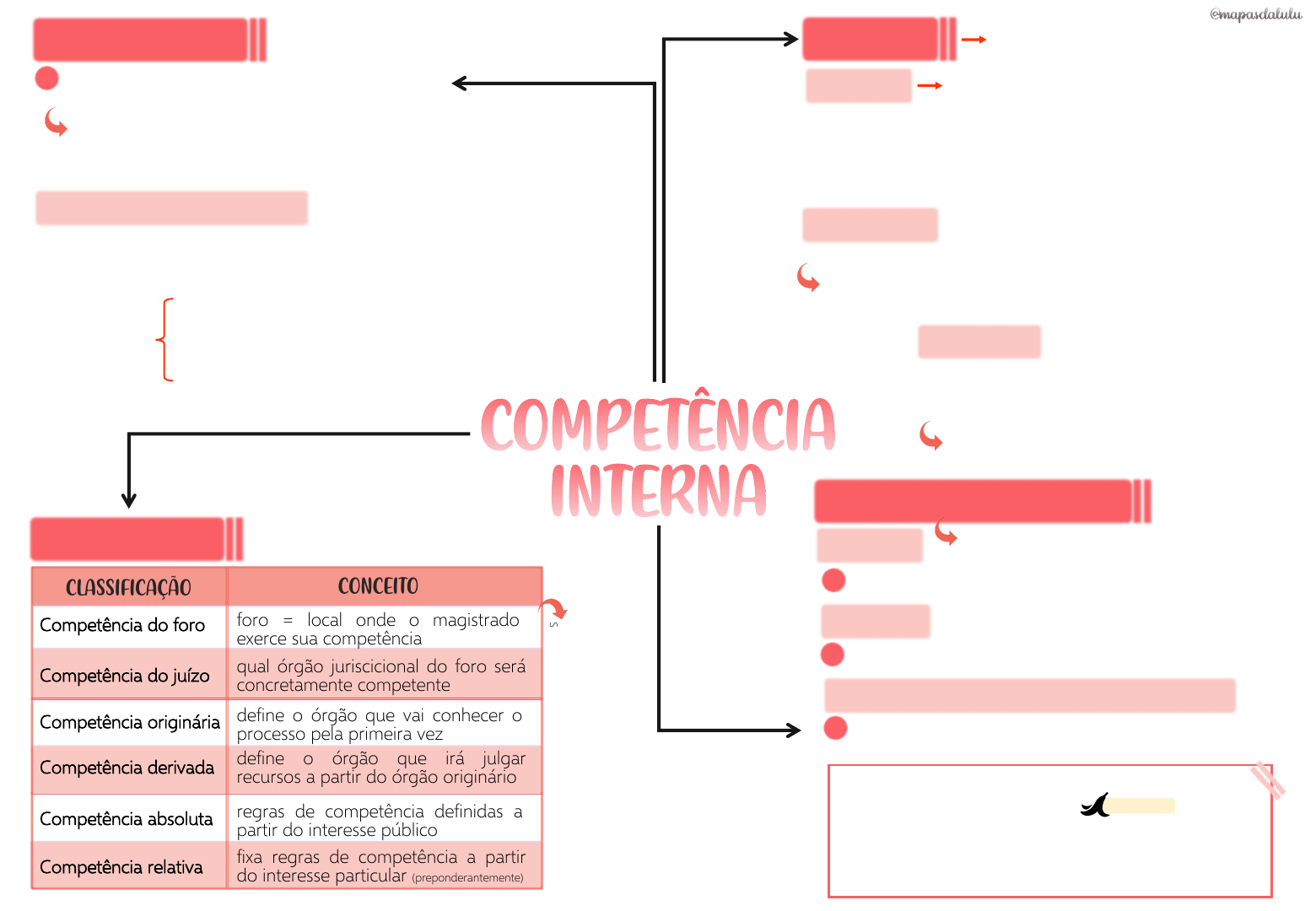 competência interna OBJETIVO ASPECTOS GERAIS CLASSIFICAÇÕES CRITÉRIOS TERRITORIAL FUNCIONAL capacidade de exercer a jurisdição no caso concreto • • • = CONCEITOCLASSIFICAÇÃO Competência do foro Competência originária Competência absoluta Competência do juízo Competência derivada Competência relativa foro = local onde o magistrado exerce sua competência define o órgão que irá julgar recursos a partir do órgão originário qual órgão juriscicional do foro será concretamente competente define o órgão que vai conhecer o processo pela primeira vez regras de competência definidas a partir do interesse público fixa regras de competência a partir do interesse particular (preponderantemente) finalidade = organizar o sistema jurídico todos os magistrados têm jurisdição, mas só um será competente no caso FIXAÇÃO DA COMPETÊNCIA • regra = com o registro/distribuição •exceções = supressão do órgão judiciário alteração da competência absoluta regras de modificação de competênci estabelecem um sistema de identificação da competência •em razão da matéria = considera a causa de pedir •em razão da pessoa = considera a parte •em razão do valor = considera o pedido considera a demanda apresentada (elementos da ação) • busca definir o foro competente. leva em consideração o interesse das partes (hipótese relativa de competência) • considera os aspectos internos do processo (observada a distribuição das funções que devem ser nele exercidas) Ex.: Competência originária e recursal, fase do processo, assunção de competência, ... CONFLITO DE COMPETÊNCIA POSITIVO NEGATIVO dois ou mais juízes se reputam competentes.= dois ou mais juízes se reputam incompetentes.= Não há conflito se houver diferença hierárquica entre os juízes. O julgamento do conflito é feito pela autoridade judiciária superior e comum aos juízos conflitantes PEGADINHA! CONTROVÉRSIA DE UNIÃO OU SEPARAÇÃO entre dois ou mais juízes há controvérsia sobre reunião ou separação de processos. = (tribunal) deve ser suscitado pelo juiz que discordar do anterior (salvo se remeter a um terceiro) (observadas as normas constitucionais, legais e regimentais pertinentes) c o m a rc a (Ju s tiç a E s ta d u a l) s u b s e ç ã o / s e ç ã o ju d ic iá ria (Ju s tiç a F e d e ra l) • • REGRA GERAL competência interna SITUAÇÕES ESPECÍFICAS PARTICULARIDADES(ART. 53, CPC) SITUAÇÃO FORO Divórcio, separação, anulação de casamento, reconhecimento ou dissolução de união estável Reparação de danos Ação de alimentos Réu administrador/gestor de negócios alheios Obrigações da P.J. domicílio do guardião do filho incapaz último domicílio do casal domicílio do réu domicílio da vítima de violência doméstica ou familiar domicílio/residência do alimentado lugar do ato ou fato lugar onde está a sede lugar do ato ou fato Reparação de danos em delito/acidente de veículos domicílio do autor ou do local do fato lugar onde está a agência ou sucursal lugar onde exerce suas atividades lugar onde a obrigação deve ser satisfeita lugar de residência do idoso lugar da sede da serventia notarial ou de registro Causa sobre direito do estatuto do idoso Ação em que for ré pessoa jurídica Ação em que for ré sociedade/associação sem personalidade jurídica Ação que exigir seu cumprimento Ação de reparação de dano por ato praticado em razão do ofício as ações serão ajuizadas no foro de domicílio do réu.= é competente o foro de situação da coisa. se houver mais de um: em qualquer um deles se dois ou mais réus com domicílios diferentes, o autor escolhe qualquer um deles. DECORE! DECORE! DIREITO REAL SOBRE IMÓVEIS SUCESSÃO CAUSA MORTIS AÇÕES COM RÉU AUSENTE AÇÕES EM QUE A UNIÃO É PARTE AÇÕES EM QUE ESTADO/DF É PARTE CONTRA A FAZENDA PÚBLICA MUNICIPAL o autor pode optar pelo foro de domicílio do réu ou de eleição (se não for sobre direito de propriedade, vizinhança, servidão, divisão e demarcação de terras e de nunciação de obra nova) ação possessória imobiliária: no foro de situação da coisa (juízo tem competência absoluta) • em regra, é competente o foro de domicílio do falecido. se não tiver, será o local da situação dos imóveis (se mais de uma localidade, o autor pode escolher) se não tiver domicílio nem imóveis, será em qualquer lugar dos bens móveis do espólio. • serão propostas no foro de seu último domicílio. • ajuizadas pela União domicílio do réu ajuizadas contra a União • não há regra específica (aplica-se a regra geral do CPC) PEGADINHA! o local do óbito não tem nenhuma relevância! também competente para arrecadação, inventário, partilha e cumprimento do testamento. • domicílio do autor local do ato ou fato foro de situação da coisa DF ou capital do estado• • • • • ajuizadas pelos estados domicílio do réu ajuizadas contra os estados• foro de situação da coisa capital do estado• • • domicílio do autor local do ato ou fato TERRITORIAL= = (se não houver filho incapaz) (se nenhum residir no antigo) Ação em que o incapaz for reu no foro de domicílio de seu representante ou assistente. IDENTIFICAÇÃO DO JUÍZO COMPETENTE • competência internaVerificar se a justiça brasileira é competente Se não, verificar se é afeto a Justiça Especial (eleitoral, trabalhista ou militar) ou à Comum Verificar se há competência originária de Tribunal ou órgão atípico (ex.: Senado) Se for Comum, verificar se Federal ou Estadual (residual) Buscar o foro competente conforme critérios do CPC (competência material, funcional, territorial...) Verificar o juízo do foro que será competente (conforme regras complementares do CPC e organização judiciária) 1 2 3 4 5 6 INCOMPETÊNCIA ações ajuizadas violando as regras de competência.= pode ser absoluta (matéria, pessoa ou função) ou relativa (em regra: terri