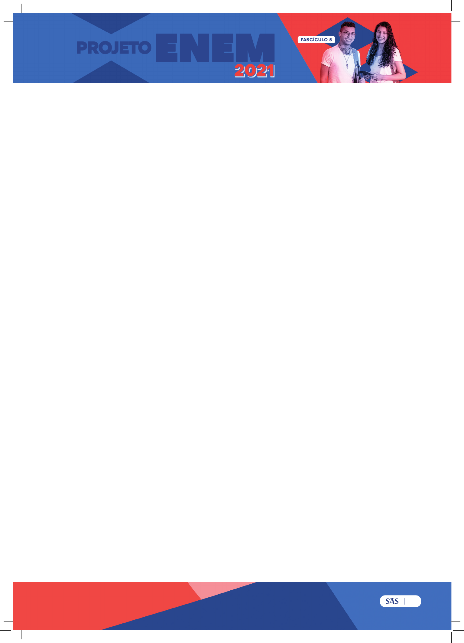 FASCÍCULO 5 PROJETOPROJETO 20212021 ENEMENEM 1 Linguagens, Códigos e suas Tecnologias Olá, estudante! Dando continuidade aos estudos da área de Linguagens, Códigos e suas Tecnologias, neste fascículo do Projeto ENEM, estudaremos os demais conteúdos que compõem o ranking do Raio X ENEM. Você encontrará questões que têm como temática análise de texto literário em prosa, assunto que já apare- ceu em 7% das questões das edições do ENEM de 2009 a 2020, e identificação de função em texto, presente em 6,1% dos itens. Bons estudos! 05_SAS_ENEM_2021.indd 105_SAS_ENEM_2021.indd 1 29/07/2021 12:13:1829/07/2021 12:13:18 PROJETO ENEM 2021PROJETO ENEM 2021FASCÍCULO 5 2 Questão 1 TEXTO I D iv ul ga çã o TEXTO II “Eu não quero ser lembrada apenas um dia. Eu quero que todos os dias nós indígenas sejamos lembrados como verda- deiros donos deste território. Não somos folclore. Não somos coisa do passado. Somos história viva. Uma história de luta, so- frimento e resistência”, afirmou Potyra Tê Tupinambá, indígena, advogada, mãe, mulher e diretora executiva da ONG Thydêwá. A realidade indígena do país não está fácil. Golpes são da- dos diariamente sobre os direitos desses povos tradicionais. A luta é constante para não se perder o território, a dignidade, a natureza preservada ao redor da terra onde se vive, o acesso à água, o acesso à tecnologia. MARTINS, Fernanda. Não somos folclore, não somos coisa do passado, somos presente vivo. Thydêwá. Disponível em: <http://www.thydewa.org>. Acesso em: 26 out. 2017. Os dois textos fazem referência à data em que se comemora o Dia do Índio no Brasil. Ao focalizar a temática indígena, esses textos buscam a) reivindicar o lugar do indígena como elemento essencial do folclore brasileiro, tendo em vista a importância do universo cultural desse povo para formação da identidade nacional. b) homenagear o índio na data que foi reservada oficial- mente para que a sociedade brasileira relembre a própria origem indígena e, assim, perca o preconceito contra o próprio passado. c) promover a figura do índio como elemento fundamental para o progresso tecnológico e econômico do país, o que resulta do total acesso à tecnologia que é concedido à po- pulação indígena. d) reconduzir o índio ao seu lugar apropriado na história do país, que corresponde ao período anterior à chegada dos portugueses, pois apenas como passado a cultura indígena adquire o seu real valor. e) desconstruir uma noção segundo a qual os índios, por se- rem historicamente associados às origens do Brasil, são vistos apenas como ancestrais, e não como parte impor- tante da população brasileira atual. Questão 2 D iv ul ga çã o Essa campanha pela doação de sangue volta-se para um pú- blico específico: as pessoas que não costumam ajudar outras sem obter com isso um retorno em benefício próprio. O recurso linguístico utilizado para atrair a atenção imediata desse público é o(a) a) verbo “doar” no imperativo afirmativo, exprimindo a impres- cindibilidade de uma ação nobre e recompensadora. b) verbo “ganhar” na terceira pessoa do imperativo e em letras garrafais, funcionando como um convite para se obter uma vantagem pessoal. c) expressão “dia de folga”, revelando o consenso da socieda- de, inclusive do setor empregatício, sobre a importância da prática da doação de sangue. d) expressão “quem só pensa em si”, manifestando uma crí- tica por meio da qual se pretende modificar essa postura indiferente diante dos problemas do outro. e) advérbio “até”, indicando que a doação de sangue deve ser praticada tanto por pessoas reconhecidamente solidárias como por aquelas que só pensam em si. Questão 3 Mas deve-se evitar esperar até a realização dessa expe- riência, que é inútil, ou, antes, prejudicial e perigosa: é triste, quando chega o momento de recorrer a seus amigos, perceber que não são amigos e que não é possível trocar um coração desonesto e pusilânime por um coração sincero e constante. Ora, o amigo é como peças de moeda: é preciso pô-lo à prova antes de recorrer a ele, e não esperar que seja esse recurso que nos desiluda. PLUTARCO. Como distinguir o amigo do bajulador. São Paulo: WMF Martins Fontes, 2011. p. 8-9. O texto filosófico discorre sobre as diferenças entre um amigo verdadeiro e aquele que é apenas um bajulador. Com base na argumentação do texto, pode-se afirmar que nele há predomí- nio da função a) conativa. b) emotiva. c) fática. d) metalinguística. e) poética. 05_SAS_ENEM_2021.indd 205_SAS_ENEM_2021.indd 2 29/07/2021 12:13:1929/07/2021 12:13:19 PROJETO ENEM 2021PROJETO ENEM 2021 FASCÍCULO 5 3 Questão 4 Texto I Hoje acordei decidido a mudar [...] Falar pra aquela mina lá, que eu sempre quis Dizer que eu gosto dela, vai saber o que ela diz Dar um rolê no shopping só pra ver o tanto de coisa que existe E que eu não preciso para ser feliz [...] Sociedade e os padrões que ainda insiste Que a felicidade se consiste Em ser o que tem, porém fato triste [...] Desviam seus olhares pelo ouro, prata Os que não tem dinheiro veste só “bagui” pirata É chapa, a forte no estilo alma fraca E esse consumismo sem freio é quem nos mata Trecho de “Ser feliz”, do rapper Rael da Rima. Texto II Da sorte que vive o rico Entre o fausto alegremente, Vive o guardador do gado Apoucado, Mas contente. Beije pois torpe avarento As arcas de barras cheias: Eu não beijo os vis tesouros, Beijo as douradas cadeias, Beijo as setas, beijo as armas Com que o cego Amor venceu: Bens, que valem sobre a terra, E que têm valor no Céu. Trecho da “Lira XV”, do poeta Tomás Antônio Gonzaga. Embora escritos em períodos e circunstâncias históricas muito distintas, os textos I e II têm grandes semelhanças temáticas. A característica neoclássica dos versos de Gonzaga que apro- ximam sua poesia da crítica social da canção de Rael da Rima pode s