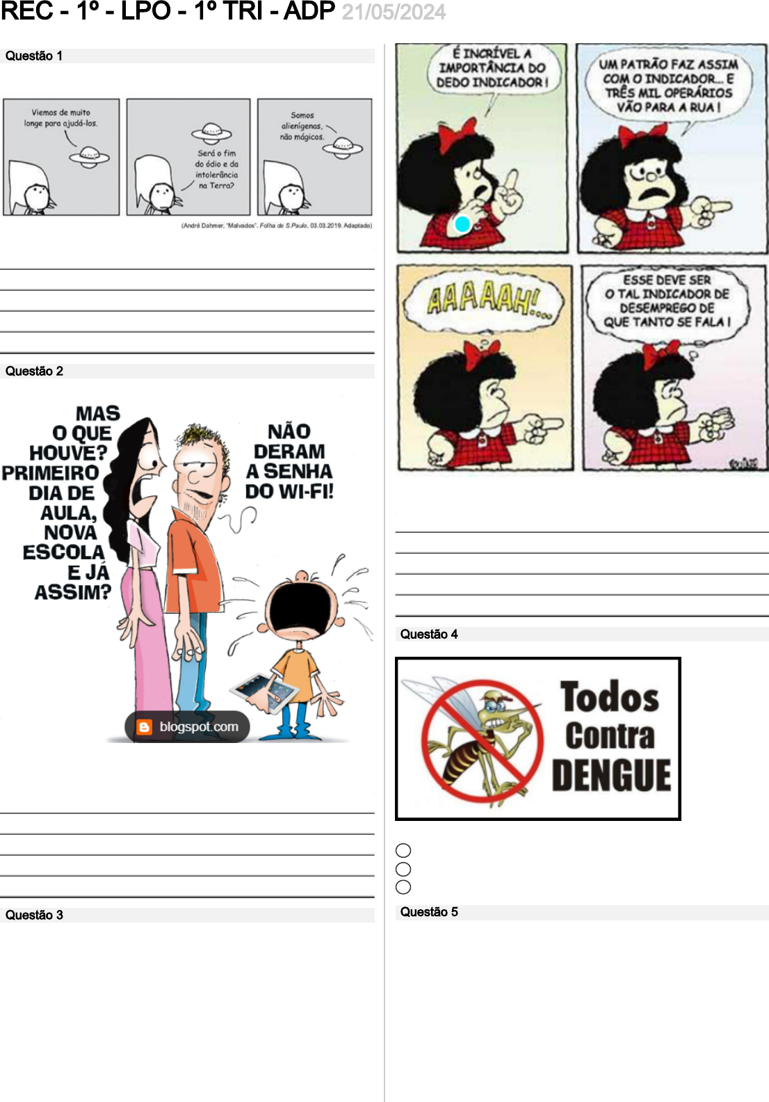 REC - 1º - LPO - 1º TRI - ADP 21/05/2024 Questão 1 LEIA A TIRINHA E RESPONDA: O QUE O ALIENÍGENA QUIS DIZER NO ÚLTIMO QUADRINHO? Questão 2 LEIA A CHARGE E RESPONDA. 2. NA SUA OPNIÃO, A INTERNET DE ALGUMA FORMA ESTÁ PREJUDICANDO? Questão 3 LEIA A TIRINHA DA MAFALDA E RESPONDA. A QUEM MAFALDA SE REFERE QUANDO FALA "PATRÃO" E "OPERÁRIOS"? Questão 4 LEIA O TEXTO O TEXTO ACIMA É UMA CONVOCAÇÃO PARA O COMBATE a AO CARRAPATO DOS CERVOS. b ÀS MOSCAS TSÉ-TSÉ. c AO MOSQUITO DA DENGUE. Questão 5 LEIA O TEXTO. a ACORDA COM VONTADE DE GRITAR. b SEU CANTO INCOMODA O ZEQUINHA. c SEU INSTINTO LHE DIZ QUE DEVE CANTAR.