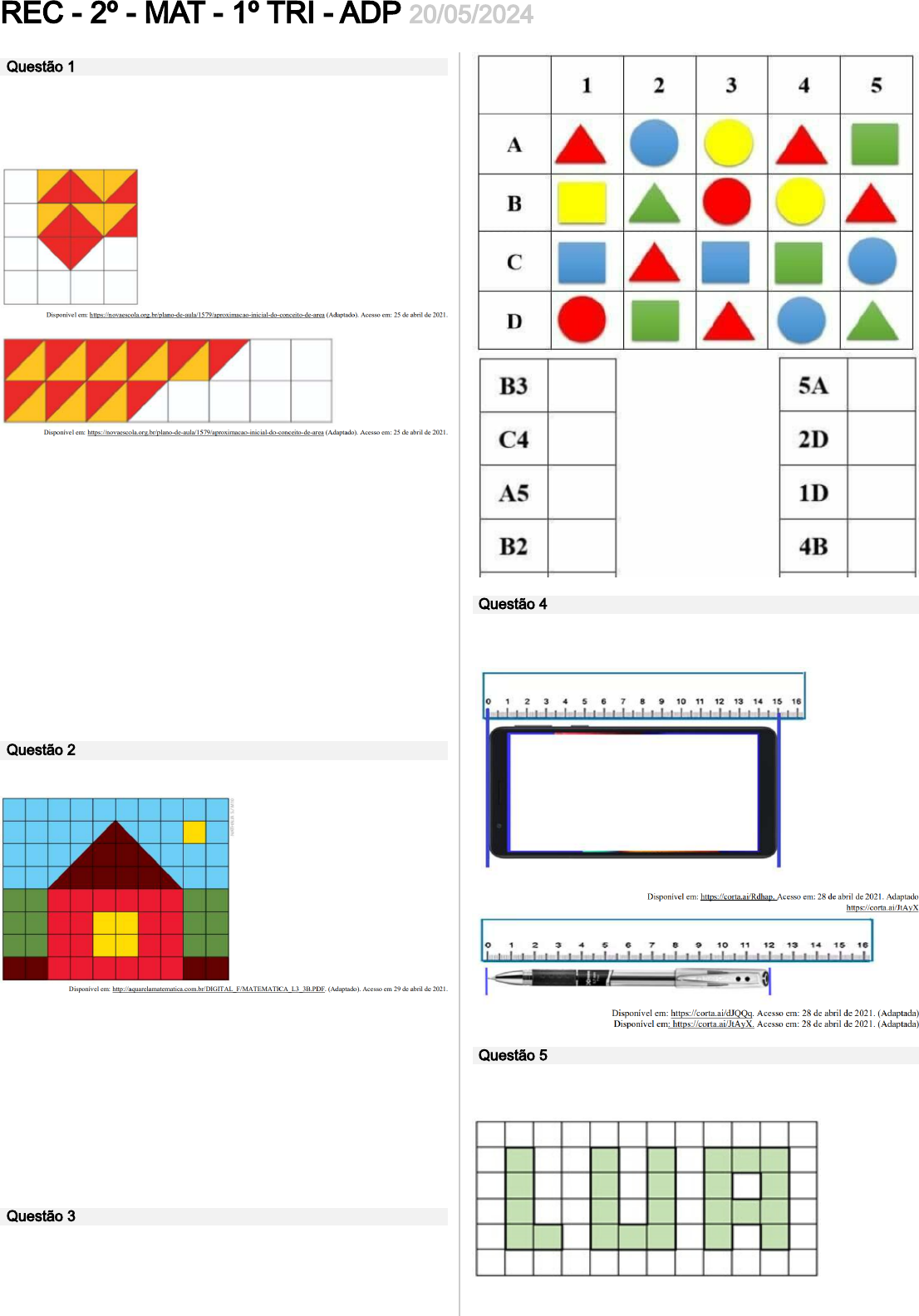 REC - 2º - MAT - 1º TRI - ADP 20/05/2024 Questão 1 MARIA E PEDRO ESTÃO MONTANDO MOSAICOS COM LADRILHOS TRIANGULARES NAS CORES AZUL E VERMELHO. PORÉM AS PEÇAS DE LADRILHOS DOS DOIS NÃO FORAM SUFICIENTES PARA TERMINAR SEUS MOSAICOS. OBSERVE: MOSAICO DE MARIA: MOSAICO DE PEDRO: RESPONDA: I) QUAL DOS DOIS MOSAICOS TEM A MAIOR ÁREA DESCOBERTA? __________________________________________________ ___________________________________ II) SE MARIA E PEDRO JUNTASSEM OS SEUS LADRILHOS SERIA POSSÍVEL COBRIR TODA A ÁREA E COMPLETAR UM DOS DOIS MOSAICOS? __________________________________________________ ___________________________________ III) O QUE OS MOSAICOS DE MARIA E PEDRO TÊM EM COMUM? __________________________________________________ ___________________________________ Questão 2 UM ARTISTA PLÁSTICO REALIZOU A DECORAÇÃO A SEGUIR PINTANDO OS AZULEJOS DE UMA PAREDE. RESPONDA: I) QUAL DAS ÁREAS PINTADAS É MAIOR: A VERMELHA OU A VERDE? QUANTOS AZULEJOS TEM A MAIS A MAIOR DESTAS ÁREAS? __________________________________________________ ___________________________________ II) A ÁREA PINTADA EM MARROM É QUANTAS UNIDADES MENOR QUE A ÁREA PINTADA EM AZUL CLARO? __________________________________________________ ___________________________________ Questão 3 COLOQUE QUAL FIGURA VOCÊ ENCONTRA EM CADA LOCALIZAÇÃO ABAIXO: Questão 4 NAS FIGURAS A SEGUIR, DETERMINE AS MEDIDAS DA ALTURA DO CELULAR E DO COMPRIMENTO DA CANETA EM CENTÍMETROS. Questão 5 LUA GANHOU DE PRESENTE DE ANIVERSÁRIO UMA TOALHA BORDADA COM SEU NOME, COMO MOSTRA A IMAGEM ABAIXO: A ÁREA DO NOME DE LUA NESTA TOALHA É DE: a 15 QUADRADINHOS. b 20 QUADRADINHOS. c 24 QUADRADINHOS. d 30 QUADRADINHOS. e 35 QUADRADINHOS. Questão 6 ENCONTRE EM CM², A ÁREA DAS SEGUINTES FIGURAS (CADA QUADRADINHO EQUIVALE A 1 CM DE LADO): A=___________ B=___________ C=___________ D=___________ E=___________