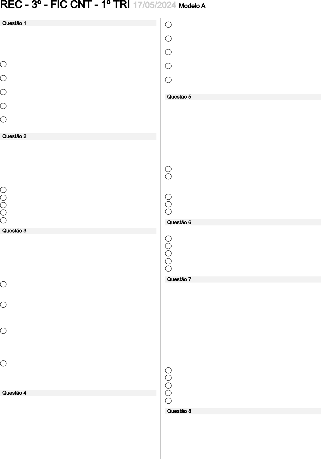 REC - 3º - FIC CNT - 1º TRI 17/05/2024 Modelo A Questão 1 Os avanços na medicina não só permitem uma maior expectativa de vida, mas também uma melhor qualidade de vida. Um exemplo disso é o desenvolvimento de medicamentos para tratar doenças crônicas. Como o desenvolvimento de medicamentos impactou a expectativa de vida? a O desenvolvimento de medicamentos diminuiu a expectativa de vida. b O desenvolvimento de medicamentos não teve impacto na expectativa de vida. c O desenvolvimento de medicamentos aumentou a expectativa de vida ao permitir o controle de doenças. d O desenvolvimento de medicamentos aumentou a expectativa de vida ao causar mais doenças. e O desenvolvimento de medicamentos diminuiu a expectativa de vida ao causar mais doenças. Questão 2 Uma pesquisa conduzida por um grupo de pessoas na região da Amazônia, revelou que a sabedoria etnobotânica das comunidades indígenas não só fornece remédios naturais, mas também contribui para a conservação da biodiversidade. Qual é o termo usado para descrever o conhecimento tradicional sobre o uso medicinal das plantas, passado de geração em geração dentro de uma comunidade específica? a Botânica Sistemática b Etnobotânica c Fitoterapia d Horticultura e Fármacos Questão 3 A automedicação é uma escolha de grande risco à saúde do indivíduo. O Ato pode prejudicar o processo de cura ou gerar outras complicações ou gerar outras complicações mais graves. Diante desse fato, avalie a escolha da automedicação, mesmo sabendo dos riscos. Sobre a automedicação e a facilidade na obtenção do fármaco e a dificuldade de acesso aos serviços de saúde assinale a alternativa correta abaixo. a Em muitos países há muita dificuldade no acesso aos serviços de saúde. E o acesso a fármacos também é bastante restrito, o que dificulta a automedicação. b A facilidade de em se obter o fármaco é algo comum na sociedade, e fazer uso de fármacos sem a prescrição médica é segura, sem chances de causar mais danos à saúde. Por isso a automedicação é uma prática tão comum. c A facilidade de em se obter o fármaco é algo comum na sociedade, porém é um comportamento arriscado que pode gerar problemas futuros. A dificuldade de acesso aos serviços de saúde é muito comum em vários países, o que incentiva a prática da automedicação. d Para se ter o acesso a fármacos é necessário que haja prescrição médica, sendo assim, a automedicação não ocorre, ou seja, as pessoas não conseguem remédios sem que um médico tenha receitado. Questão 4 Um estudo recente realizado por biólogos e químicos da Universidade Nacional da Colômbia investigou a utilização de plantas medicinais por comunidades indígenas na região amazônica. Eles descobriram que várias espécies de plantas são usadas no tratamento de doenças comuns, como malária e febre. Com base nisso, considere a seguinte pergunta: Qual das seguintes afirmações melhor descreve o papel das plantas medicinais nas comunidades indígenas da Amazônia, de acordo com o estudo mencionado? a As plantas medicinais são utilizadas exclusivamente para fins espirituais. b O conhecimento sobre as plantas medicinais na região é totalmente baseado em práticas científicas modernas. c As plantas medicinais são apenas uma pequena parte das práticas de cura das comunidades indígenas. d A utilização de plantas medicinais é uma tradição enraizada nas práticas culturais e na medicina das comunidades indígenas. e As plantas medicinais são utilizadas principalmente para a fabricação de produtos de beleza. Questão 5 Um levantamento realizado por antropólogos (realiza estudos e pesquisas sociais, econômicas e políticas sobre o homem e a humanidade e organiza informações para elaboração de documentos técnico-científicos) na África Subsaariana revelou que comunidades rurais dependem fortemente do conhecimento etnobotânico para suas necessidades diárias. Desde alimentos até remédios, as plantas desempenham um papel crucial em suas vidas. Com base nisso, qual das seguintes opções melhor representa uma consequência da perda do conhecimento etnobotânico em comunidades rurais da África Subsaariana? a Aumento da dependência de tecnologias modernas. b Diminuição da diversidade de espécies vegetais na região. c Redução da resistência a doenças nas comunidades. d Aumento da migração para áreas urbanas. e Maior disponibilidade de alimentos industrializados. Questão 6 Qual das seguintes opções é uma fonte de fármacos? a Plantas b Água c Ar d Solo e Luz Solar Questão 7 A biofísica é um ramo interdisciplinar da ciência que combina os princípios da física e da biologia para estudar os fenômenos biológicos em nível molecular, celular e sistêmico. Seu objetivo é compreender os processos fundamentais que ocorrem nos sistemas vivos, desde a estrutura e dinâmica das biomoléculas até o funcionamento de órgãos e sistemas completos. A biofísica desempenha um papel crucial em diversas áreas, incluindo biomedicina, bioengenharia, farmacologia e biotecnologia, contribuindo para avanços significativos no entendimento e tratamento de doenças, no desenvolvimento de novas terapias e na criação de tecnologias inovadoras para o campo da saúde. Com base no texto, assinale a alternativa correta que diz respeito as ferramentas utilizadas na área da saúde envolvendo a biofísica a Óptica b Microscopia eletrônica c Espectroscopia por ressonância magnética nuclear (RMN) d Cristalografia de raios X e Todas as alternativas estão corretas Questão 8 Os antigos povos egípcios tinham suas crenças e seus rituais, sendo que um desses rituais muito conhecidos e que despertam interesse das pessoas era a mumificação. A mumificação consiste em uma série de etapas de preparação do corpo; em uma dessas etapas, havia a reposição de alguma parte faltante do cadáver. Isso era importante para eles, pois acreditava