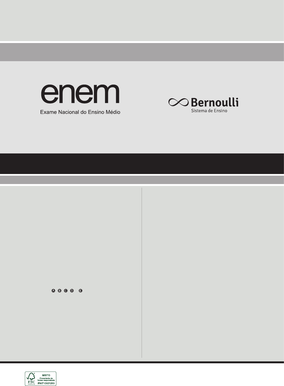 PROVA DE CIÊNCIAS DA NATUREZA E SUAS TECNOLOGIAS PROVA DE MATEMÁTICA E SUAS TECNOLOGIAS 1 Este CADERNO DE QUESTÕES contém 90 questões numeradas de 91 a 180, dispostas da seguinte maneira: a. as questões de número 91 a 135 são relativas à área de Ciências da Natureza e suas Tecnologias; b. as questões de número 136 a 180 são relativas à área de Matemática e suas Tecnologias. 2 Confira se o seu CADERNO DE QUESTÕES contém a quantidade de questões e se essas questões estão na ordem mencionada na instrução anterior. Caso o caderno esteja incompleto, tenha qualquer defeito ou apresente divergência, comunique ao aplicador da sala para que ele tome as providências cabíveis. 3 Escreva e assine seu nome nos espaços próprios do CARTÃO-RESPOSTA com caneta esferográfica de tinta preta. 4 Não dobre, não amasse nem rasure o CARTÃO-RESPOSTA, pois ele não poderá ser substituído. 5 Para cada uma das questões objetivas, são apresentadas 5 opções identificadas com as letras , , , e . Apenas uma responde corretamente à questão. 6 Use o código presente nesta capa para preencher o campo correspondente no CARTÃO-RESPOSTA. 7 Com seu RA (Registro Acadêmico), preencha o campo correspondente ao código do aluno. Se o seu RA não apresentar 7 dígitos, preencha os primeiros espaços e deixe os demais em branco. 8 No CARTÃO-RESPOSTA, preencha todo o espaço destinado à opção escolhida para a resposta. A marcação em mais de uma opção anula a questão, mesmo que uma das respostas esteja correta. 9 O tempo disponível para estas provas é de cinco horas. 10 Reserve os 30 minutos finais para marcar seu CARTÃO-RESPOSTA. Os rascunhos e as marcações assinaladas no CADERNO DE QUESTÕES não serão considerados na avaliação. 11 Quando terminar as provas, acene para chamar o aplicador e entregue este CADERNO DE QUESTÕES e o CARTÃO-RESPOSTA. 12 Você poderá deixar o local de prova somente após decorridas duas horas do início da aplicação e poderá levar seu CADERNO DE QUESTÕES ao deixar em definitivo a sala de provas nos últimos 30 minutos que antecedem o término das provas. 13 Você será excluído do Exame, a qualquer tempo, no caso de: a. prestar, em qualquer documento, declaração falsa ou inexata; b. agir com incorreção ou descortesia para com qualquer participante ou pessoa envolvida no processo de aplicação das provas; c. perturbar, de qualquer modo, a ordem no local de aplicação das provas, incorrendo em comportamento indevido durante a realização do Exame; d. se comunicar, durante as provas, com outro participante verbalmente, por escrito ou por qualquer outra forma; e. portar qualquer tipo de equipamento eletrônico e de comunicação durante a realização do Exame; f. utilizar ou tentar utilizar meio fraudulento, em benefício próprio ou de terceiros, em qualquer etapa do Exame; g. utilizar livros, notas ou impressos durante a realização do Exame; h. se ausentar da sala de provas levando consigo o CADERNO DE QUESTÕES antes do prazo estabelecido e / ou o CARTÃO-RESPOSTA a qualquer tempo. LEIA ATENTAMENTE AS INSTRUÇÕES SEGUINTES *de acordo com o horário de Brasília 2022 ESTA PROVA SOMENTE PODERÁ SER APLICADA A PARTIR DO DIA 24/09/2022, ÀS 13H00*. Simulado 7 – Prova II EXAME NACIONAL DO ENSINO MÉDIO CIÊNCIAS DA NATUREZA E SUAS TECNOLOGIAS Questões de 91 a 135 QUESTÃO 91 A tabela a seguir apresenta dados de ponto de ebulição e de fusão de alguns álcoois: Álcoois Ponto de ebulição / °C Ponto de fusão / °C Propan-1-ol (C3H7OH) 97,8 –127,00 Butan-2-ol (C4H9OH) 99,5 –114,70 Pentan-2-ol (C5H11OH) 119,0 –73,15 Hexan-3-ol (C6H13OH) 135,0 –57,00 Octan-4-ol (C8H17OH) 176,3 –40,70 A diferença entre os pontos de fusão e de ebulição dos álcoois listados se deve principalmente ao(à) A. intensidade da ligação covalente em cada uma das moléculas. B. diferença de solubilidade de cada um dos compostos em água. C. tamanho das cadeias carbônicas de cada uma das substâncias. D. alternância na posição da ramificação ao longo de cada estrutura. E. tipo de ligação interatômica realizada por cada um dos compostos. QUESTÃO 92 Pré-natal é essencial para o diagnóstico precoce de doenças raras Os procedimentos do pré-natal são essenciais para oferecer aos pais condições de enfrentar possíveis situações de doenças raras precocemente, o que, na maioria das vezes, garante melhor qualidade de vida à criança. Um dos exames disponíveis é o mapeamento do cariótipo fetal, que visa analisar os cromossomos do núcleo de uma célula a partir de uma amostra de células do feto. Disponível em: <https://agencia.fiocruz.br>. Acesso em: 10 ago. 2022 (Adaptação). Esse exame permite diagnosticar anomalias determinadas por alterações A. alélicas dominantes. B. genéticas poligênicas. C. autossômicas recessivas. D. cromossômicas numéricas. E. genéticas restritas ao sexo. QUESTÃO 93 O Solartaxi é mais um transporte movido a energia solar que foi capaz de dar a volta ao mundo. Ele consome 8 kWh/100 km. Em 2008, Louis Palmer, responsável pela criação do automóvel, deu a volta ao mundo com o carro. Para ele, além de viável e ecológico, o veículo solar é uma alternativa barata, que pode custar aproximadamente R$ 25 mil. Considere o preço de R$ 0,80 por kWh consumido e que uma pessoa percorre com o Solartaxi, em média, 20 km por dia. Disponível em: <http://ric.cps.sp.gov.br>. Acesso em: 8 ago. 2022 (Adaptação). Qual o valor anual economizado por uma pessoa que utiliza o veículo Solartaxi, aproximadamente? A. R$ 292 B. R$ 467 C. R$ 834 D. R$ 1 182 E. R$ 2 336 QUESTÃO 94 Em casos de alta miopia (grau alto), recomendam-se lentes com alto índice de refração. As lentes de índices de refração que existem são: 1.50, 1.59, 1.67, 1.74, 1.76, 1.8 e 1.9. Disponível em: <https://lenscope.com.br>. Acesso em: 9 ago. 2022. O índice de refração deve ser informado no certificado da lente do consumid