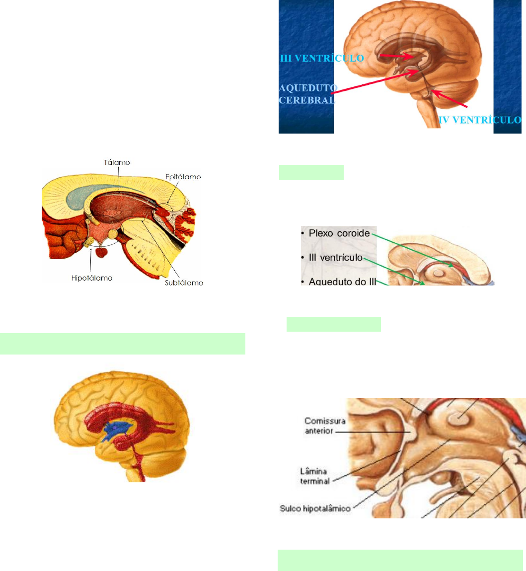 Camila Katerin Perondi, Caroline Canova e Wellison Felipe Correia Monitoria de Anatomia Sistêmica 2022/01 – Medicina - Unoesc Diencéfalo Diencéfalo + Telencéfalo = Cérebro Dividido pelo III ventrículo (mecanismo hidráulico do cérebro) Estrutura ímpar e mediana Estruturas: Tálamo; Hipotálamo; Epitálamo; Subtálamo; Metatálamo; Obs.: Todas as partes do diencéfalo têm relação com o III ventrículo. III Ventrículo A parede posterior do III ventrículo é formada pelo epitálamo; O teto por fibras nervosas, onde se insere a tela coroide; O assoalho pelas estruturas do hipotálamo; A parede anterior pela lâmina terminal e a comissura anterior- pertencentes ao telencéfalo. PLEXO CORÓIDE: Pia-máter especializada com vasos Responsável pela produção de líquor que é transportado através dos Ventrículos. SULCO HIPOTALAMICO: se estende do aqueduto cerebral até o forame interventricular (de Monro). As porções da parede situadas acima deste sulco pertencem ao tálamo e as situadas abaixo, ao hipotálamo. Tálamo Duas massas ovóides de substância cinzenta, na porção látero-dorsal do diencéfalo; Corresponde a 80% do diencéfalo; Comportamento emocional; Camila Katerin Perondi, Caroline Canova e Wellison Felipe Correia Monitoria de Anatomia Sistêmica 2022/01 – Medicina - Unoesc Aderência intertalâmica comunica os dois hemisférios; Todos os impulsos sensitivos fazem relé no tálamo antes de chegarem ao córtex, com exceção dos olfatórios. Hipotálamo Controle da atividade visceral; Situado nas paredes laterais do III ventrículo, abaixo do sulco hipotalâmico; Divisões: Corpos mamilares; Quiasma óptico; Túber cinéreo; Infundíbulo – prende-se ao túber cinéreo superiormente e continua com o lobo nervoso da neuro-hipófise inferiormente (hipófise- não faz parte do hipotálamo). → Essas 4 estruturas compõe o assoalho do diencéfalo. Epitálamo Limita posteriormente o III ventrículo, acima do sulco hipotalâmico; Glândula pineal ou epífise - produz Melatonina, promove sono; Comissura posterior – limite mesencéfalo/diencéfalo; Comissura das habênulas. Subtálamo Localizado abaixo do tálamo; Núcleo Subtalâmico de Luys – lesão causa Hemibalismo (descontrole de parar movimentos) Metatálamo • Corpo geniculado lateral – relacionado com o colículo superior (visão); • Corpo geniculado medial – relacionado com o colículo inferior (audição).