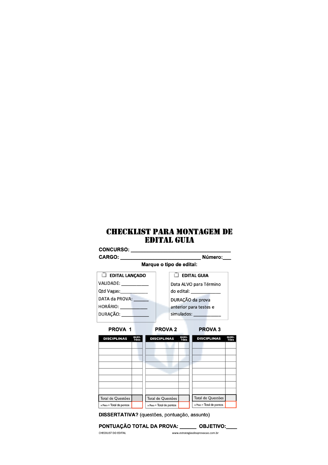 AULA 12 - EXERCÍCIO: CHECKLIST DO EDITAL (exemplo) Em 5-8 minutos, use o edital de exemplo abaixo para identificar o trechos principais: - Nome do concurso - Nome do cargo (e número, se houver) - Validade (use a ferramenta de pesquisa) - Quantidade de Vagas (para sua categoria) - Data, horário e duração; - Quantidade de provas na parte objetiva, Disciplina, pontuação e peso de cada prova (para fins deste exercício, não precisa procurar a distribuição de questões por matéria); - Quantidade de textos na parte dissertativa, tipo de texto (dissertação, questão, sentença, peça técnica) e pontuação. PS: algumas páginas do edital original foram retiradas para que você consiga executar mais rapidamente o exercício ! CHECKLIST!DO!EDITAL!!!!! ! !!www.estrategiasdeaprovacao.com.br! ! ! ! ! CHECKLIST PARA MONTAGEM DE EDITAL GUIA CONCURSO: ____________________________________ CARGO: _____________________________ Número:___ Marque o tipo de edital: PROVA 1 PROVA 2 PROVA 3 DISSERTATIVA? (questões, pontuação, assunto) PONTUAÇÃO TOTAL DA PROVA: ______ OBJETIVO:____ !!!!! !!!!!EDITAL'LANÇADO! VALIDADE:!___________! Qtd!Vagas:___________! DATA!da!PROVA:!______! HORÁRIO:!___________! DURAÇÃO:!___________! !!!!! !!!!!EDITAL'GUIA! Data!ALVO!para!Término! do!edital:!____________! DURAÇÃO!da!prova! anterior!para!testes!e! simulados:!___________! DISCIPLINAS QUESTÕES (?) ! 1 MINISTÉRIO DA JUSTIÇA E SEGURANÇA PÚBLICA POLÍCIA RODOVIÁRIA FEDERAL CONCURSO PÚBLICO PARA O PROVIMENTO DE VAGAS NO CARGO DE POLICIAL RODOVIÁRIO FEDERAL EDITAL CONCURSO PRF Nº 1, DE 18 DE JANEIRO DE 2021 O DIRETOR-GERAL DA POLÍCIA RODOVIÁRIA FEDERAL (PRF), no uso das competências conferidas pelo Decreto nº 9.662, de 1º de janeiro de 2019, na Portaria SE/MJSP nº 1.429, de 3 de novembro de 2020, e no Despacho SE/MJSP nº 2/2021, considerando as disposições constitucionais referentes ao assunto e o contido na Lei nº 8.112, de 11 de dezembro de 1990, na Lei nº 9.654, de 2 de junho de 1998, na Lei nº 11.358, de 19 de outubro de 2006, na Lei nº 12.775, de 28 de dezembro de 2012, no Decreto nº 9.739, de 28 de março de 2019, no Decreto nº 10.139, de 28 de novembro de 2019, na Portaria SEDGG/ME nº 25.412 de 23 de dezembro de 2020, na Portaria Normativa PRF nº 9, de 7 de janeiro de 2021, e na Portaria SEDGG/ME nº 410, de 11 de janeiro de 2021, torna pública a realização de concurso público para o provimento de vagas no cargo de Policial Rodoviário Federal, Padrão I da Terceira Classe, mediante as condições estabelecidas neste edital. 1 DAS DISPOSIÇÕES PRELIMINARES 1.1 O concurso público será regido por este edital, por seus anexos, pelos demais editais complementares e pela Portaria Normativa PRF nº 9/2021 e executado pelo Centro Brasileiro de Pesquisa em Avaliação e Seleção e de Promoção de Eventos (Cebraspe) e pela PRF. 1.2 O concurso será de abrangência nacional, sendo ofertadas aos novos policiais as oportunidades de lotação de acordo com a necessidade do serviço e o interesse público. 1.3 A seleção para o cargo de que trata este edital será realizada em duas etapas que se equiparam às fases citadas no art. 3º da Lei nº 9.654/1998, conforme especificado a seguir. 1.3.1 A primeira etapa compreenderá as seguintes fases: a) prova objetiva e prova discursiva, de caráter eliminatório e classificatório, de responsabilidade do Cebraspe; b) exame de aptidão física, de caráter eliminatório, de responsabilidade do Cebraspe; c) avaliação psicológica, de caráter eliminatório, de responsabilidade do Cebraspe; d) apresentação de documentos, de caráter eliminatório, de responsabilidade do Cebraspe e da PRF; e) avaliação de saúde, de caráter eliminatório, de responsabilidade do Cebraspe; f) avaliação de títulos, de caráter classificatório, de responsabilidade do Cebraspe. 1.3.2 A segunda etapa do concurso será o Curso de Formação Policial (CFP), de caráter eliminatório e classificatório, de responsabilidade da PRF, com apoio do Cebraspe, a ser realizado na Universidade Corporativa da Polícia Rodoviária Federal (UniPRF), localizada na cidade de Florianópolis/SC, ou em outros locais indicados pela PRF por meio de edital, e contemplará a realização de provas teóricas e práticas, podendo contemplar, ainda, as seguintes avaliações: a) testes de aptidão física, em complementação ao exame de aptidão física realizado na primeira etapa; b) avaliação psicológica continuada, em complementação à avaliação psicológica realizada na primeira etapa; c) avaliação de saúde continuada, em complementação à avaliação de saúde realizada na primeira etapa. 1.4 Todas as fases da primeira etapa, a avaliação biopsicossocial dos candidatos que solicitarem concorrer às vagas reservadas às pessoas com deficiência e o procedimento de heteroidentificação para concorrer às 2 vagas reservadas aos candidatos negros serão realizadas nas capitais de todos os estados e do Distrito Federal. 1.4.1 Havendo indisponibilidade de locais suficientes ou adequados nas localidades de realização das provas, estas poderão ser realizadas em outras localidades. 1.5 A investigação social se estenderá durante todo o concurso. 2 DO CARGO DE POLICIAL RODOVIÁRIO FEDERAL 2.1 REQUISITO: diploma, devidamente registrado, de conclusão de curso de graduação em qualquer área de formação, fornecido por instituição de ensino superior reconhecida pelo Ministério da Educação (MEC). 2.2 ATRIBUIÇÕES: as atribuições gerais das classes do cargo de Policial Rodoviário Federal são as seguintes: I – Terceira Classe: atividades de natureza policial envolvendo fiscalização, patrulhamento e policiamento ostensivo, atendimento e socorro às vítimas de acidentes rodoviários e demais atribuições relacionadas com a atividade finalística da Polícia Rodoviária Federal; II – Segunda Classe: atividades de natureza policial envolvendo a execu