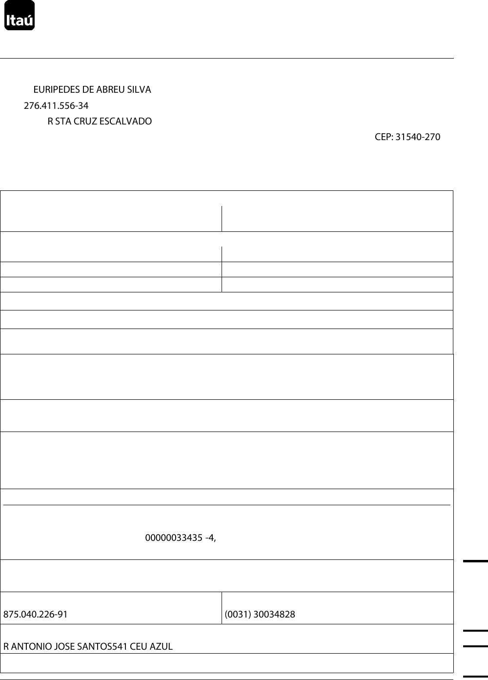 Condições Gerais do Limite de Crédito para Empréstimo Mediante Consignação em Folha de Pagamento ou benefício do INSS Nº 000000669673915 1. Dados do Emitente: Nome: EURIPEDES DE ABREU SILVA CPF: 276.411.556-34 Endereço: R STA CRUZ ESCALVADO Nº 20 Complemento: CS Bairro: JARDIM LEBLON CEP: 31540-270 Cidade: BELO HORIZONTE UF: MG 2. Dados do Empréstimo: 2.1. Total Emprestado (2.1.1+2.1.2+2.1.3+2.1.4): R$ 37.624,59 2.1.1. Livre Utilização: R$ 11.990,86 2.1.2. Saldo Refinanciado: R$ 25.216,52 2.1.3. IOF (imposto): R$ 417,21 2.1.4. Despesa com Correspondente: R$ 0,00 2.2. Taxa de juros remuneratórios capitalizados mensalmente: 2.2.1. Ao mês (30 dias): 1,2300 % 2.2.2. Ao ano (365 dias): 15,8005 % 2.3. Valor de cada parcela: R$ 753,00 2.4. Quantidade de parcelas: 84 2.5. Vencimento da 1ª parcela: 10.01.2022 2.6.Vencimento mensal de parcela: todo dia 8 2.7. Vencimento da última parcela: 08.12.2028 2.8. Soma Total a Pagar, incluindo juros remuneratórios (2.3 x 2.4): R$ 63.252,00 2.9. Custo Efetivo Total Mensal (CET): 1,2600 % Custo Efetivo Total (CET): 16,4400 % ao ano ao mês 2.10. Modalidade de Pagamento: Desconto em Folha Importante: Caso não seja possível o desconto em folha, o débito será realizado de forma automática utilizando os recursos da conta-corrente. 2.11. Conta autorizada para débito, conforme cláusula 4.1, item c : nº 0033435 , Agência 7414 do Banco 341 2.12. Autorização para débito em conta: ( X ) Caso não seja possível o desconto em folha, autorizo o débito do valor total ou parcial da(s) parcela(s) na(s) conta(s) corrente(s) acima indicada(s), na data de vencimento ou após o vencimento, podendo ser utilizado o limite de cheque especial, se contratado, evitando atrasos nos pagamentos. 2.13. Empregador (Nome da Fonte Pagadora): INSS CONSIGNACAO 2.14. Forma de liberação do crédito, se houver: ( ) Ordem de pagamento em qualquer agência do Itaú (X) Crédito na conta-corrente nº 00000033435 -4, Agência 07414 do Banco 341 ( ) Crédito Cartão Beneficio nº 01899504025 2.15. CNPJ da Agência do Itaú ou do Correspondente responsável por esta operação: 60.701.190/0001-04 2.15.1 . CPF do Promotor do Correspondente: 2.15.2.Telefone do Correspondente: 875.040.226-91 (0031) 30034828 2.15.3. Endereço do Correspondente: R ANTONIO JOSE SANTOS541 CEU AZUL 2.16. Data e local de emissão desta Cédula: 08.09.2021 BELO HORIZONTE- 25015-9 (FL 1/8) 09/21 1º via - Itaú Unibanco (NEGOCIÁVEL) - 2º via - Cliente (NÃO NEGOCIÁVEL) 0002452 AZ00M 14/09/2021 AZREXF18 G0876 homer Caixa de texto homer Caixa de texto homer Caixa de texto homer Caixa de texto Essa operação está sujeita à análise cadastral, de crédito e existência de margem disponível para a consignação, o que pode acarretar a não concessão do crédito solicitado por você. Nas datas de vencimento indicadas nos itens 2.5 a 2.7, pagarei ao Itaú Unibanco S.A., CNPJ nº 60.701.190/0001-04, designado Itaú, por esta Cédula de Crédito Bancário, na Praça de São Paulo, SP, o valor de cada uma das parcelas deste empréstimo especificado no item 2.3, observadas as condições abaixo, cuja soma delas corresponde ao Valor Total Emprestado acrescido dos juros remuneratórios, indicados nos itens 2.1 e 2.2, respectivamente. Caso a contratação ocorra por meio remoto, terei 07 (sete) dias, contados da liberação do Valor Entregue, para entrar em contato com o Itaú e cancelar a operação. Estou ciente de que, em caso de refinanciamento, a operação originalmente contratada por mim será desaverbada junto à entidade pagadora. Dessa forma, se houver o cancelamento da repactuação por quaisquer motivos, o valor das parcelas referente à operação originalmente contratada por mim, poderá ser debitado em minha conta-corrente. Poderei solicitar a alteração do modo de pagamento de débito em conta para boleto bancário em minha agência ou através da Central de Atendimento ou do Fale Conosco, disponibilizados pelo Itaú. Li esta Cédula previamente e concordo integralmente com suas disposições, inclusive com suas condições gerais. Possuo condição econômico-financeira para pagar mensalmente o valor das parcelas dessa Cédula sem comprometer o meu sustento e o de minha família. Não poderei solicitar o cancelamento da consignação das parcelas em minha remuneração mensal sem a prévia e expressa concordância do Itaú. Evite superendividar-se. Realize a contratação de empréstimos sempre de acordo com suas condições financeiras, sem comprometer o seu orçamento e o de sua família. Assinado eletronicamente 1.Empréstimo Mediante Consignação em Folha de Pagamento ou benefício do INSS O Itaú concederá a você um empréstimo, no valor total indicado no ato da contratação, o qual poderá ser utilizado das seguintes formas: (A) Livre utilização , sendo entregue integralmente a você. (B) Refinanciamento de outras dívidas que você tenha com o Itaú, em que parte do valor comporá o refinanciamento como Saldo Refinanciado e outra parte será disponibilizada para sua livre utilização (Valor Entregue), após dedução do IOF. Neste caso, servirá esta Cédula para aditar o(s) contrato(s) original(is) listado(s) neste documento, sem intenção de novar, passando as cláusulas aqui previstas a reger tal(is) operação(ões). (C) Portabilidade de dívida , sendo que, neste caso, o Itaú concederá a você um empréstimo no valor total da(s) operação(ões) portada(s) mediante transferência dos recursos utilizados à instituição credora original anteriormente identificada. O Itaú enviará para referida instituição o seu pedido de portabilidade, conforme os dados fornecidos por você, e solicitará a confirmação desses dados para efetivar a portabilidade. Confirmadas as informações por parte da instituição de origem e mantidas as atuais condições para concessão do crédito, seu empréstimo será utilizado para transferência dos recursos à instituição credor