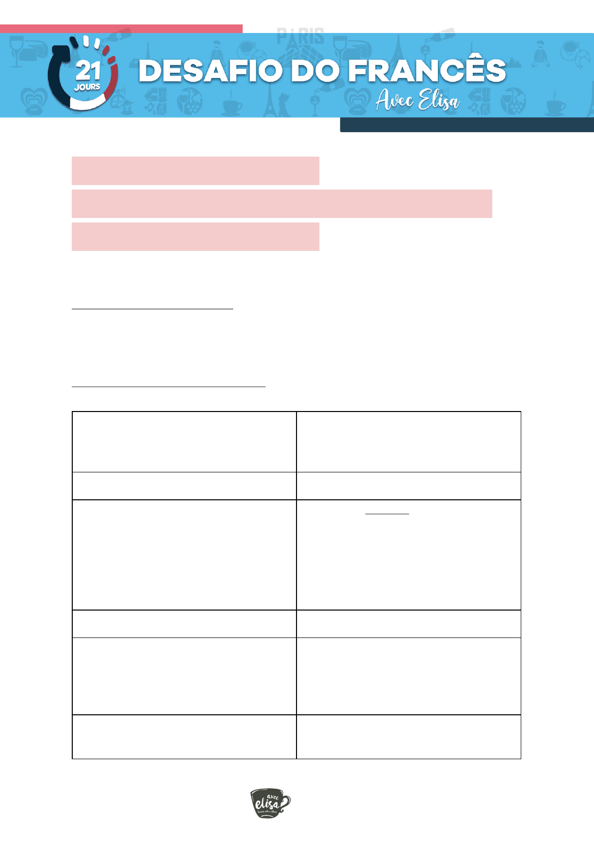 DESAFIO 11 / DÉFI 11 FALAR SOBRE GOSTOS, SABORES, COMIDAS, RECEITAS OBJETIVO DO DESAFIO Conseguir explicar receitas, sabores, gostos e preferências na culinária. Tudo isso em francês! VOCABULAIRE IMPORTANT: Salgado SALÉ(e): Les frites sont salées. Le fromage est salé. Les chips sont salés. SAL Le sel/ du sel Doce Sucré(e). DOUX: Un gâteau sucré. Un chocolat sucré. Un fruit sucré. Une tarte sucrée. Des bonbons très sucrés. O AÇÚCAR LE SUCRE/ du sucre Amargo AMER (e): Le café est amer. Le pamplemousse est amer. Le chocolat noir. Azedo/ ácido ACIDE: Le citron est un fruit acide. 1 cítrico Agrumes picante Piquant le poivre et le piment sont piquants. agridoce aigre-doux/ aigre-douce gorduroso/ gordurosa gras/ grasse Ce croissant est trop gras. Crocante croustillant [cRus ti iã] EXPRESSIONS Ça pique! Esta picante, apimentado! C’est délicieux! É delicioso VOCABULAIRE Farinha Farine Ovo/ ovos Œuf [fala o f no singular mas não no plural] Manteiga Beurre Creme de leite Crème fraîche Ferment ferment/ levure Leite Lait Água Eau (de l’eau) Chantilly Chantilly Leite condensado Lait concentré sucré 2 Avoine aveia Levain (só fermentação natural) Levain Cacau cacao Canela cannelle chocolate em pó chocolat en poudre TERMOS DE COZINHA Cortar Couper misturar/ remexer remuer bater battre bater com um fouet fouetter misturar mélanger cozinhar/ assar Faire cuire sauter saltear/ refogar gratinar gratiner flambar flamber fritar faire frire uma forma un moule frigideira un poêle panela casserole panela de pressão cocotte-minute 3 Beurrer (le moule, la casserolle…) untar com manteiga - LE sel/ LE sucre/ LE piment/ LA vanille, LES bonbons, etc Articles définis = demonstram que eu sei exatamente do que eu estou falando. DU sel, DU sucre, DU piment, DES bonbons = PARTITIF = quantidade INDETERMINADA de algo Coloque SAL = não sei qual é a quantidade Mettez DU Sel = não sei qual é a quantidade Compre carne = não sei qual é a quantidade Achète DE LA viande = não sei qual é a quantidade Compre A carne = eu sei qual é a carne, a quantidade etc Achète LA viande Défi 11: Escolha uma receita que você sempre faz e descreva o passo a passo em um texto no telegram e no stories do insta (com áudio). Dicas: pesquisar vocabulário no site MARMITON.fr 4 Assistir masterchef em francês e outros programas de cozinha para ampliar o vocabulário de vocês. PARTICIPAR DO DESAFIO DE MÃO NA MASSA HOJE 15h ao vivo no instagram para fazer SABLÉS. ;-) Ao participar escreva: #maonamassa @avecelisa 5