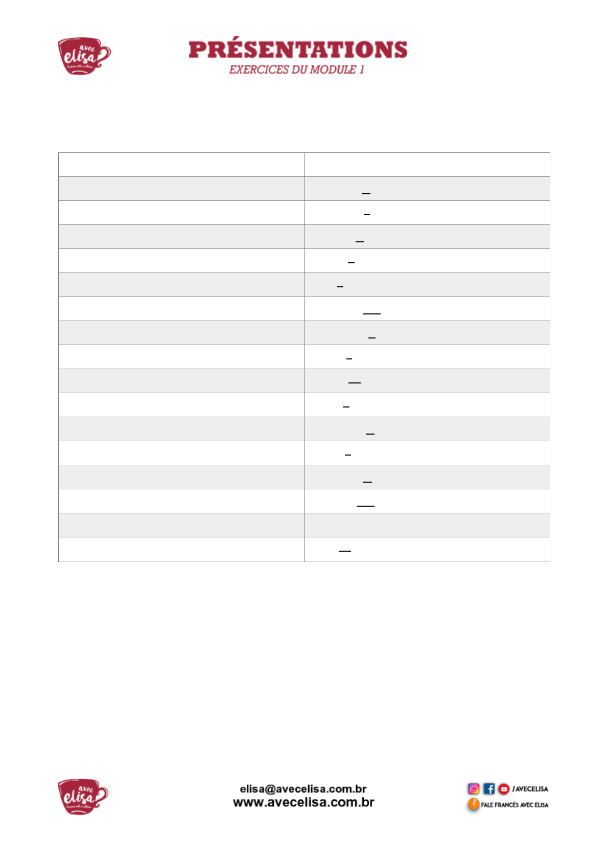 ! Exercice 1 - Complétez le tableau avec les adjectifs de nationalité au féminin ou au masculin. MASCULIN FÉMININ Français FRANÇAISE CAMEROUNAIS Camerounaise Suédois SUÉDOISE AMÉRICAIN Américaine CHINOIS [OI= uá] Chinoise Canadien CANADIENNE Espagnol ESPAGNOLE PORTUGAIS [AI= É/ Ê] Portugaise AUSTRALIEN Australienne MEXICAIN (boca aberta!) Mexicaine [x= ksss] Allemand ALLEMANDE MAROCAIN Marocaine Argentin ARGENTINE Tunisien TUNISIENNE Russe RUSSE BOLIVIEN Bolivienne ! ! Exercice 2 - Faites le plus grand nombre de phrases possible, avec un élément de chaque colonne. Je m’appelle Antoine. Je m’appelle Sophie. Je suis Antoine. Je suis Sophie. Je suis Français, Je suis Américain. (liaison) Je suis Chinois. Je suis Anglaise. Tu t’appelles Antoine. Tu t’appelles Sophie. Il s’appelle Antoine. Il est Américain. Il est Chinois. Elle s’appelle Sophie. Elle est Anglaise. Vous êtes Sophie. Vous êtes Antoine. Vous êtes Français. Vous êtes Américain. Vous êtes Chinois. Vous êtes Anglaise. Exercice 3 - Complétez les dialogues, avec tu ou vous. a) – Bonjour, madame, comment-allez VOUS? – Bien, merci. b) – Salut, TU vas bien? – Oui, et toi? c) – Bonjour maman, TU vas bien? – Oui, ma chérie, et toi? d) – Bonjour, comment TU t’appelles? – Je m’appelle Frédéric, et toi? e) – Bonjour, quel est votre nom? – FINGERMANN. – VOUS pouvez épeler? JE S’appelle Antoine TU Êtes Anglaise IL Est Français ELLE Suis Américain VOUS M’appelle Sophie T’appelles Chinois ! ! Exercice 4 - Complétez avec le verbe être et s’appeler. a) Bonjour, je me présente. Je M'APPELLE Marc, je SUIS français. Et vous? b) Bonjour, enchantée, je M'APPELLE Anna, je SUIS polonaise. c) Salut Julie, tu sais comment il S'APPELLE le garçon brésilien dans notre classe? d) Oui! Il S'APPELLE Rafael, mais il n’EST pas brésilien. Il EST italien! Exercice 5 - Faites 5 phrases à la négation en utilisant les verbes que vous avez appris. A) B) C) D) E) Exercice 6 - Grave uma pequena apresentação sua, colocando em prática os pontos que aprendemos até agora. Nesta apresentação deve constar: - Épelez votre nom (soletrar o seu nome completo) - Comment vous vous appelez? - Quelle est votre nationalité? - Quelles langues vous parlez? - Quelles langues vous ne parlez pas? Você pode postar esta apresentação na Comunidade dos Alunos do Avec Elisa no Facebook. Caso você não queira ou não use facebook você pode me enviar por email. Qualquer dúvida e qualquer dificuldade não deixe de nos escrever ou mandar mensagem, estamos aqui para te ajudar! !