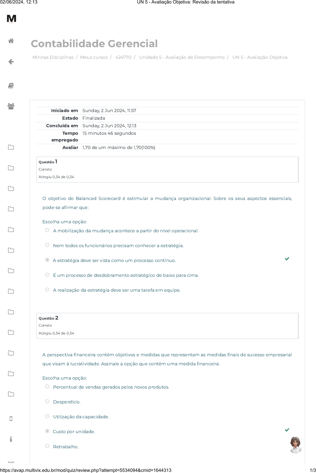 Minhas Disciplinas / Meus cursos / 424770 / Unidade 5 - Avaliação de Desempenho / UN 5 - Avaliação Objetiva Contabilidade Gerencial Iniciado em Sunday, 2 Jun 2024, 11:57 Estado Finalizada Concluída em Sunday, 2 Jun 2024, 12:13 Tempo empregado 15 minutos 46 segundos Avaliar 1,70 de um máximo de 1,70(100%) Questão 1 Correto Atingiu 0,34 de 0,34 Questão 2 Correto Atingiu 0,34 de 0,34 O objetivo do Balanced Scorecard é estimular a mudança organizacional. Sobre os seus aspectos essenciais, pode-se a�rmar que: Escolha uma opção: A mobilização da mudança acontece a partir do nível operacional. Nem todos os funcionários precisam conhecer a estratégia. A estratégia deve ser vista como um processo contínuo. É um processo de desdobramento estratégico de baixo para cima. A realização da estratégia deve ser uma tarefa em equipe. A perspectiva �nanceira contém objetivos e medidas que representam as medidas �nais de sucesso empresarial que visam à lucratividade. Assinale a opção que contém uma medida �nanceira: Escolha uma opção: Percentual de vendas gerados pelos novos produtos. Desperdício. Utilização da capacidade. Custo por unidade. Retrabalho. 02/06/2024, 12:13 UN 5 - Avaliação Objetiva: Revisão da tentativa https://avap.multivix.edu.br/mod/quiz/review.php?attempt=5534094&cmid=1644313 1/3 https://avap.multivix.edu.br/my/ https://avap.multivix.edu.br/course/view.php?id=26561 https://avap.multivix.edu.br/course/view.php?id=26561§ion=6 https://avap.multivix.edu.br/mod/quiz/view.php?id=1644313 https://avap.multivix.edu.br/my/ https://avap.multivix.edu.br/course/view.php?id=26561 https://avap.multivix.edu.br/user/index.php?id=26561 https://avap.multivix.edu.br/course/view.php?id=26561§ion=1 https://avap.multivix.edu.br/course/view.php?id=26561§ion=2 https://avap.multivix.edu.br/course/view.php?id=26561§ion=3 https://avap.multivix.edu.br/course/view.php?id=26561§ion=4 https://avap.multivix.edu.br/course/view.php?id=26561§ion=5 https://avap.multivix.edu.br/course/view.php?id=26561§ion=6 https://avap.multivix.edu.br/course/view.php?id=26561§ion=7 https://avap.multivix.edu.br/course/view.php?id=26561§ion=8 https://avap.multivix.edu.br/course/view.php?id=26561§ion=9 https://avap.multivix.edu.br/course/view.php?id=26561§ion=10 https://avap.multivix.edu.br/course/view.php?id=26561§ion=11 https://avap.multivix.edu.br/course/view.php?id=26561§ion=12 https://avap.multivix.edu.br/course/view.php?id=26561§ion=13 https://avap.multivix.edu.br/hooks/portal/ https://avap.multivix.edu.br/mod/page/view.php?id=1252%2F%22%20target%3D%22_blank https://avap.multivix.edu.br/calendar/view.php/ https://avap.multivix.edu.br/ https://avap.multivix.edu.br/ https://avap.multivix.edu.br/ https://avap.multivix.edu.br/ Questão 3 Correto Atingiu 0,34 de 0,34 Questão 4 Correto Atingiu 0,34 de 0,34 O BSC está concentrado nas perspectivas �nanceira, dos clientes, dos processos internos e aprendizagem e crescimento. Relacione a primeira coluna com a segunda coluna: Perspectiva �nanceira Perspectiva cliente Perspectiva processo interno Perspectiva aprendizado e crescimento ( ) alcançar a excelência de atendimento através de melhoria contínua. ( ) alinhar os incentivos e as recompensas aos colaboradores conforme a estratégia empresarial. ( ) fornecer soluções completas aos seus consumidores. ( ) maximizar o faturamento através da expansão das vendas aos clientes existentes. A sequência correta de cima para baixo é: Escolha uma opção: 3, 4, 2, 1. 2, 4, 4, 3. 1, 3, 4, 2. 3, 1, 4, 2. 2, 1, 4, 3. As medidas de desempenho podem ser �nanceiras e não �nanceiras. No Balanced Scorecard, quando utilizamos o indicador de número de novos clientes, a empresa está mensurando: Escolha uma opção: Satisfação de clientes. Aprendizagem e crescimento. Captação de clientes. Participação de mercado. Processos internos. 02/06/2024, 12:13 UN 5 - Avaliação Objetiva: Revisão da tentativa https://avap.multivix.edu.br/mod/quiz/review.php?attempt=5534094&cmid=1644313 2/3 https://avap.multivix.edu.br/my/ https://avap.multivix.edu.br/course/view.php?id=26561 https://avap.multivix.edu.br/user/index.php?id=26561 https://avap.multivix.edu.br/course/view.php?id=26561§ion=1 https://avap.multivix.edu.br/course/view.php?id=26561§ion=2 https://avap.multivix.edu.br/course/view.php?id=26561§ion=3 https://avap.multivix.edu.br/course/view.php?id=26561§ion=4 https://avap.multivix.edu.br/course/view.php?id=26561§ion=5 https://avap.multivix.edu.br/course/view.php?id=26561§ion=6 https://avap.multivix.edu.br/course/view.php?id=26561§ion=7 https://avap.multivix.edu.br/course/view.php?id=26561§ion=8 https://avap.multivix.edu.br/course/view.php?id=26561§ion=9 https://avap.multivix.edu.br/course/view.php?id=26561§ion=10 https://avap.multivix.edu.br/course/view.php?id=26561§ion=11 https://avap.multivix.edu.br/course/view.php?id=26561§ion=12 https://avap.multivix.edu.br/course/view.php?id=26561§ion=13 https://avap.multivix.edu.br/hooks/portal/ https://avap.multivix.edu.br/mod/page/view.php?id=1252%2F%22%20target%3D%22_blank https://avap.multivix.edu.br/calendar/view.php/ https://avap.multivix.edu.br/ https://avap.multivix.edu.br/ https://avap.multivix.edu.br/ https://avap.multivix.edu.br/ Questão 5 Correto Atingiu 0,34 de 0,34 O Balanced Scorecard (BSC) traduz a missão e a estratégia da empresa em conjunto abrangente de medidas de desempenho �nanceiras e não �nanceiras que embasa o sistema de mediação e gestão estratégica. Analise as a�rmativas abaixo: Traduz a estratégia empresarial em um conjunto de objetivos e indicadores de desempenho que abrangem perspectivas �nanceira, dos clientes, dos processos internos e aprendizagem e crescimento. O BSC é uma ferramenta que permite a introdução de propósitos de curto prazo no sistema gerencial da organização através de mecanismos de direcionamento e mensuração de desempenho. O processo de construção do Balanced Sc
