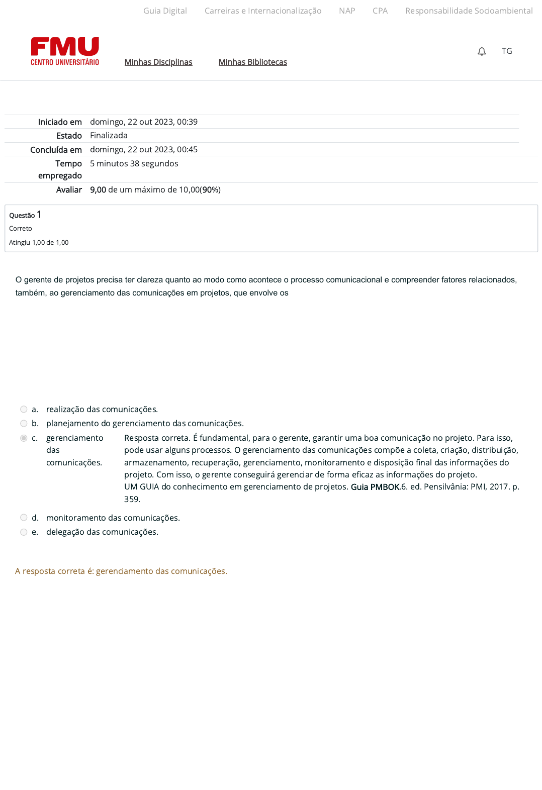 30/03/2024, 20:30 N2 (A5): Revisão da tentativa https://ambienteacademico.com.br/mod/quiz/review.php?attempt=3132368&cmid=1072510 1/6 Iniciado em domingo, 22 out 2023, 00:39 Estado Finalizada Concluída em domingo, 22 out 2023, 00:45 Tempo empregado 5 minutos 38 segundos Avaliar 9,00 de um máximo de 10,00(90%) Questão 1 Correto Atingiu 1,00 de 1,00 O gerente de projetos precisa ter clareza quanto ao modo como acontece o processo comunicacional e compreender fatores relacionados, também, ao gerenciamento das comunicações em projetos, que envolve os “processos necessários para garantir que as necessidades de informações do projeto e de suas partes interessadas sejam satisfeitas, com o desenvolvimento de artefatos e a implementação de atividades [...] para realizar a troca eficaz de informações”. UM GUIA do conhecimento em gerenciamento de projetos. Guia PMBOK.6. ed. Pensilvânia: PMI, 2017. p. 359. Existem três grupos de processos de comunicação em projetos. A coleta, a criação, a distribuição, armazenamento, recuperação, gerenciamento, monitoramento e disposição final das informações do projeto, de forma oportuna e adequada, compreendem o processo de: a. realização das comunicações. b. planejamento do gerenciamento das comunicações. c. gerenciamento das comunicações. Resposta correta. É fundamental, para o gerente, garantir uma boa comunicação no projeto. Para isso, pode usar alguns processos. O gerenciamento das comunicações compõe a coleta, criação, distribuição, armazenamento, recuperação, gerenciamento, monitoramento e disposição �nal das informações do projeto. Com isso, o gerente conseguirá gerenciar de forma e�caz as informações do projeto. UM GUIA do conhecimento em gerenciamento de projetos. Guia PMBOK.6. ed. Pensilvânia: PMI, 2017. p. 359. d. monitoramento das comunicações. e. delegação das comunicações. A resposta correta é: gerenciamento das comunicações. Guia Digital Carreiras e Internacionalização NAP CPA Responsabilidade Socioambiental Minhas Disciplinas Minhas Bibliotecas TG https://codely-fmu-content.s3.amazonaws.com/Moodle/GuiaDigital/Guia+digital/index.html https://carreiras.fmu.br/ https://codely-fmu-content.s3.amazonaws.com/Moodle/NAP/inicial/nap/fmu/index.html https://codely-fmu-content.s3.amazonaws.com/Moodle/CPA/landing_CPA/index.html https://portal.fmu.br/sustentabilidade https://ambienteacademico.com.br/ https://ambienteacademico.com.br/ https://ambienteacademico.com.br/course/view.php?id=236 30/03/2024, 20:30 N2 (A5): Revisão da tentativa https://ambienteacademico.com.br/mod/quiz/review.php?attempt=3132368&cmid=1072510 2/6 Questão 2 Correto Atingiu 1,00 de 1,00 Questão 3 Correto Atingiu 1,00 de 1,00 Dentre as estruturas funcionais que as organizações podem adotar ao trabalhar a gestão de projetos, a considerada mais e�ciente é a matricial, pois apresenta um modelo híbrido, reunindo os aspectos positivos das demais e oferecendo maior autonomia para o gerente de projetos. LARSON, E. W.; GRAY, C. F. Gerenciamento de projetos:o processo gerencial. 6. ed. Porto Alegre: AMGH, 2016. Essa estrutura pode variar em três níveis, que são: a. Matricial fraca, matricial balanceada e matricial forte. Resposta correta. A estrutura matricial pode ser utilizada pelas empresas conforme a intensidade ou nível de autoridade dos gerentes e é dividida em três níveis: matricial fraca, matricial balanceada e matricial forte. Em cada uma, varia o grau de autonomia do gerente e também suas atividades. LARSON, E. W.; GRAY, C. F. Gerenciamento de projetos:o processo gerencial. 6. ed. Porto Alegre: AMGH, 2016. b. Matricial 1, matricial 2 e matricial 3. c. Matricial alta, matricial média e matricial baixa. d. Projetizada fraca, projetizada balanceada e projetizada forte. e. Funcional, projetizada e matricial. A resposta correta é: Matricial fraca, matricial balanceada e matricial forte. Uma importante ferramenta que auxilia as organizações no levantamento de indicadores que contribuem para o desenvolvimento de ações que ajudam a atingir seus objetivos estratégicos. Entre as perspectivas que podem ser levantadas com essa ferramenta, estão aquelas com as quais os executivos procuram conhecer os processos críticos que devem ser melhorados na empresa, buscando, assim, a excelência, a �m de atender aos objetivos dos acionistas e dos clientes. Diante disso, tal indicador é: a. Aprendizagem e crescimento. b. Processos internos. Resposta correta. Vários indicadores são fornecidos por meio do uso do Balanced Scorecard, uma ferramenta que surgiu visando contribuir para que a organização desenvolva ações que contribuam para atingir seus objetivos estratégicos. Entre eles, o de processos internos: indicador que ajuda os executivos a conhecerem os pontos críticos que devem ser melhorados com o intuito de alcançar a excelência e os objetivos determinados por acionistas e clientes. c. Financeiro. d. Planejamento estratégico. e. Cliente. A resposta correta é: Processos internos. Guia Digital Carreiras e Internacionalização NAP CPA Responsabilidade Socioambiental Minhas Disciplinas Minhas Bibliotecas TG https://codely-fmu-content.s3.amazonaws.com/Moodle/GuiaDigital/Guia+digital/index.html https://carreiras.fmu.br/ https://codely-fmu-content.s3.amazonaws.com/Moodle/NAP/inicial/nap/fmu/index.html https://codely-fmu-content.s3.amazonaws.com/Moodle/CPA/landing_CPA/index.html https://portal.fmu.br/sustentabilidade https://ambienteacademico.com.br/ https://ambienteacademico.com.br/ https://ambienteacademico.com.br/course/view.php?id=236 30/03/2024, 20:30 N2 (A5): Revisão da tentativa https://ambienteacademico.com.br/mod/quiz/review.php?attempt=3132368&cmid=1072510 3/6 Questão 4 Correto Atingiu 1,00 de 1,00 Questão 5 Correto Atingiu 1,00 de 1,00 Ao planejar o gerenciamento das aquisições do projeto, é importante que o gerente conte na equipe com indivíduos que tenham conhecimento sobre os bens