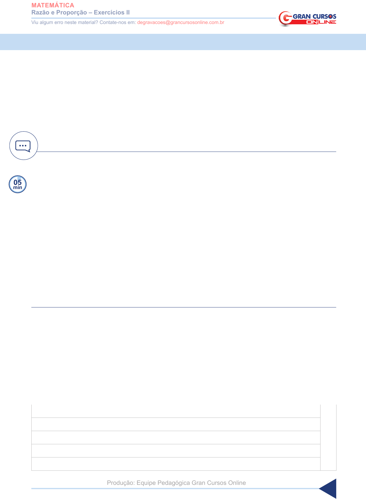 1 www.grancursosonline.com.br Razão e Proporção – Exercícios II MATEMÁTICA Viu algum erro neste material? Contate-nos em: degravacoes@grancursosonline.com.br Produção: Equipe Pedagógica Gran Cursos Online RAZÃO E PROPORÇÃO – EXERCÍCIOS II 11. Considere-se que o avô das irmãs Maria, Norma e Sueli queira dividir entre elas a quantia de R$ 700,00 em partes diretamente proporcionais às suas idades e que cada quatro anos de Maria correspondam a três anos de Nor- ma, que cada seis anos de Maria correspondam a sete anos de Sueli e que as idades de Norma e Sueli somem 23 anos. Nesse caso, Norma receberá menos de R$ 200,00. Comentário “Que cada” é referente a razão. M/N = 4/3; M/S = 6/7 Para ajustar M nas duas razões: M/N = 4x6/3x6; M/S = 6x4/7x4 M/N = 24/18; M/S = 24/28 M = 24p dividido por 2 = 12p N = 18p dividido por 2 = 9p S = 28p dividido por 2 = 14p Total em partes = 35p 35p = 700 p = 700/35 = 20 N recebe 9 partes 9.20 = 180,00 12. Marcos, Pedro e Paulo, servidores de um tribunal, dedicam, respectivamen- te, 10, 15 e 25 horas semanais a acompanhar o trâmite de processos. Assim, os processos que chegam ao tribunal semanalmente são distribuídos pelo chefe do setor para acompanhamento do trâmite por esses três servidores em quantidades diretamente proporcionais aos tempos que cada um deles dedica a essa atividade. Com base nessas informações, julgue os itens se- guintes. AN O TAÇ Õ ES 2 www.grancursosonline.com.br AN O TA Ç Õ ES Razão e Proporção – Exercícios II MATEMÁTICA Viu algum erro neste material? Contate-nos em: degravacoes@grancursosonline.com.br Produção: Equipe Pedagógica Gran Cursos Online 1. Marcos acompanhará o trâmite de menos de 10% dos processos que che- gam ao tribunal semanalmente. 2. Se, em determinada semana, Marcos e Paulo acompanharam, juntos, o trâ- mite de 98 processos, então, nessa semana, deram entrada no tribunal mais de 150 processos. 3. A tramitação de metade dos processos que chegam semanalmente ao tribu- nal será acompanhada por Paulo. 4. Caso, em determinada semana, cheguem 200 processos ao tribunal, Pedro acompanhará o trâmite de mais de 70 desses processos. Comentário Marcos: 10p Pedro: 15p Paulo: 25p Simplificando: Marcos: 10p dividido por 5 = 2p Pedro: 15p dividido por 5 = 3p Paulo: 25p dividido por 5 = 5p (1) O total é de 10p (100%) 2p = 20% (2) Marcos + Paulo = 98 2p + 5p = 98 7p = 98 p = 14 Total: 10p x 14 = 140 (3) Total 10p Paulo 5p 4) 10p = 200 p = 20 Pedro = 3p 3.20 = 60p 3 www.grancursosonline.com.br AN O TAÇ Õ ES Razão e Proporção – Exercícios II MATEMÁTICA Viu algum erro neste material? Contate-nos em: degravacoes@grancursosonline.com.br Produção: Equipe Pedagógica Gran Cursos Online 13. Dois Técnicos Judiciários de um setor do Tribunal Regional Federal – Paulo e João – têm, respectivamente, 30 e 35 anos de idade e seus respectivos tempos de trabalho nesse setor são 6 e 9 anos. Incumbidos de arquivar os documentos de um lote, eles os dividiram entre si em partes diretamente proporcionais aos seus respectivos tempos de serviço nesse setor, ca- bendo a Paulo 78 documentos. Se a divisão tivesse sido feita em partes in- versamente proporcionais às suas respectivas idades, quantos documentos caberiam a João? a. 82 b. 85. c. 87. d. 90. e. 105. Comentário P: 6p = 78 → p = 78/6 = 13 J: 9p → 9.13 = 117 Total = 117 + 78 = 195 P: 30 anos J: 35 anos No inversamente proporcional, utiliza-se a regra da “mãozinha”: P: 30 anos → 35p J: 35 anos → 30p Simplificando (dividindo por 5): P: 30 anos → 35p dividindo por 5 = 7p J: 35 anos → 30p dividindo por 5 = 6p O total em partes = 13p 13p = 195 p = 15 João está com 6p, sendo que p vale 15 João → 6x15 = 90 4 www.grancursosonline.com.br AN O TA Ç Õ ES Razão e Proporção – Exercícios II MATEMÁTICA Viu algum erro neste material? Contate-nos em: degravacoes@grancursosonline.com.br Produção: Equipe Pedagógica Gran Cursos Online 14. Na tabela abaixo têm-se as idades e os tempos de serviço de três soldados na corporação, que devem dividir entre si um certo número de fichas cadas- trais para verificação. Soldado Idade, em anos Tempo de serviço, em anos Abel 20 3 Daniel 24 4 Manoel 30 5 Se o número de fichas for 504 e a divisão for feita em partes diretamente proporcionais às suas respectivas idades, mas inversamente proporcionais aos seus respectivos tempos de serviço na corporação, o número de fichas que caberá a a. Daniel é 180; b. Manoel é 176; c. Daniel é 170; d. Manoel é 160; e. Daniel é 162. Comentário Diretamente proporcionais: A: 20 D: 24 M: 30 Inversamente proporcionais (regra da “mãozinha”) A: 5 x 4 = 20 D: 5 x 3 = 15 M: 3 x 4 = 12 5 www.grancursosonline.com.br Razão e Proporção – Exercícios II MATEMÁTICA Viu algum erro neste material? Contate-nos em: degravacoes@grancursosonline.com.br Produção: Equipe Pedagógica Gran Cursos Online Quando, na questão, houver a mistura de diretamente com inversamente: Simplificando A: 20 dividido por 2 = 10 D: 24 dividido por 2 = 12 M: 30 dividido por 2 = 15 Multiplicando os diretamente proporcionais com o inversamente proporcionais A: 20 dividido por 2 = 10 multiplicado por 20 = 200 D: 24 dividido por 2 = 12 multiplicado por 15 = 180 M: 30 dividido por 2 = 15 multiplicado por 12 = 180 D.P. I.P A: 20 20 = 200 10p D: 24 15 = 180 9p M: 30 12 = 180 9p ÷ 2 = 10 ÷ 2 ÷ 2 ÷ 2 ÷ 2 = 12 ÷ 2 = 15 Total em partes: 28p 28p = 504 p = 18 A: 10 x 18 = 180 D: 9 x 18 = 162 M: 9 x 18 = 162 GABARITO 11. C 12. 1.E; 2.E; 3.C; e 4.E 13. d 14. e ������������������������Este material foi elaborado pela equipe pedagógica do Gran Cursos Online, de acordo com a aula preparada e ministrada pelo professor Márcio Flávio Alencar. A presente degravação tem como objetivo auxiliar no acompanhamento e na revisão do con- teúdo ministrado na videoaula. Não recomendamos a substituição do estudo em víde