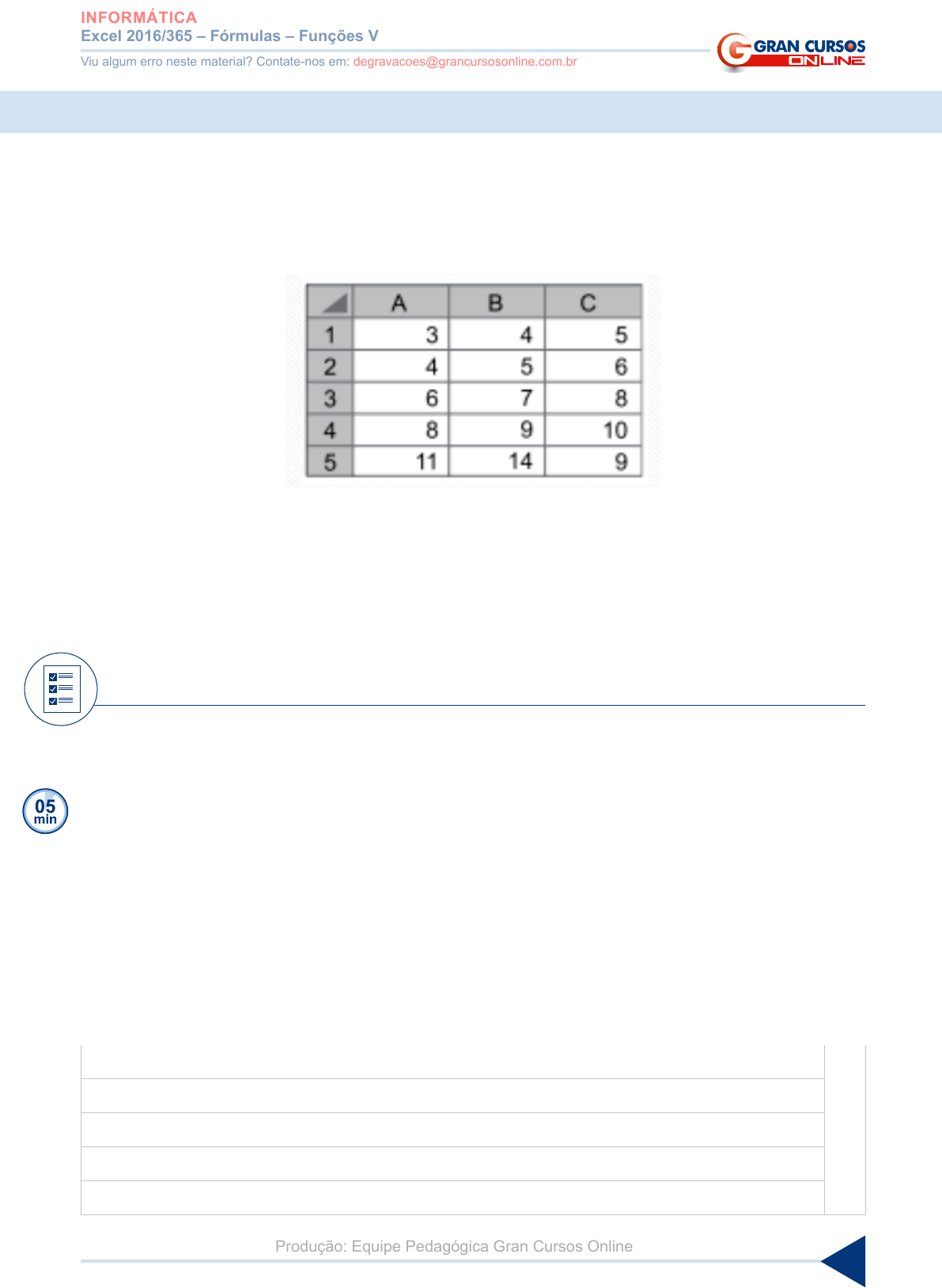 1 www.grancursosonline.com.br Excel 2016/365 – Fórmulas – Funções V INFORMÁTICA Viu algum erro neste material? Contate-nos em: degravacoes@grancursosonline.com.br Produção: Equipe Pedagógica Gran Cursos Online EXCEL 2016/365 – FÓRMULAS – FUNÇÕES Função SOMASE SOMASE é a mistura da função soma com a condição. Exemplo: Somar de A1 a C5 os valores maiores que 10: =SOMASE (intervalo; critérios; [intervalo_soma]) → =SOMASE (A1:C5; “ > 10”) = 25. OObs:� A soma será feita se determinados critérios forem obedecidos. Direto do concurso 1. (FCC/METRÔ-SP/OFICIAL-LOGÍSTICA) Considere a planilha a seguir, cria- da no Microsoft Excel, em português. Na célula B14 foi utilizada uma fórmula que somou, do intervalo de células de B3 a B13, os valores maiores que 90.000.000,00. A fórmula utilizada foi a. =IF(B3:B13;">90000000";SOMA()) b. =SOMA(B3:B13;">90000000") c. =SE((B3:B13)>90000000;SOMA()) d. =SOMASE(B3:B13;">90000000") e. =SOMASE((B3:B13)>90000000) AN O TAÇ Õ ES http://www.grancursosonline.com.br 2 www.grancursosonline.com.br AN O TA Ç Õ ES Excel 2016/365 – Fórmulas – Funções V INFORMÁTICA Viu algum erro neste material? Contate-nos em: degravacoes@grancursosonline.com.br Produção: Equipe Pedagógica Gran Cursos Online Função SOMASES Na função SOMASE, é dado apenas 1 critério. Já na função SOMASES, há mais de 1 critério. =SOMASES(intervalo_soma; intervalo_critérios1; critérios1; [intervalo_crité- rios2; critérios2];...) Direto do concurso 2. (VUNESP/PREF- SÃO JOSÉ DOS CAMPOS/ANALISTA) A fórmula a ser aplica- da na célula B10, para calcular o total de salários pagos para os funcionários aposentados e com idade superior a 58 anos, é a. =SOMASES(C2:C8;B2:B8;"S";D2:D8;">58") b. =SOMASES(D2:D8;B2:B8;">58";C2:C8;"S") c. =SOMASES(D2:D8;B2:B8;"S";C2:C8;">58") d. =SOMASE(D2:D8;B2:B8;">58" E "S") e. =SOMASE(D2:D8;B2:B8;">58";C2;C8:"S") http://www.grancursosonline.com.br 3 www.grancursosonline.com.br AN O TAÇ Õ ES Excel 2016/365 – Fórmulas – Funções V INFORMÁTICA Viu algum erro neste material? Contate-nos em: degravacoes@grancursosonline.com.br Produção: Equipe Pedagógica Gran Cursos Online Comentário Na função SOMASES, há mais de 1 critério. Funçõeb aninhadab Funções aninhadas significam usar uma função como um dos argumentos de uma fórmula. O Excel suporta até 64 funções aninhadas. Direto do concurso 3. (IADES/CHOAEM-PMDF/OFICIAL) O Excel é um software muito utilizado na elaboração de planilhas eletrônicas. Entre suas diversas funcionalidades, destacam-se as fórmulas e funções. A respeito delas, é correto afirmar que a (o) a. função =SE(2+2=4, “CORRETO”, “ERRADO”) está escrita de forma corre- ta e deve apresentar o resultado como CORRETO. http://www.grancursosonline.com.br 4 www.grancursosonline.com.br AN O TA Ç Õ ES Excel 2016/365 – Fórmulas – Funções V INFORMÁTICA Viu algum erro neste material? Contate-nos em: degravacoes@grancursosonline.com.br Produção: Equipe Pedagógica Gran Cursos Online b. operador de cálculo <> realiza a mesma comparação que o operador =, em uma função SE. c. função SE não consegue comparar textos. d. função SE permite aninhar 10 funções SE diferentes. e. função =SE(A2>B2;“Acima do orçamento”) está incorreta, pois omitiu-se o argumento para casos em que a função retorne falso. Comentário <> equivale ao diferente. Função SE(E... Função SE(OU Exs: =SE(E(CONDIÇÃO1;CONDIÇÃO2;...; VERDADEIRO; FALSO) SE(E 4>2; 5>4) → V e V → V TABELA-VERDADE E OU V E V = V V OU V = V V E F = F V OU F = V F E V = F F OU V = V F E F = F F OU F = F Direto do concurso 4. (CESGRANRIO/BB/ESCRITURÁRIO) Determinado funcionário de uma em- presa deseja substituir cálculos de verificação de rotinas financeiras que re- aliza manualmente pelo uso de uma planilha Excel. Durante sua primeira experiência preencheu um trecho de planilha com di- versos valores, como mostrado abaixo. http://www.grancursosonline.com.br 5 www.grancursosonline.com.br AN O TAÇ Õ ES Excel 2016/365 – Fórmulas – Funções V INFORMÁTICA Viu algum erro neste material? Contate-nos em: degravacoes@grancursosonline.com.br Produção: Equipe Pedagógica Gran Cursos Online Seu objetivo final é que as células da coluna D, correspondentes às contas correntes, sejam preenchidas com o texto SIM, caso os dois saldos da mes- ma conta corrente (último mês e mês corrente) sejam simultaneamente su- periores a R$ 1500,00, ou, se isso não for verdade, se pelo menos um deles for superior a R$ 1800,00. Caso nenhuma dessas hipóteses ocorra, a célula correspondente deve ser preenchida com o texto NÃO. Para isso, deve iniciar seu processo final de criação da planilha, preenchen- do a célula D3 com determinada fórmula para depois copiá-la para as células de D4 a D12. A fórmula que faz acontecer o que o funcionário deseja é: a. SE(E(B3>1500; C3>1500); (OU(B3>1800; C3>1800))) b. SE(E(B3>1500; C3>1500);"SIM"; (OU(B3>1800; C3>1800))) c. SE(E(B3>1500;C3>1500);"SIM"; SE(B3>1800;C3>1800)) d. SE(E(B3>1500;C3>1500);"SIM";SE(OU(B3>1800;C3>1800);"SIM";"NÃO")) e. SE(E(B3>1800;C3>1500);"SIM";SE(OU(B3>1800;C3>1500);"SIM";"NÃO")) http://www.grancursosonline.com.br 6 www.grancursosonline.com.br AN O TA Ç Õ ES Excel 2016/365 – Fórmulas – Funções V INFORMÁTICA Viu algum erro neste material? Contate-nos em: degravacoes@grancursosonline.com.br Produção: Equipe Pedagógica Gran Cursos Online GABARITO 1. d 2. b 3. d 4. d ����������������������������Este material foi elaborado pela equipe pedagógica do Gran Cursos Online, de acordo com a aula preparada e ministrada pelo professor Fabricio Melo. A presente degravação tem como objetivo auxiliar no acompanhamento e na revisão do con- teúdo ministrado na videoaula. Não recomendamos a substituição do estudo em vídeo pela leitura exclusiva deste material. http://www.granc