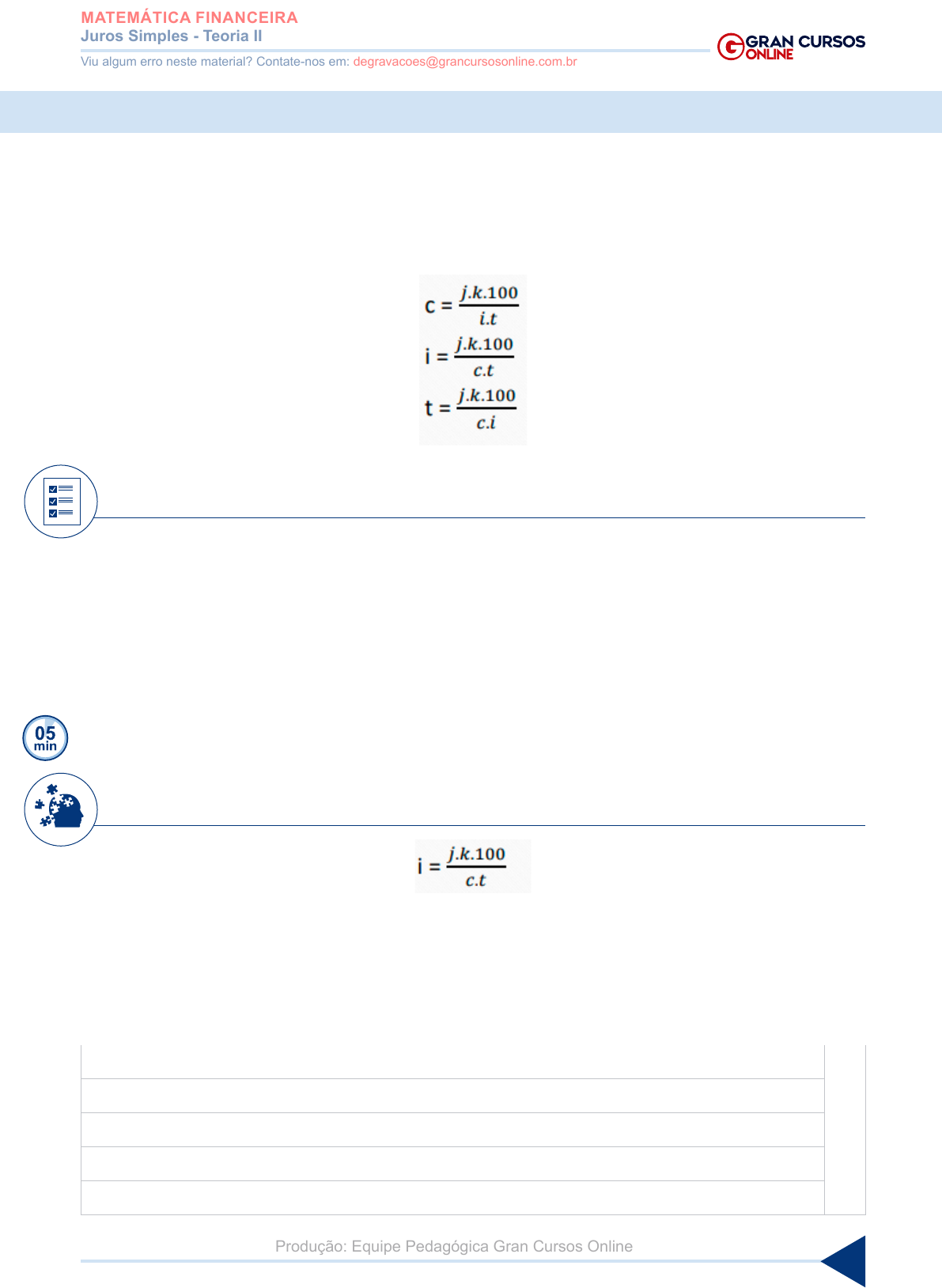 1 www.grancursosonline.com.br Juros Simples - Teoria II MATEMÁTICA FINANCEIRA Viu algum erro neste material? Contate-nos em: degravacoes@grancursosonline.com.br Produção: Equipe Pedagógica Gran Cursos Online MATEMÁTICA FINANCEIRA Juros Simples – Teoria II Outras fórmulas: Demonstração Direto do concurso 1. (FUNRIO/AL-RR/2018) Paulo contraiu uma dívida do Banco X, no valor de R$ 400,00 que foi quitada em dois trimestres, depois de contraída.A taxa li- near mensal praticada pelo Banco X, que teve como resultado a cobrança de juros de R$ 150,00, foi de a. 8,70%. b. 7,50%. c. 6,25% d. 5,10% Resolução c = R$ 400 i = ?% am t = 2 trimestres j = R$ 150 AN O TAÇ Õ ES http://www.grancursosonline.com.br 2 www.grancursosonline.com.br AN O TA Ç Õ ES Juros Simples - Teoria II MATEMÁTICA FINANCEIRA Viu algum erro neste material? Contate-nos em: degravacoes@grancursosonline.com.br Produção: Equipe Pedagógica Gran Cursos Online 150x1x100 → 150 = 25 → 6,25 400x6 4x6 4 Divide-se 150 por 6 e este resultado se dividirá por 4. OOss:� A “taxa linear” é outro nome utilizado para juros simples. Neste exemplo, K será igual 1, pois as unidades de tempo são as mesmas. 2. (VUNESP/Câmara da Estância Balneária de Itanhaém – SP/2017) Um capi- tal de R$ 1.500,00 aplicado a juro simples durante 9 meses rendeu juros de R$ 81,00. A taxa anual de juros dessa aplicação foi a. 7,2% b. 6,8% c. 6,3% d. 5,5% e. 5,2% Resolução c = R$ 1.500 i = ?% aa t = 9 meses j = R$ 81 81x12x100 → 9x12 Simplifica-se o 9 e o 15 dividindo-os por 3 → 3x12 → 36 = 7,2 1500x9 15 5 5 OOss:� Neste exemplo, a unidade de tempo é diferente para a taxa e para o tempo. Logo, deve-se descobrir o valor de K. O valor de K será 12, pois transforma-se de anos para meses. Para dividir um número por 5 mais rapidamente, deve-se dobrá-lo e depois deslocar a vírgula uma casa para a esquerda. 9 http://www.grancursosonline.com.br 3 www.grancursosonline.com.br AN O TAÇ Õ ES Juros Simples - Teoria II MATEMÁTICA FINANCEIRA Viu algum erro neste material? Contate-nos em: degravacoes@grancursosonline.com.br Produção: Equipe Pedagógica Gran Cursos Online 3. (FEPESE/Prefeitura de Criciúma – SC/Fiscal de Rendas e Tributos/2017) Um capital é aplicado à taxa de juros simples anual de 18%. Para que o mon- tante obtido com a aplicação seja 50% maior que o capital inicial investido, é necessário que o capital fique aplicado no mínimo: a. 16 meses. b. 22 meses. c. 28 meses. d. 34 meses. e. 42 meses. Resolução c = R$ 100 (capital falso) i = 18% aa t = ? meses m = R$ 150 (montante falso) j = Nesta questão, percebe-se que não é dado o valor do capital inicial. Por esse motivo, é necessário trabalhar com um capital falso, que poderá ser de qualquer valor. Nesse caso, para facilitar o cálculo, o valor falso para o capital é 100 e o montante falso será 150, pois está acrescido de 50% do valor do capital inicial. Transformando de meses para anos, K será igual a 12. 50x12x100 = 50x12 2 → Simplifica-se o 12 e o 18 dividindo-os por 6. 100x18 18 3 50x2 → 100 = 33,33 3 3 O tempo mínimo será de 33,33... meses. http://www.grancursosonline.com.br 4 www.grancursosonline.com.br AN O TA Ç Õ ES Juros Simples - Teoria II MATEMÁTICA FINANCEIRA Viu algum erro neste material? Contate-nos em: degravacoes@grancursosonline.com.br Produção: Equipe Pedagógica Gran Cursos Online 4. (IESES/CRA-SC/Agente Administrativo/2017) O capital de $ 1.000,00 foi aplicado gerando o montante de $ 1.600,00 no regime dos juros simples. Sabendo-se que a taxa de juros empregada foi de 36% ao ano, pergunta-se qual foi o prazo da aplicação? a. 20 meses. b. 24 meses. c. 18 meses. d. 22 meses. Resolução c = R$ 1.000 m = R$ 1.600 j = R$600 i = 36% aa t = ? meses O acréscimo de R$600,00 se refere aos juros. O valor de K será 12, pois transforma-se de anos para meses. 600x12x100 → 60x12 → Simplifica-se dividindo por 12. 60 = 20 meses 1000x36 36 3 5. (INSTITUTO AOCP/CASAN/ECONOMISTA/2016) Hipoteticamente, a CA- SAN captou um empréstimo junto ao governo federal para realizar investi- mentos em infraestrutura. Assinale a alternativa que apresenta o capital to- mado pela CASAN, que aplicado a juros simples de 1,5% a.m, produziu, em 12meses, um rendimento de R$2.700.000,00. a. R$ 35.000.000,00 b. R$ 25.000.000,00 c. R$ 22.000.000,00 http://www.grancursosonline.com.br 5 www.grancursosonline.com.br Juros Simples - Teoria II MATEMÁTICA FINANCEIRA Viu algum erro neste material? Contate-nos em: degravacoes@grancursosonline.com.br Produção: Equipe Pedagógica Gran Cursos Online d. R$ 18.000.000,00 e. R$ 15.000.000,00 Resolução i =1,5 % am t = 12 meses c = ? j = R$ 2.700.000 27000000x1000 → 2700000000 → R$15000000 (c) 15x12 180 Para eliminar a vírgula, basta observar quantas casas decimais a sucedem para depois acrescentar os zeros correspondentes. Neste caso, há uma casa decimal após a vírgula, motivo pelo qual se acrescentou apenas um 0 após o 100. OOss:� O rendimento se refere aos juros. GABARITO 1s c 2s a 3s d 4s a 5s e ����������������������������Este material foi elaborado pela equipe pedagógica do Gran Cursos Online, de acordo com a aula preparada e ministrada pelo professor Marcelo Leite. A presente degravação tem como objetivo auxiliar no acompanhamento e na revisão do con- teúdo ministrado na videoaula. Não recomendamos a substituição do estudo em vídeo pela leitura exclusiva deste material. http://www.grancursosonline.com.br