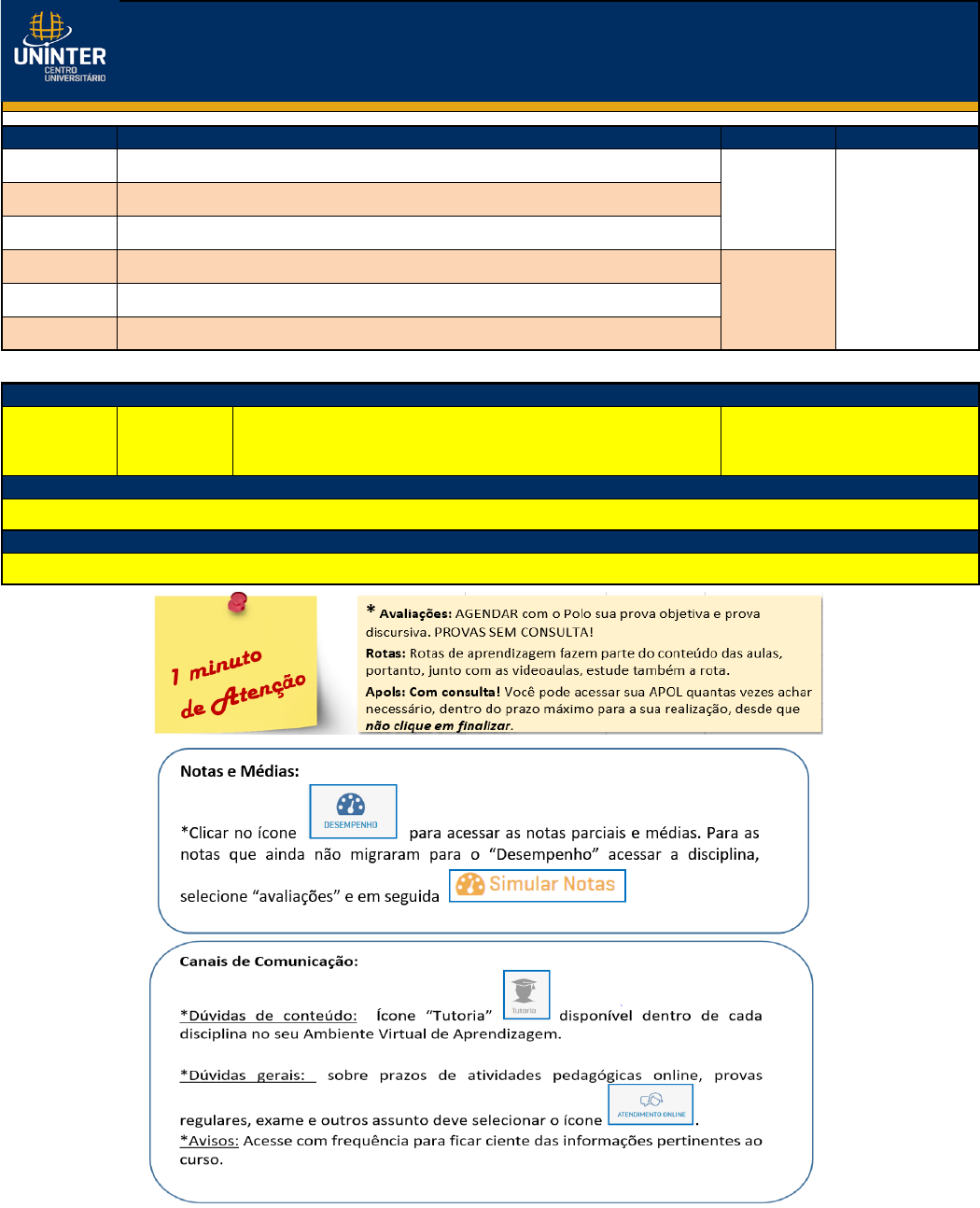 SEMANA APOL ATIVIDADE PRÁTICA 1ª semana APOL 1 7ª, 8ª e 9ª Verificar Calendário Acadêmico e/ou Avisos Estudar todos os materiais indicados acima Bons Estudos Atenciosamente Coordenação e Tutoria Conforme Calendário Acadêmico APOL 2 (*) Para ampliar seu conhecimento, assista as Aulas Práticas disponíveis no seu AVA. AULA 5 - Assistir a video aula 5 - Ler o texto da rota de aprendizagem. Assistir à Aula Prática sobre o tema teórico (*) AULA 6 - Assistir a video aula 6 - Ler o texto da rota de aprendizagem. Assistir à Aula Prática sobre o tema teórico (*) Segunda Chamada, Substitutiva, Exames e Recuperação de Conceito Pago(RCP) - Consulte o Atendimento Online Prof. Priscila Bolzan, Mestra AVALIAÇÕES REGULARES * Provas Objetivas, Provas Discursivas AVALIAÇÕES DE RECUPERAÇÃO 2ª semana Softwares necessários para realização das provas Esta disciplina não precisa de Software para realização das provas 6ª semana 3ª semana 4ª semana 5ª semana Verificar Avaliações/Trabalhos e Calendário Acadêmico Conforme Calendário Acadêmico CRONOGRAMA SEMANAL Disciplina: Eletrotécnica Básica O QUE ESTUDAR AULA 1 - Assistir a video aula 1 - Ler o texto da rota de aprendizagem. Assistir à Aula Prática sobre o tema teórico (*) AULA 2 - Assistir a video aula 2 - Ler o texto da rota de aprendizagem. Assistir à Aula Prática sobre o tema teórico (*) AULA 3 - Assistir a video aula 3 - Ler o texto da rota de aprendizagem. Assistir à Aula Prática sobre o tema teórico (*) AULA 4 - Assistir a video aula 4 - Ler o texto da rota de aprendizagem. Assistir à Aula Prática sobre o tema teórico (*)
