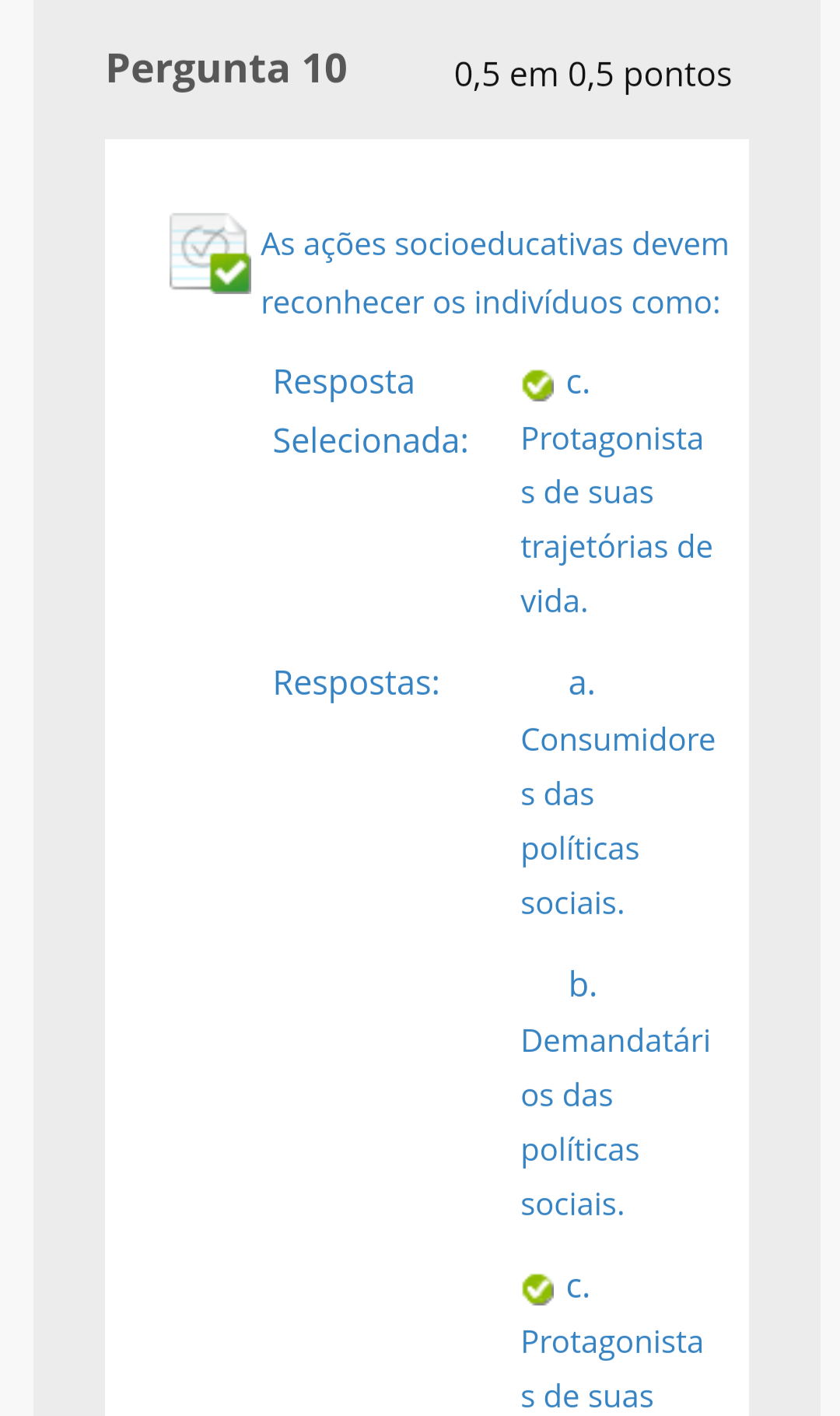 As ações socioeducativas devem reconhecer os indivíduos como: a. Consumidore S das políticas sociais. b. Demandatári os das políticas sociais. C. Protagonista S de suas trajetórias de vida.