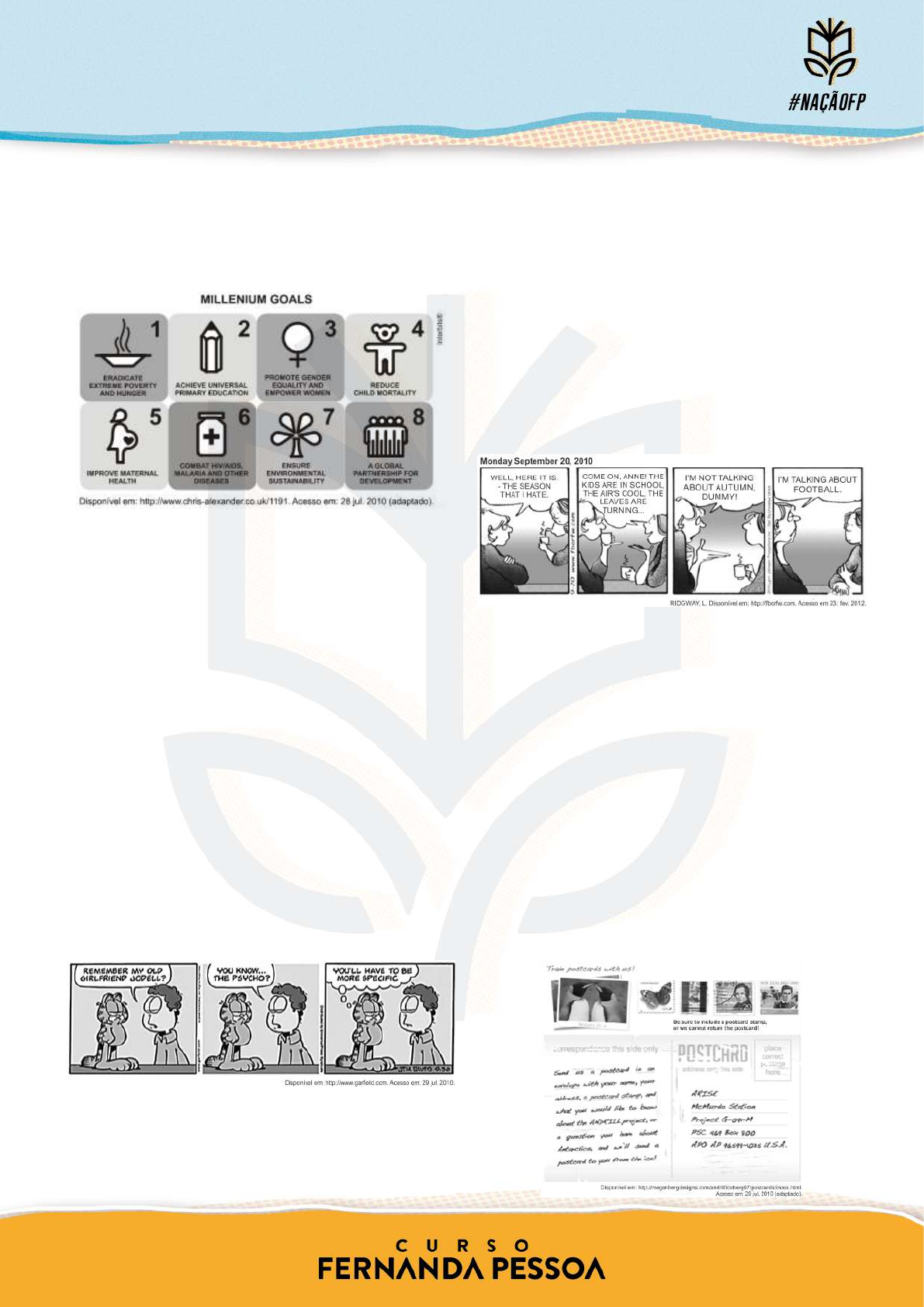 1 SIMULADO ESPECIAL 07 | 1º DIA PROVA DE LINGUAGENS, CÓDIGOS E SUAS TECNOLOGIAS E REDAÇÃO PROVA DE CIÊNCIAS HUMANAS E SUAS TECNOLOGIAS LINGUAGENS, CÓDIGOS E SUAS TECNOLOGIAS QUESTÕES 1 A 45 QUESTÕES 1 A 05 (OPÇÃO INGLÊS) 1. (ENEM) Definidas pelos países membros da Organização das Nações Unidas e por organizações internacionais, as metas de desenvolvimento do milênio envolvem oito objetivos a serem alcançados até 2015. Apesar da diversidade cultural, esses objetivos, mostrados na imagem, são comuns ao mundo todo, sendo dois deles: a) O combate a AIDS e a melhoria do ensino universitário. b) A redução da mortalidade adulta e a criação de parcerias globais. c) A promoção da igualdade de gêneros e a erradicação da pobreza. d) A parceria global para o desenvolvimento e a valorização das crianças. e) A garantia da sustentabilidade ambiental e o combate ao trabalho infantil. 2. (ENEM) A tira, definida como um segmento de história em quadrinhos, pode transmitir uma mensagem com efeito de humor. A presença desse efeito no diálogo entre Jon e Garfield acontece porque a) Jon pensa que sua ex-namorada é maluca e que Garfield não sabia disso. b) JodelI é a única namorada maluca que Jon teve, e Garfield acha isso estranho. c) Garfield tem certeza de que a ex-namorada de Jon é sensata, o maluco é o amigo. d) Garfield conhece as ex-namoradas de Jon e considera mais de uma como maluca. e) Jon caracteriza a ex-namorada como maluca e não entende a cara de Garfield. 3. (ENEM) Na tira da série For better or for worse, a comunicação entre as personagens fica comprometida em um determinado momento porque a) as duas amigas divergem de opinião sobre futebol. b) uma das amigas desconsidera as preferências da outra. c) uma das amigas ignora que o outono é temporada de futebol. d) uma das amigas desconhece a razão pela qual a outra a maltrata. e) as duas amigas atribuem sentidos diferentes a palavra season. 4. (ENEM) 2 Os cartões-postais costumam ser utilizados por viajantes que desejam enviar noticias dos lugares que visitam a parentes e amigos. Publicado no site do projeto ANDRILL, o texto em formato de cartão-postal tem o propósito de a) comunicar o endereço da nova sede do projeto nos Estados Unidos. b) convidar colecionadores de cartões-postais a se reunirem em um evento. c) anunciar uma nova coleção de selos para angariar fundos para a Antártica. d) divulgar as pessoas a possibilidade de receberem um cartão-postal da Antártica. e) solicitar que as pessoas visitem o site do mencionado projeto com maior frequência. 5. (ENEM) Na fase escolar, é prática comum que os professores passem atividades extraclasse e marquem uma data para que as mesmas sejam entregues para correção. No caso da cena da charge, a professora ouve uma estudante apresentando argumentos para a) discutir sobre o conteúdo do seu trabalho já entregue. b) elogiar o tema proposto para o relatório solicitado. c) sugerir temas para novas pesquisas e relatórios. d) reclamar do curto prazo para entrega do trabalho. e) convencer de que fez o relatório solicitado. LINGUAGENS, CÓDIGOS E SUAS TECNOLOGIAS QUESTÕES 1 A 45 QUESTÕES 1 A 05 (OPÇÃO ESPANHOL) 1. (ENEM) A persongem Susanita, no último quadro, inventa o vocábulo mujerez, utilizando um recurso de formação de palavra existente na língua espanhola. Na concepção da personagem, o sentido do vocábulo mujerez remete à a) falta de feminilidade das mulheres que não se dedicam às tarefas domésticas. b) valorização das mulheres que realizam todas as tarefas domésticas. c) inferioridade das mulheres que praticam as tarefas domésticas. d) relevância social das mulheres que possuem empregados para realizar as tarefas domésticas. e) independência das mulheres que não se prendem apenas às tarefas domésticas. 2. (ENEM) A charge evoca uma situação de disputa. Seu efeito humorístico reside no(a) 3 a) aceitação imediata da provocação. b) descaracterização do convite a um desafio. c) sugestão de armas não convencionais para um duelo. d) deslocamento temporal do comentário lateral. e) posicionamento relaxado dos personagens. 3. (ENEM) !BRINCANDO! KangaROOS llega a México con diseños atléticos, pero muy fashion. Tienen un toque vintage con diferentes formas y combinaciones de colores. Lo más cool de estos tenis es que tienen bolsas para guardar llaves o dinero. Son ideales para hacer ejercicio y con unos jeans obtendras un look urbano. www.kangaroos.com Revista Glamour Latinoamérica. México, mar. 2010. O texto publicitário utiliza diversas estratégias para enfatizar as características do produto que pretende vender. Assim, no texto, o uso de vários termos de outras línguas, que não a espanhola, tem a intenção de a) atrair a atenção do público alvo dessa propaganda. b) popularizar a prática de exercícios esportivos. c) agradar aos compradores ingleses desse tênis. d) incentivar os espanhóis a falarem outras línguas, e) enfatizar o conhecimento de mundo do autor do texto. 4. (ENEM) As marcas de primeira pessoa do plural no texto da campanha de amamentação têm como finalidade a) incluir o enunciador no discurso para expressar formalidade. b) agregar diversas vozes para impor valores às lactantes. c) forjar uma voz coletiva para garantir adesão à campanha. d) promover uma identificação entre o enunciador e o leitor para aproximá-los. e) remeter à voz institucional promotora da campanha para conferir-lhe credibilidade. 5. (ENEM) A acessibilidade é um tema de relevância tanto na esfera pública quanto na esfera privada. No cartaz, a exploração desse tema destaca a importância de se a) estimular os cadeirantes na superação de barreiras. b) respeitar o estacionamento destinado a cadeirantes. c) identificar as vagas reservadas aos cadeirantes. d) eliminar os obstáculos para o trânsito de cadeirantes. e) facilitar a locomoção de cadeirantes em estacionamentos. 4 QUESTÕES 06 A 45