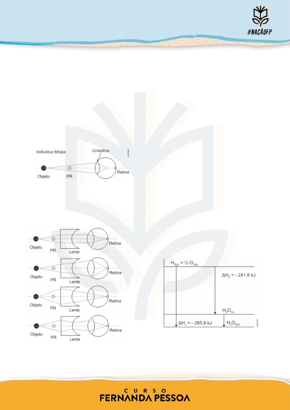 1 CIÊNCIAS DA NATUREZA E SUAS TECNOLOGIAS QUESTÕES DE 91 A 135 91. (FUVEST) O olho humano constitui uma complexa estrutura capaz de controlar a luz recebida e produzir imagens nítidas. Em pessoas com visão normal, o olho é capaz de acomodar o cristalino para focalizar sobre a retina a luz que vem dos objetos, desde que não estejam muito próximos. Pessoas míopes, por outro lado, apresentam dificuldades em enxergar de longe. Ao focalizar objetos situados além do chamado ponto remoto (PR), a imagem forma-se à frente da retina, conforme ilustrado na figura. Neste caso, lentes corretivas são necessárias a fim de que o indivíduo observe o objeto de forma nítida. Qual arranjo esquemático melhor descreve a correção realizada por uma lente receitada por um oftalmologista no caso de um indivíduo míope? a) b) c) d) e) 92. (FMJ) A tomografia por emissão de pósitrons é um exame da medicina nuclear que utiliza elementos radioativos que decaem por emissão de pósitrons, que são antipartículas do elétron. Após ser emitido, o pósitron encontra um elétron das células do paciente, ocorre a aniquilação de ambos e criam-se dois fótons de radiação gama. O equipamento detecta essa radiação e constrói a imagem da região do interior do corpo do paciente. De acordo com a Teoria da Relatividade, a relação entre massa (m) e energia (E) é dada pela expressão E=mc², sendo c a velocidade da luz no vácuo igual a 3×108 m/s. Considerando-se a massa do elétron igual a 9×10-31 kg, a quantidade de energia associada a cada fóton da radiação gama resultante da aniquilação de um par elétron-pósitron é a) 4,0×10-15 J. b) 2,7×10-38 J. c) 8,1×10-14 J. d) 1,6×10-19 J. e) 1,6×10-13 J. 93. (FMC) O calor liberado na condensação do vapor de água é, em parte, responsável pelo aquecimento da superfície da nossa pele dentro de uma sauna a vapor. De acordo com o diagrama abaixo, o calor liberado em kJ, quando um mol de H2O(v) se transforma em um mol de H2O(líq) (condensação), é de: a) – 44 b) – 28.6 c) 44 d) 241.8 e) 285.8 SIMULADO ESPECIAL 14 | 2º DIA PROVA DE CIÊNCIAS DA NATUREZA E SUAS TECNOLOGIAS E PROVA DE MATEMÁTICA E SUAS TECNOLOGIAS 2 94. (FUVEST) Os gráficos mostram a variação nas taxas de emigração, imigração, mortalidade e natalidade de uma dada população de mamíferos ao longo de 20 anos. Com base nesses gráficos, o tamanho dessa população deve a) diminuir nos 5 primeiros anos e manter-se constante no restante do período considerado. b) manter-se constante nos 5 primeiros anos e diminuir no restante do período considerado. c) diminuir continuamente ao longo do período considerado. d) manter-se constante ao longo do período considerado. e) aumentar nos 5 primeiros anos e diminuir no restante do período considerado. 95. (FMP) A figura abaixo ilustra a síntese de secreção de hormônios peptídicos. Os números 1, 2, 3 e 4 correspondem, respectivamente, a a) ribossomo, núcleo, aparelho de Golgi e lisossomos b) mesossomo, aparelho de Golgi, ribossomos e retículo endoplasmático liso c) núcleo, retículo endoplasmático rugoso, aparelho de Golgi e vesículas secretoras d) mitocôndria, lisossomo, retículo endoplasmático liso e núcleo e) retículo endoplasmático rugoso, vesículas secretoras, ribossomo e mitocôndrias TEXTO PARA A PRÓXIMA QUESTÃO: Por que o biogás é uma opção de energia renovável? O biogás é um biocombustível gasoso produzido a partir da decomposição da matéria orgânica por bactérias fermentadoras, em um processo chamado biodegradação anaeróbia, isto é, o processo ocorre na ausência de oxigênio. Nesse processo, produz-se um gás rico em metano (de 40% a 80% de sua composição, sendo o resto dióxido de carbono e pequenas quantidades de hidrogênio, nitrogênio, amônia, ácido sulfídrico, entre outros). Para gerar energia elétrica usando biogás, utiliza-se a conversão da energia química do gás em energia mecânica, por meio de um processo controlado de combustão, que ativa um gerador. O biogás também pode ser purificado para a geração de biometano, que é equivalente ao gás natural veicular. A tabela a seguir compara as composições químicas médias dos principais componentes do biogás e do biometano. Gás Principais componentes (% em volume) Biogás 60% metano; 40% dióxido de carbono Biometano 95% metano; 5% dióxido de carbono 96. (UNESP) Quando se comparam volumes iguais de biogás e de biometano sob pressão de 2,0 atm, é possível calcular a diferença: 3 Pressão parcial de metano no biometano – Pressão parcial de metano no biogás O valor dessa diferença é a) 0,20 atm. b) 0,35 atm. c) 1,05 atm. d) 0,70 atm. e) 1,5 atm. 97. (FUVEST) Os smartphones modernos vêm equipados com um acelerômetro, dispositivo que mede acelerações a que o aparelho está submetido. O gráfico foi gerado a partir de dados extraídos por um aplicativo do acelerômetro de um smartphone pendurado por um fio e colocado para oscilar sob a ação da gravidade. O gráfico mostra os dados de uma das componentes da aceleração (corrigidos por um valor de referência constante) em função do tempo. Com base nos dados do gráfico e considerando que o movimento do smartphone seja o de um pêndulo simples a ângulos pequenos, o comprimento do fio é de aproximadamente: Note e adote: Use π = 3. Aceleração da gravidade: g = 10 m/s² . a) 5 cm b) 10 cm c) 50 cm d) 100 cm e) 150 cm 98. (ESPCEX (AMAN)) Em química orgânica existem várias apresentações de fórmulas, como fórmulas moleculares e percentuais. A fórmula molecular indica o número de átomos de cada elemento em uma molécula da substância. A fórmula percentual indica a porcentagem, em massa, de cada elemento que constitui a substância. Uma maneira de determinação dessa fórmula é a partir da fórmula molecular, aplicando-se conceitos de massa atômica e massa molecular. FONSECA, Martha Reis Marques da, Química Geral, São Paul