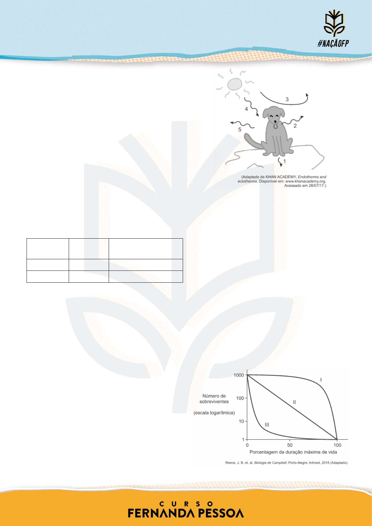 1 CIÊNCIAS DA NATUREZA E SUAS TECNOLOGIAS QUESTÕES DE 91 A 135 91. (ENEM - ADAPTADA) O carro flex é uma realidade no Brasil. Estes veículos estão equipados com motor que tem a capacidade de funcionar com mais de um tipo de combustível. No entanto, as pessoas que têm esse tipo de veículo, na hora do abastecimento, têm sempre a dúvida: álcool ou gasolina? Para avaliar o consumo desses combustíveis, realizou-se um percurso com um veículo flex, consumindo 50 litros de gasolina e no percurso de volta utilizou-se etanol. Foi considerado o mesmo consumo de energia tanto no percurso de ida quanto no de volta. O quadro resume alguns dados aproximados sobre esses combustíveis. Combustível Densidade (g mL-1) Calor de combustão (kcal g-1) Etanol 0,8 -6 Gasolina 0,5 -10 O volume de etanol combustível, em litro, consumido no percurso de volta é mais próximo de a) 27. b) 32. c) 37. d) 48. e) 52. 92. (UNICAMP) Mesmo em manhãs bem quentes, é comum ver um cão tomando sol. O pelo do animal esquenta e sua língua do lado de fora sugere que ele está cansado. O pelo do animal está muito quente, mas mesmo assim o cão permanece ao sol, garantindo a produção de vitamina D3. Durante essa exposição ao sol, ocorrem transferências de energia entre o cão e o ambiente, por processos indicados por números na figura abaixo. Em ordem crescente, os números correspondem, respectivamente, aos processos de a) convecção, evaporação, radiação, condução e radiação. b) convecção, radiação, condução, radiação e evaporação. c) condução, evaporação, convecção, radiação e radiação. d) condução, radiação, convecção, evaporação e radiação. e) condução, convecção, convecção, radiação e evaporação. 93. (UFU - ADAPTADA) A figura abaixo representa curvas de sobrevivência idealizadas: tipos I, II e III. O eixo y é logarítmico e o eixo x está numa escala relativa para que espécies com durações de vida amplamente diversas possam ser apresentadas juntas no mesmo gráfico. Sobre essas curvas, são feitas as seguintes afirmativas. SIMULADO ESPECIAL 18 | 2º DIA PROVA DE CIÊNCIAS DA NATUREZA E SUAS TECNOLOGIAS E PROVA DE MATEMÁTICA E SUAS TECNOLOGIAS 2 1. A curva tipo I representa mamíferos de grande porte, incluindo os seres humanos, que produzem proles pequenas, mas as provêm com bons cuidados. 2. A curva tipo III está associada a organismos que produzem números muito pequenos de descendentes e proporcionam pouco ou nenhum cuidado como, por exemplo, muitos peixes e a maioria dos invertebrados marinhos. 3. A curva tipo II apresenta uma taxa de mortalidade constante ao longo da vida do organismo, como acontece com invertebrados e com plantas anuais, por exemplo. 4. Em III, a mortalidade costuma ser alta entre os indivíduos mais jovens, mas consideravelmente constante entre os adultos (como a curva do tipo II). Assinale a alternativa que apresenta as afirmativas corretas. a) Apenas 3 e 4. b) Apenas 1 e 2. c) Apenas 2 e 3. d) Apenas 1, 3 e 4. e) Apenas 2 e 4. 94. (UNESP) A figura mostra um experimento realizado com duas espécies de gramíneas, A e B. As gramíneas foram inicialmente plantadas em uma curta faixa nos extremos opostos de duas caixas retangulares contendo solo. As caixas foram acondicionas em ambientes separados e submetidas à mesma intensidade luminosa. Por semanas, ambas as caixas foram regadas igualmente, mas uma delas foi mantida a 10°C e a outra, a 40°C. O gráfico que melhor representa a variação da taxa de fotossíntese de ambas as espécies, em relação às temperaturas a que foram submetidas, é: a) b) c) d) e) 95. (UEL) Leia o texto a seguir. O lançamento sem tratamento prévio de efluentes, de origem doméstica ou industrial, em uma grande variedade de ambientes aquáticos, pode levar mananciais de água doce a apresentarem alto grau de poluição ou até mesmo a sua morte, constituindo fator de preocupação. (Adaptado de: BARRETO, L.E. et al. Eutrofização em rios brasileiros. Enciclopédia Biosfera. v.9, n 16, 2013, p. 2165–2179.) Com base no texto e nos conhecimentos sobre eutrofização ou eutroficação, considere as afirmativas a seguir. I. Quanto maior a quantidade de nitrogênio e fósforo no rio ou na lagoa, menor será o consumo de oxigênio pelos microrganismos existentes no ambiente; isso ocorre porque tanto os minerais quanto os microrganismos concorrem pelo oxigênio dissolvido na água. II. O nitrogênio e o fósforo são nutrientes de grande importância para os mais diferentes tipos de cadeias alimentares aquáticas e terrestres, porém, quando em baixas concentrações e associados às más condições de luminosidade, provocam nos rios e lagos um fenômeno chamado de eutrofização. III. Como consequência da eutrofização, a água pode apresentar as seguintes alterações: sabor, odor, cor, redução do oxigênio dissolvido, crescimento excessivo de plantas aquáticas, mortandade de peixes e de outras espécies aquáticas, além do comprometimento das condições mínimas para o lazer. 3 IV. Um dos problemas da aceleração do processo de eutrofização é o aumento da probabilidade de proliferação de cianobactérias, as quais por serem potencialmente tóxicas podem alterar a qualidade das águas, comprometendo o abastecimento público. Assinale a alternativa correta. a) Somente as afirmativas I e II são corretas. b) Somente as afirmativas I e IV são corretas. c) Somente as afirmativas III e IV são corretas. d) Somente as afirmativas I, II e III são corretas. e) Somente as afirmativas II, III e IV são corretas. 96. (UFJF-PISM 3) “John apanha um pouco de lenha, mas os pedaços são grandes demais e as lufadas de vento não deixam o fogo pegar. É preciso rachar a madeira para que as lascas se inflamem. Volto aos pinheiros raquíticos para procurar o facão de mato. [...] O vento sopra com tanta força que as labaredas não alcançam a carne”. Fonte: Zen e a arte da manutenção de motoc