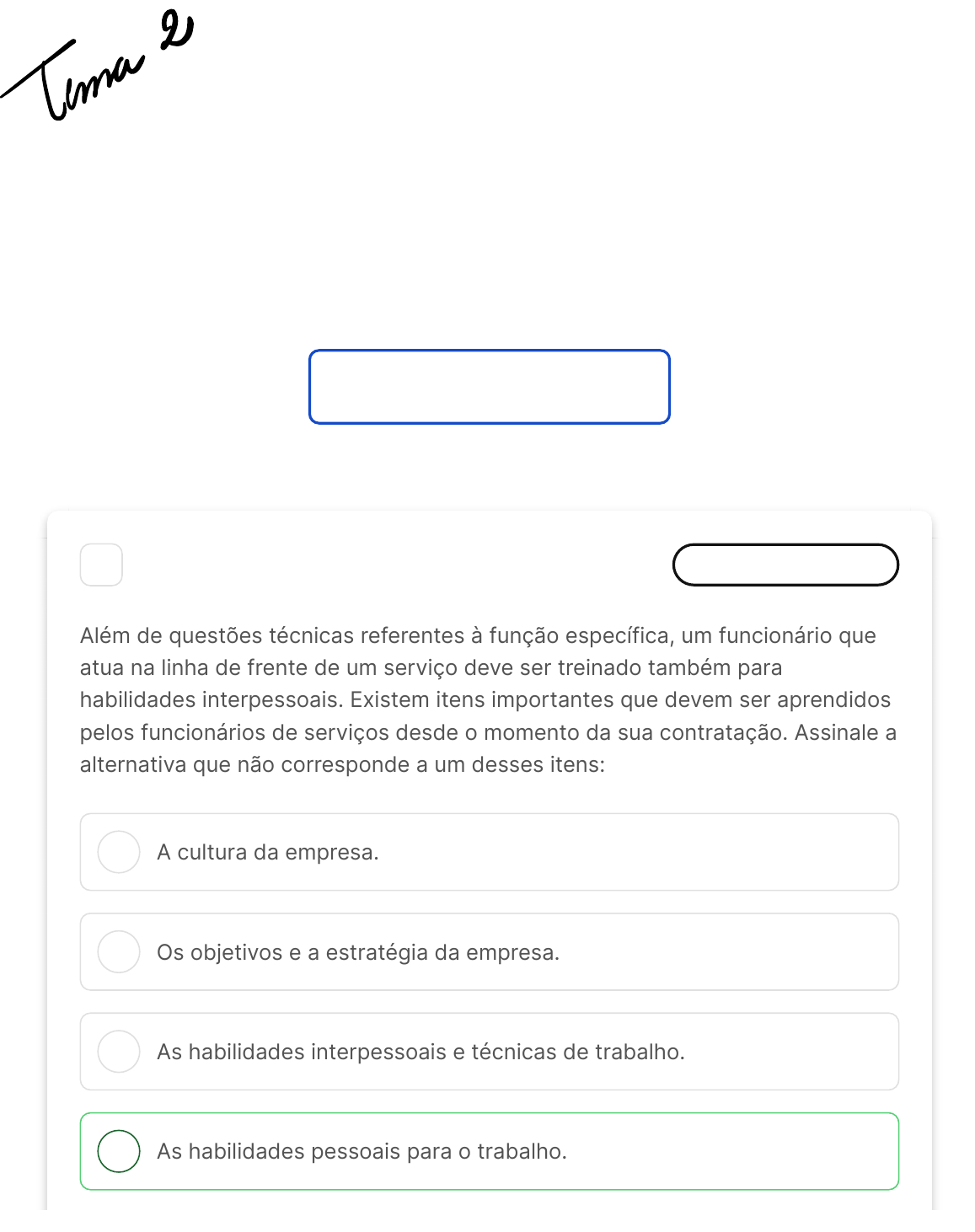 Você acertou 5 de 10 questões Verifique o seu desempenho e continue treinando! Você pode refazer o exercício quantas vezes quiser. Verificar Desempenho A B C D 1 Marcar para revisão Além de questões técnicas referentes à função específica, um funcionário que atua na linha de frente de um serviço deve ser treinado também para habilidades interpessoais. Existem itens importantes que devem ser aprendidos pelos funcionários de serviços desde o momento da sua contratação. Assinale a alternativa que não corresponde a um desses itens: A cultura da empresa. Os objetivos e a estratégia da empresa. As habilidades interpessoais e técnicas de trabalho. As habilidades pessoais para o trabalho. E O conhecimento técnico sobre o produto ou serviço. Resposta incorreta Opa! A alternativa correta é a letra D. Confira o gabarito comentado! Gabarito Comentado A alternativa "As habilidades pessoais para o trabalho", não corresponde a um dos itens que devem ser aprendidos pelos funcionários de serviços desde o momento da sua contratação. Isso ocorre porque as habilidades pessoais são características individuais e inerentes a cada pessoa, não podendo ser ensinadas ou adquiridas por meio de treinamento. As demais alternativas, como a cultura da empresa, os objetivos e a estratégia da empresa, as habilidades interpessoais e técnicas de trabalho e o conhecimento técnico sobre o produto ou serviço, são aspectos que podem e devem ser ensinados e aprimorados por meio de treinamentos e capacitações. 2 Marcar para revisão A literatura sobre serviços identifica três tipos de ciclo para descrever como as empresas podem determinar fracasso, mediocridade e sucesso. Leia as afirmativas a seguir: I - O ciclo do fracasso envolve uma estratégia de baixos salários e alta rotatividade de funcionários, o que resulta em alto nível de insatisfação de clientes e deserções que reduzem as margens de lucro. II - O ciclo da mediocridade é encontrado em grandes empresas menores e menos burocráticas, que oferecem segurança no emprego, com um escopo restrito do trabalho em si. III - Empresas de serviços bem-sucedidas atuam no ciclo de sucesso em que os funcionários estão satisfeitos com seus empregos e são produtivos; por decorrência, os clientes estão satisfeitos e são fiéis. A B C D E decorrência, os clientes estão satisfeitos e são fiéis. Avalie qual ou quais afirmativas estão corretas: I, apenas. I e II, apenas. I e III, apenas. II e III, apenas. III, apenas. Resposta incorreta Opa! A alternativa correta é a letra C. Confira o gabarito comentado! Gabarito Comentado As afirmativas I e III estão corretas. A afirmativa I descreve o ciclo do fracasso, onde uma estratégia de baixos salários e alta rotatividade de funcionários leva a um alto nível de insatisfação dos clientes e deserções, reduzindo as margens de lucro. A afirmativa III descreve o ciclo de sucesso, onde empresas de serviços bem-sucedidas têm funcionários satisfeitos e produtivos, resultando em clientes satisfeitos e fiéis. A afirmativa II, no entanto, não está correta, pois o ciclo da mediocridade não é necessariamente encontrado em grandes empresas menores e menos burocráticas. A B C D E 3 Marcar para revisão O trabalho dos funcionários da linha de frente pode tornar-se difícil e estressante. Assinale a alternativa que não corresponde a uma das fontes de conflito enfrentadas por esses profissionais: Conflitos entre a empresa e o cliente. Conflito do funcionário com o papel desempenhado. Conflitos entre os clientes. Trabalho e estresse emocional. Conflito com as metas. Resposta correta Parabéns, você selecionou a alternativa correta. Confira o gabarito comentado! Gabarito Comentado A alternativa correta é: "Conflito com as metas". No entanto, é importante notar que essa opção não corresponde a uma fonte de conflito enfrentada pelos profissionais da linha de frente. As metas são estabelecidas pela empresa e, embora possam ser desafiadoras, não são uma fonte de conflito direto. As outras alternativas, por outro lado, representam situações que podem gerar conflitos diretos no ambiente de trabalho, como desentendimentos entre a empresa e o cliente, conflitos internos do funcionário em relação ao seu papel, conflitos entre os próprios clientes e o A B C D E funcionário em relação ao seu papel, conflitos entre os próprios clientes e o estresse emocional causado pelo trabalho. 4 Marcar para revisão As metas são importantes para motivar os funcionários e dar-lhes senso de direção. No processo de formulação das metas, existem alguns pontos importantes que devem ser considerados. Identifique a afirmativa incorreta em relação a esses pontos: Cumprir metas é, em si, uma recompensa, se elas forem consideradas relevantes. As empresas podem utilizar o cumprimento de metas como forma de recompensas. Metas específicas e difíceis devem ser determinadas de forma privada para serem aceitas. A empresa deve produzir relatórios de acompanhamento do cumprimento de metas caso seu objetivo seja atender à necessidade de autoestima dos funcionários. O acompanhamento e o feedback no decorrer da atividade servem como função corretiva para atingir as metas. Resposta correta Parabéns, você selecionou a alternativa correta. Confira o gabarito comentado! A B C Gabarito Comentado A afirmação de que "Metas específicas e difíceis devem ser determinadas de forma privada para serem aceitas" não é verdadeira. Na verdade, a definição de metas deve ser um processo transparente e participativo. Os funcionários devem ter a oportunidade de contribuir para a definição de metas, pois isso aumenta o comprometimento e a motivação para alcançá- las. Além disso, metas difíceis e específicas devem ser comunicadas de forma clara e aberta para todos os envolvidos, para garantir que todos compreendam o que é esperado deles e como seu desempenho será avaliado. 5 Marcar para revisão 