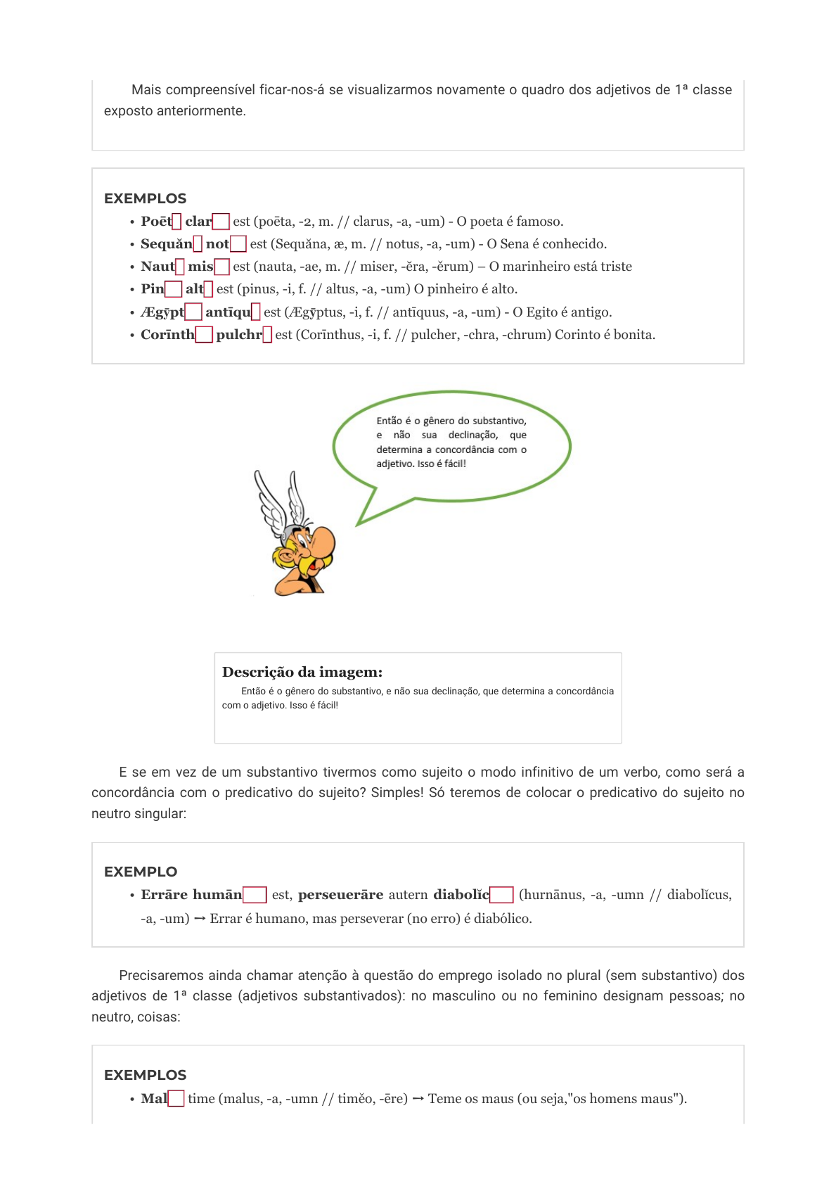 Mais compreensível ficar-nos-á se visualizarmos novamente o quadro dos adjetivos de 1ª classe exposto anteriormente. EXEMPLOS • Poēta clarus est (poēta, -2, m. // clarus, -a, -um) - O poeta é famoso. • Sequăna notus est (Sequăna, æ, m. // notus, -a, -um) - O Sena é conhecido. • Nauta miser est (nauta, -ae, m. // miser, -ĕra, -ěrum) – O marinheiro está triste • Pinus alta est (pinus, -i, f. // altus, -a, -um) O pinheiro é alto. • Ægȳptus antīqua est (Ægȳptus, -i, f. // antīquus, -a, -um) - O Egito é antigo. • Corīnthus pulchra est (Corīnthus, -i, f. // pulcher, -chra, -chrum) Corinto é bonita. Descrição da imagem: Então é o gênero do substantivo, e não sua declinação, que determina a concordância com o adjetivo. Isso é fácil! E se em vez de um substantivo tivermos como sujeito o modo infinitivo de um verbo, como será a concordância com o predicativo do sujeito? Simples! Só teremos de colocar o predicativo do sujeito no neutro singular: EXEMPLO • Errāre humānum est, perseuerāre autern diabolĭcum (hurnānus, -a, -umn // diabolĭcus, -a, -um) ➙ Errar é humano, mas perseverar (no erro) é diabólico. Precisaremos ainda chamar atenção à questão do emprego isolado no plural (sem substantivo) dos adjetivos de 1ª classe (adjetivos substantivados): no masculino ou no feminino designam pessoas; no neutro, coisas: EXEMPLOS • Malos time (malus, -a, -umn // timěo, -ēre) ➙ Teme os maus (ou seja,"os homens maus"). 44