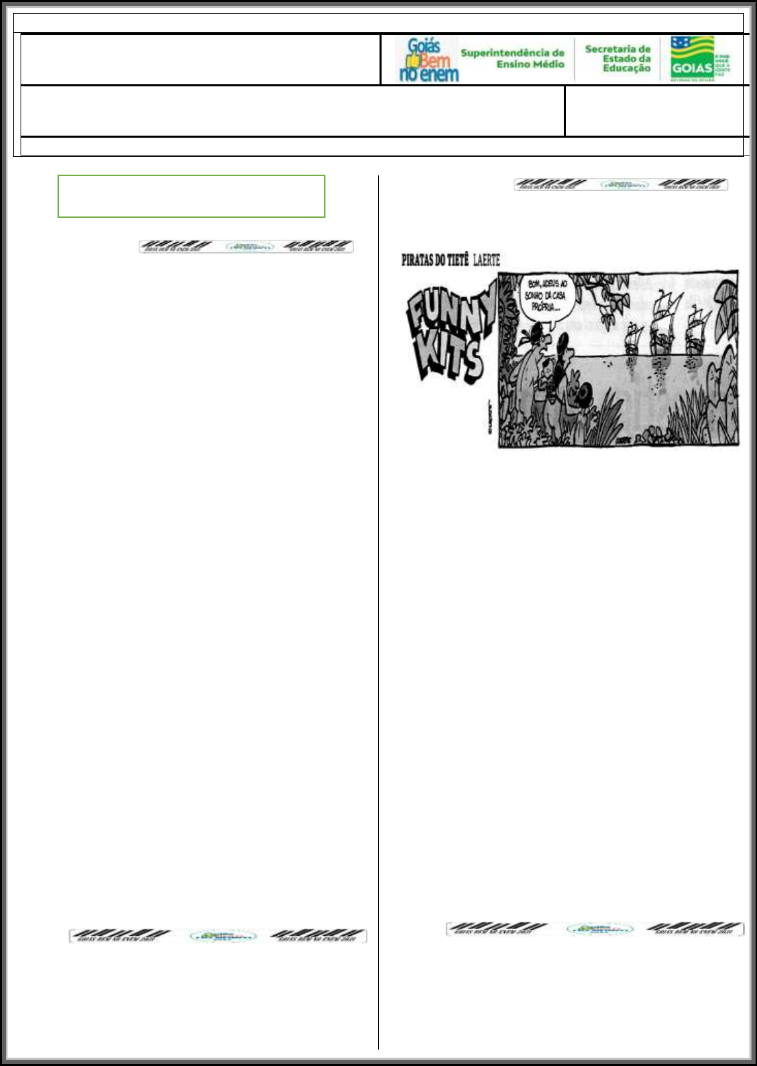 ENEM SERIADO LISTA 11 DESAFIO WEEKEND TEMA: QUINHENTISMO DATA: ___/____/2021. NOME: QUESTÃO 01 (ETEC-SP/2020) Leia o texto a seguir. A Carta de Pero Vaz de Caminha Ali veríeis galantes, pintados de preto e vermelho, e quartejados, assim pelos corpos como pelas pernas, que, certo, assim pareciam bem. Também andavam entre eles quatro ou cinco mulheres, novas, que assim nuas, não pareciam mal. Entre elas andava uma, com uma coxa, do joelho até o quadril e a nádega, toda tingida daquela tintura preta; e todo o resto da sua cor natural. Outra trazia ambos os joelhos com as curvas assim tintas, e também os colos dos pés; e suas vergonhas tão nuas, e com tanta inocência assim descobertas, que não havia nisso desvergonha nenhuma. Disponível em: http://gg.gg/ukzyk Acesso em: 17.10.2019. A partir da leitura do trecho, é possível afirmar que o excerto pertence ao movimento literário (A) Barroco, pois manifesta conflitos e oposições do narrador. (B) Trovadorismo, pois demonstra um viés litúrgico e melódico. (C) Humanismo, pois apresenta uma prosa doutrinária, dirigida à nobreza. (D) Quinhentismo, pois trata-se de uma escrita de (E) Realismo, pois o ambiente social é valorizado, assim como o contexto político e econômico. QUESTÃO 02 (IFSP/2014) Leia a tirinha a seguir. (Laerte, Folha de S. Paulo, 28.12.2011. Original colorido) Essa tirinha pode ser associada, corretamente, (A) ao Quinhentismo no Brasil, pois as cartas escritas pelos jesuítas descreviam o trabalho dos missionários na preservação das crenças. (B) ao Quinhentismo no Brasil, pois a literatura desse período tinha como um de seus objetivos informar Portugal sobre as novas terras e incentivar a vinda de colonos. (C) a Os Lusíadas, pois Camões se utiliza de elementos da mitologia indígena para elaborar a parte ficcional de sua epopeia. (D) a Os Lusíadas, visto que o foco central da narrativa são as viagens realizadas pelos portugueses para descobrir e colonizar terras. (E) ao Barroco, pois, em seus sonetos, Gregório de Matos valoriza a sensualidade da mulher indígena e menospreza a mulher europeia. LÍNGUA PORTUGUESA 2 QUESTÃO 03 (IFSP/2014) Leia um trecho do poema Ilha da Maré, do escritor brasileiro Manuel Botelho de Oliveira. E, tratando das próprias, os coqueiros, galhardos e frondosos criam cocos gostosos; e andou tão liberal a natureza que lhes deu por grandeza, não só para bebida, mas sustento, o néctar doce, o cândido alimento. De várias cores são os cajus belos, uns são vermelhos, outros amarelos, e como vários são nas várias cores, também se mostram vários nos sabores; e criam a castanha, que é melhor que a de França, Itália, Espanha. COHN, Sergio. Poesia.br Rio de Janeiro: Azougue, 2012. Podemos relacionar os versos desse poema ao Quinhentismo Nacional, pois (A) o eu lírico repudia a presença de colonizadores portugueses em nossa terra. (B) a fauna e a flora tropicais são descritas de maneira minuciosa e idealizada. (C) o poeta enriqueceu devido à exportação de produtos brasileiros para a metrópole. (D) a exuberância e a diversidade da natureza tropical são exaltadas pelo poeta. (E) a natureza farta e bela é o cenário onde ocorrem os encontros amorosos do eu lírico. QUESTÃO 04 (IFSP/2013) A feição deles é serem pardos, um tanto avermelhados, de bons rostos e bons narizes, bem- feitos. Andam nus, sem cobertura alguma. Nem fazem mais caso de encobrir ou deixa de encobrir suas vergonhas do que de mostrar a cara. Acerca disso são de grande inocência. Ambos traziam o beiço de baixo furado e metido nele um osso verdadeiro, de comprimento de uma mão travessa, e da grossura de um fuso de algodão, agudo na ponta como um furador. Carta de Pero Vaz de Caminha. www.dominiopublico.com.br Acesso em: 04.12. 2012. O trecho acima pertence a um dos primeiros escritos considerados como pertencentes à literatura brasileira. Do ponto de vista da evolução histórica, trata-se de literatura (A) de informação. (B) de cordel. (C) naturalista. (D) ambientalista. (E) árcade. 3 QUESTÃO 05 (ENEM/2014) Leia o texto a seguir. Sermão da Sexagésima Nunca na Igreja de Deus houve tantas pregações, nem tantos pregadores como hoje. Pois se tanto se semeia a palavra de Deus, como é tão pouco o fruto? Não há um homem que em um sermão entre em si e se resolva, não há um moço que se arrependa, não há um velho que se desengane. Que é isto? Assim como Deus não é hoje menos onipotente, assim a sua palavra não é hoje menos poderosa do que dantes era. Pois se a palavra de Deus é tão poderosa; se a palavra de Deus tem hoje tantos pregadores, por que não vemos hoje nenhum fruto da palavra de Deus? Esta, tão grande e tão importante dúvida, será a matéria do sermão. Quero começar pregando-me a mim. A mim será, e também a vós; a mim, para aprender a pregar; a vós, que aprendais a ouvir. VIEIRA, A. Sermões Escolhidos, v. 2. São Paulo: Edameris, 1965. No Sermão da sexagésima, padre Antônio Vieira questiona a eficácia das pregações. Para tanto, apresenta como estratégia discursiva sucessivas interrogações, as quais têm por objetivo principal (A) provocar a necessidade e o interesse dos fiéis sobre o conteúdo que será abordado no sermão. (B) conduzir o interlocutor à sua própria reflexão sobre os temas abordados nas pregações. (C) apresentar questionamentos para os quais a Igreja não possui respostas. (D) inserir argumentos à tese defendida pelo pregador sobre a eficácia das pregações. (E) questionar a importância das pregações feitas pela Igreja durante os sermões. QUESTÃO 06 (FMJ SP/2012) Leia o trecho d’A Carta, de Pero Vaz de Caminha. E dali avistamos homens que andavam pela praia. (...) Pardos, nus, sem coisa alguma que lhes cobrisse suas vergonhas. Traziam arcos nas mãos, e suas setas. Vinham todos rijamente em direção ao batel. E Nicolau Coelho lhes fez sinal que pousassem os arcos. E eles os depuseram. Glossário batel: pequ