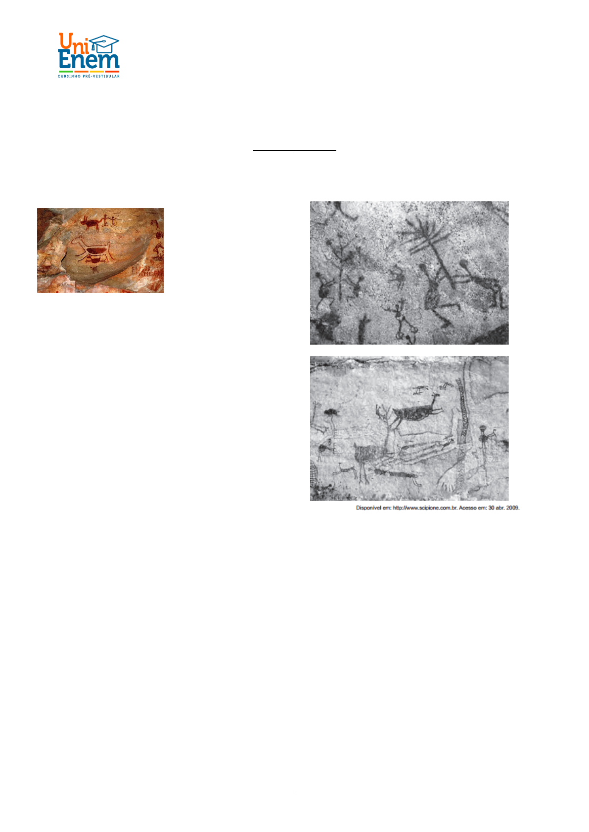UNIVERSIDADE FEDERAL DO AMAPÁ PRÓ-REITORIA DE EXTENSÃO E AÇÕES COMUNITÁRIAS DEPARTAMENTO DE EXTENSÃO CURSINHO PRÉ-VESTIBULAR UNIENEM __________________________________________________________________________________________________________________________________ DISCIPLINA: Arte PROFESSOR: Adriano Duarte Cardoso NOME: ________________________________________________ TURMA: _____ EXERCÍCIOS 01. ( ENEM 2007) A pintura rupestre acima, que é um patrimônio cultural brasileiro, expressa a) O conflito entre os povos indígenas e os europeus durante o processo de colonização do Brasil. b) A organização social e política de um povo indígena e a hierarquia entre seus membros. c) Aspectos da vida cotidiana de grupos que viveram durante a chamada pré-história do Brasil. d) rituais que envolvem sacrifícios de grandes dinossauros atualmente extintos. e) A constante guerra entre diferentes grupos 02.( ENEM 2020) A arte pré-histórica africana foi incontestavelmente um veículo de mensagens pedagógicas e sociais. Os San, que constituem hoje o povo mais próximo da realidade das representações rupestres, afirmam que seus antepassados lhes explicaram sua visão do mundo a partir desse gigantesco livro de imagens que são as galerias. A educação dos povos que desconhecem a escrita está baseada sobretudo na imagem e no som, no audiovisual. KI-ZERBO, J. A arte pré-histórica africana. In: KI-ZERBO, J. (Org.) História geral da África, I: metodologia e pré-históriada África. Brasília: Unesco, 2010. De acordo com o texto, a arte mencionada é importante para os povos que a cultivam por colaborar para o(a) a)transmissão dos saberes acumulados. b)expansão da propriedade individual. c)ruptura da disciplina hierárquica. d)surgimento dos laços familiares. e)rejeição de práticas exógenas. 03. (ENEM 2011) Gravuras e pinturas são duas modalidades da prática gráfica rupestre, feitas com recursos técnicos diferentes. Existem vastas áreas nas quais há dominância de uma ou outra técnica no Brasil, o que não impede que ambas coexistam no mesmo espaço. Mas em todas as regiões há mãos, pés, antropomorfos e zoomorfos. Os grafismos realizados em blocos ou paredes foram gravados por meio de diversos recursos: picoteamento, entalhes e raspados. Nas figuras que representam a arte da pré-história brasileira e estão localizadas no sítio arqueológico da Serra da Capivara, estado do Piauí, e, com base no texto, identificam-se a)imagens do cotidiano que sugerem caçadas, danças, manifestações e rituais. b)cenas nas quais prevalece o grafismo entalhado em superfícies previamente polidas. c)aspectos recentes, cujo procedimento de datação indica o recuo das cronologias da prática pré-histórica. d)situações ilusórias na reconstituição da pré-história, pois se localizam em ambientes degradados. e)grafismos rupestres que comprovam que foram realizados por pessoas com sensibilidade estética. 04. ( ENEM 2009) A arte é quase tão antiga quanto o ser humano. A função decisiva da arte nos seus primórdios foi a de conferir poder mágico: poder sobre a natureza, poder sobre os inimigos, poder sobre o parceiro de relações sexuais, poder sobre a realidade, poder exercido no sentido de um fortalecimento da Página 1 de 2 coletividade humana. Nos alvores da humanidade, a arte pouco tinha a ver com a “beleza” e nada tinha a ver com a contemplação estética, com o desfrute estético: era um instrumento mágico, uma arma da coletividade humana em sua luta pela sobrevivência. Por exemplo, a figura apresentada de uma pintura rupestre comprova que as pinturas de animais nas cavernas tinham a função de ajudar a dar ao caçador um sentido de segurança e superioridade sobre a presa. (FISCHER, Ernst. A necessidade da arte. Rio de Janeiro: Guanabara, p. 45 - adaptado) Com base nas informações do texto, conclui-se que arte, nos seus primórdios, tinha a função de: a) Dar ao homem a sensação de domínio da natureza e no desenvolver as relações sociais. b) Dotar o ser humano de ferramentas de trabalho que servissem para caçar presas, na luta pela sobrevivência. c) Desenvolver uma atividade individual, por meio de signos, imagens e palavras, destacando a importância do artista em relação ao grupo social. d) Transformar magicamente a natureza pelo esforço do trabalho coletivo, como uma arma de defesa da coletividade humana. e) Guiar o ser humano em suas atividades de trabalho coletivo. 05. ( ENEM 2007) A pintura rupestre acima, que é um patrimônio cultural brasileiro, expressa a) O conflito entre os povos indígenas e os europeus durante o processo de colonização do Brasil. b) A organização social e política de um povo indígena e a hierarquia entre seus membros. c) Aspectos da vida cotidiana de grupos que viveram durante a chamada pré-história do Brasil. d) rituais que envolvem sacrifícios de grandes dinossauros atualmente extintos. e) A constante guerra entre diferentes grupos paleoíndios da América durante o período colonial 06. ( ENEM 2009)O Egito é visitado anualmente por milhões de turistas de todos os quadrantes do planeta, desejosos de ver com os próprios olhos a grandiosidade do poder esculpida em pedra há milênios: as pirâmides de Gizeh, as tumbas do Vale dos Reis e os numerosos templos construídos ao longo do Nilo. O que hoje se transformou em atração turística era, no passado, interpretado de forma muito diferente, pois a) significava, entre outros aspectos, o poder que os faraós tinham para escravizar grandes contingentes populacionais que trabalhavam nesses monumentos. b) representava para as populações do alto Egito a possibilidade de migrar para o sul e encontrar trabalho nos canteiros faraônicos. c) significava a solução para os problemas econômicos, uma vez que os faraós sacrificavam aos deuses suas riquezas, construindo templos. d) representava a possibilidade de o faraó ordenar a sociedade, obrigando os desoc