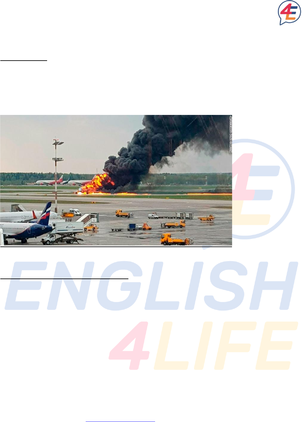GETTING TO LEVEL 4 CLASS 08 – DESCRIBING PICTURES – TASK EPLIS PART 4 1. Describe the picture in as much detail as possible. Remember to use “There is / are” as well as all the language from this class (“in the foreground/background”, etc). Check the 5 steps below. The 5 Steps to Describing a Picture: 1. Start from the foreground (the most important information in the picture); 2. Cover the other parts of the picture (on the left/right; at the top/bottom); 3. Describe the background (if there is one); 4. Remember to talk about the weather, damages to aircraft and airdrome, health of passengers and crew (Did anyone die? Was anyone hurt?); 5. Optional: Talk about the consequences of the event (using “WILL + verb” or “BE GOING TO + verb”). NOTE: send your answer to e4lenglish@gmail.com and wait for your feedback. mailto:e4lenglish@gmail.com