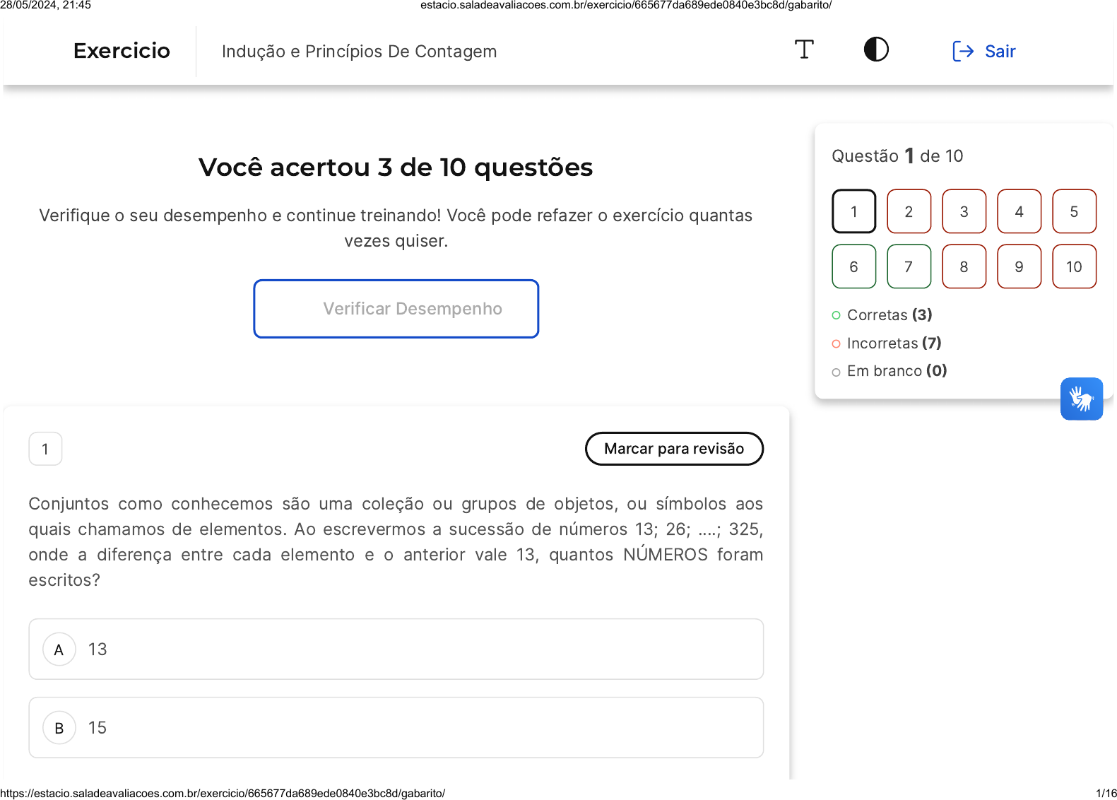 Você acertou 3 de 10 questões Verifique o seu desempenho e continue treinando! Você pode refazer o exercício quantas vezes quiser. Verificar Desempenho A B 1 Marcar para revisão Conjuntos como conhecemos são uma coleção ou grupos de objetos, ou símbolos aos quais chamamos de elementos. Ao escrevermos a sucessão de números 13; 26; ....; 325, onde a diferença entre cada elemento e o anterior vale 13, quantos NÚMEROS foram escritos? 13 15 Questão 1 de 10 Corretas �3� Incorretas �7� Em branco �0� 1 2 3 4 5 6 7 8 9 10 Exercicio Indução e Princípios De Contagem Sair 28/05/2024, 21:45 estacio.saladeavaliacoes.com.br/exercicio/665677da689ede0840e3bc8d/gabarito/ https://estacio.saladeavaliacoes.com.br/exercicio/665677da689ede0840e3bc8d/gabarito/ 1/16 C D E 17 25 29 Resposta correta Parabéns, você selecionou a alternativa correta. Confira o gabarito comentado! Gabarito Comentado 2 Marcar para revisão Conjuntos, como conhecemos, são uma coleção ou grupos de objetos, ou símbolos aos quais chamamos de elementos. Dado o conjunto A � �1; 2; 3� e B � �2; 3; 4�, quantos são 28/05/2024, 21:45 estacio.saladeavaliacoes.com.br/exercicio/665677da689ede0840e3bc8d/gabarito/ https://estacio.saladeavaliacoes.com.br/exercicio/665677da689ede0840e3bc8d/gabarito/ 2/16 A B C D E os números diferentes que você consegue gerar somando um elemento de A com um elemento de B? 8. 7. 6. 5. 4. Resposta incorreta Opa! A alternativa correta é a letra D. Confira o gabarito comentado! Gabarito Comentado Para resolver essa questão, devemos somar cada elemento do conjunto A com cada elemento do conjunto B, resultando em um total de 9 somas. Em seguida, devemos verificar quantos são os valores diferentes obtidos. As somas possíveis são: 1�2�3; 1�3�4; 1�4�5; 2�2�4; 2�3�5; 2�4�6; 28/05/2024, 21:45 estacio.saladeavaliacoes.com.br/exercicio/665677da689ede0840e3bc8d/gabarito/ https://estacio.saladeavaliacoes.com.br/exercicio/665677da689ede0840e3bc8d/gabarito/ 3/16 A B C 3�2�5; 3�3�6; 3�4�7; Ao analisar os resultados, percebemos que obtemos 5 valores distintos: 3, 4, 5, 6 e 7. Portanto, a resposta correta é a alternativa D, que indica que podemos gerar 5 números diferentes somando um elemento de A com um elemento de B. 3 Marcar para revisão O princípio da Casa dos Pombos é, sem dúvida, um dos enunciados mais simples e poderosos na solução de problemas de contagem, digamos, inusitados. Surpreendente, ele possibilita a solução elegante de problemas muitas vezes de difícil abordagem. Tendo este princípio em mente, uma caixa contém 7 bolas vermelhas, 8 azuis e 10 verdes. Qual o número mínimo de bolas que devemos retirar da caixa, sem olhar, para garantir que retiramos pelo menos duas bolas da mesma cor? 4 15 16 28/05/2024, 21:45 estacio.saladeavaliacoes.com.br/exercicio/665677da689ede0840e3bc8d/gabarito/ https://estacio.saladeavaliacoes.com.br/exercicio/665677da689ede0840e3bc8d/gabarito/ 4/16 D E 25 26 Resposta incorreta Opa! A alternativa correta é a letra A. Confira o gabarito comentado! Gabarito Comentado O princípio da Casa dos Pombos, aplicado a este problema, nos diz que se temos três "casas" (as cores das bolas) e queremos garantir que pelo menos uma delas tenha mais de um "pombo" (as bolas), precisamos de pelo menos uma bola a mais do que o número de casas. Portanto, ao retirarmos quatro bolas, garantimos que pelo menos duas delas serão da mesma cor, pois temos apenas três cores diferentes. Assim, a quarta bola retirada obrigatoriamente será da mesma cor que uma das três primeiras bolas retiradas. 4 Marcar para revisão Conjuntos como conhecemos são uma coleção ou grupos de objetos, ou símbolos aos quais chamamos de elementos. Analise a soma s(n) dos n primeiros números ímpares positivos. Qual das sentenças indicadas representa s(n) ? 28/05/2024, 21:45 estacio.saladeavaliacoes.com.br/exercicio/665677da689ede0840e3bc8d/gabarito/ https://estacio.saladeavaliacoes.com.br/exercicio/665677da689ede0840e3bc8d/gabarito/ 5/16 A B C D E 2n+2 n2 n �13 (n-1) �32 n2+1 2 Resposta incorreta Opa! A alternativa correta é a letra B. Confira o gabarito comentado! Gabarito Comentado Uma das estratégias é analisar casos pequenos de n , identificando qual expressão é coerente com os casos analisados e, a seguir, demonstrar que de fato tal expressão vale para qualquer n. Por exemplo, por Indução! n Soma desejada �A� �B� �C� �D� �E� 1 1 4 1 1 2 3 28/05/2024, 21:45 estacio.saladeavaliacoes.com.br/exercicio/665677da689ede0840e3bc8d/gabarito/ https://estacio.saladeavaliacoes.com.br/exercicio/665677da689ede0840e3bc8d/gabarito/ 6/16 A B C D E 2 4 5/2 4 5 Marcar para revisão Conjuntos como conhecemos são uma coleção ou grupos de objetos, ou símbolos aos quais chamamos de elementos. Analise a soma s(n) dos n primeiros números pares positivos. Qual das sentenças indicadas representa s(n) ? n(n+1) n2+1 2 n2 n �12 (n-1) �32 28/05/2024, 21:45 estacio.saladeavaliacoes.com.br/exercicio/665677da689ede0840e3bc8d/gabarito/ https://estacio.saladeavaliacoes.com.br/exercicio/665677da689ede0840e3bc8d/gabarito/ 7/16 Resposta incorreta Opa! A alternativa correta é a letra A. Confira o gabarito comentado! Gabarito Comentado Uma das estratégias é analisar casos pequenos de n , identificando qual expressão é coerente com os casos analisados e, a seguir, demonstrar que de fato tal expressão vale para qualquer n. Por exemplo, por Indução! n Soma desejada �A� �B� �C� �D� �E� 1 2 2 1 1 2 3 2 6 6 4 6 Marcar para revisão O Princípio da Multiplicação é uma estratégia para contar o número total de casos possíveis, em situações em que ocorrem escolhas múltiplas, porém independentes. Com os algarismos de 1 a 9, quantos são os números de 4 algarismos diferentes que podemos formar, sabendo-se que necessariamente devemos usar pelo menos os algarismos 2 e 5? 28/05/2024, 21:45 estacio.saladeavali