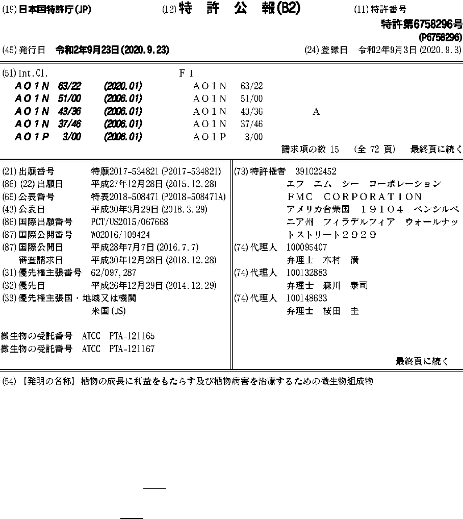 JP 6758296 B2 2020.9.23 10 20 (57)【特許請求の範囲】 【請求項1】 植物の成長及び/又は植物の健康に利益をもたらすための組成物であって、 ATCC番号PTA-121165として寄託されたバチルス・ベレゼンシス(Bacill us velezensis)RTI301の生物学的に純粋な培養物、及び、 ATCC番号PTA-121167として寄託されたバチルス・サブチリス(Bacillus subtilis)RTI477の生物学的に純粋な培養物、を含み、 前記植物の種子、前記植物の根又は前記植物の周囲の土壌への当該組成物の適用は、植 物の成長及び/又は植物の健康に利益をもたらす、 組成物。 【請求項2】 前記組成物は、液体の形態であり、 前記バチルス・サブチリス(Bacillus subtilis)RTI477及び前記バチルス・ベ レゼンシス(Bacillus velezensis)RTI301の各々は、1.0×108CFU/m lから1.0×1012CFU/mlの濃度で存在する、 請求項1に記載の組成物。 【請求項3】 前記組成物は、粉剤、乾燥水和性粉末剤、展延性粒剤又は乾燥水和性粒剤の形態であり 、 前記バチルス・サブチリス(Bacillus subtilis)RTI477及び前記バチルス・ベ (2) JP 6758296 B2 2020.9.23 10 20 30 40 50 レゼンシス(Bacillus velezensis)RTI301の各々は、1.0×108CFU/g から1.0×1012CFU/gの量で存在する、 請求項1に記載の組成物。 【請求項4】 前記組成物は、油分散体の形態であり、 前記バチルス・サブチリス(Bacillus subtilis)RTI477及び前記バチルス・ベ レゼンシス(Bacillus velezensis)RTI301の各々は、1.0×108CFU/m lから1.0×1012CFU/mlの濃度で存在する、 請求項1に記載の組成物。 【請求項5】 植物の成長に利益をもたらす及び/又は植物における病原体感染に対する保護を与える のに適切な量で存在する、微生物学的、生物学的又は化学的な、殺虫剤、殺真菌剤、殺線 虫剤、殺細菌剤、除草剤、植物抽出物、植物成長調整剤又は肥料のうちの1つ又は組み合 わせを更に含む、請求項1に記載の組成物。 【請求項6】 植物の成長及び/又は植物の健康に利益をもたらすための組成物で被覆された植物種子 であって、 前記組成物は、ATCC番号PTA-121165として寄託されたバチルス・ベレゼ ンシス(Bacillus velezensis)RTI301の生物学的に純粋な培養物の胞子、及び、 ATCC番号PTA-121167として寄託されたバチルス・サブチリス(Bacillus s ubtilis)RTI477の生物学的に純粋な培養物の胞子、を含む、 植物種子。 【請求項7】 植物の成長及び/又は植物の健康に利益をもたらすための方法であって、 当該方法は、 ATCC番号PTA-121165として寄託されたバチルス・ベレゼンシス(Baci llus velezensis)RTI301の生物学的に純粋な培養物、及び、 ATCC番号PTA-121167として寄託されたバチルス・サブチリス(Bacill us subtilis)RTI477の生物学的に純粋な培養物、 を含む組成物を、植物の種子、植物の根又は植物の周囲の土壌に送達することを含み、 前記組成物の送達は、植物の成長及び/又は植物の健康に利益をもたらす、 方法。 【請求項8】 植物の成長及び/又は植物の健康に利益をもたらすための方法であって、 当該方法は、 ATCC番号PTA-121165として寄託されたバチルス・ベレゼンシス(Baci llus velezensis)RTI301の生物学的に純粋な培養物を含む第1の組成物、及び、 ATCC番号PTA-121167として寄託されたバチルス・サブチリス(Bacill us subtilis)RTI477の生物学的に純粋な培養物を含む第2の組成物、 を、植物の種子、植物の根又は植物の周囲の土壌に送達することを含み、 前記組成物の送達は、植物の成長及び/又は植物の健康に利益をもたらす、 方法。 【請求項9】 植物の成長及び/又は植物の健康に利益をもたらすための方法であって、 当該方法は、適切な成長培地中に植物種子を植え付けることを含み、 前記植物種子は、 ATCC番号PTA-121165として寄託されたバチルス・ベレゼンシス(Baci llus velezensis)RTI301の生物学的に純粋な培養物の胞子、及び、 ATCC番号PTA-121167として寄託されたバチルス・サブチリス(Bacill us subtilis)RTI477の生物学的に純粋な培養物の胞子、 (3) JP 6758296 B2 2020.9.23 10 20 30 40 50 を含む組成物で被覆されており、 前記バチルス・ベレゼンシスRTI301及び前記バチルス・サブチリスRTI477 は、植物の成長及び/又は植物の健康に利益をもたらすために適切な量で存在する、 方法。 【請求項10】 植物の成長及び/又は植物の健康に利益をもたらすための組成物で被覆された植物種子 であって、 前記組成物は、ATCC番号PTA-121165として寄託されたバチルス・ベレゼ ンシス(Bacillus velezensis)RTI301の生物学的に純粋な培養物の胞子、ATC C番号PTA-121167として寄託されたバチルス・サブチリス(Bacillus subtili s)RTI477の生物学的に純粋な培養物の胞子、及びビフェントリン殺虫剤を含む、 植物種子。 【請求項11】 ATCC番号PTA-121165として寄託されたバチルス・ベレゼンシス(Bacill us velezensis)RTI301の生物学的に純粋な培養物、及び、ATCC番号PTA- 121167として寄託されたバチルス・サブチリス(Bacillus subtilis)RTI47 7の生物学的に純粋な培養物を含む第1の組成物、 微生物学的、生物学的又は化学的な、殺虫剤、殺真菌剤、殺線虫剤、殺細菌剤、除草剤 、植物抽出物、植物成長調整剤又は肥料のうちの1つ又は組み合わせを含む第2の組成物 、並