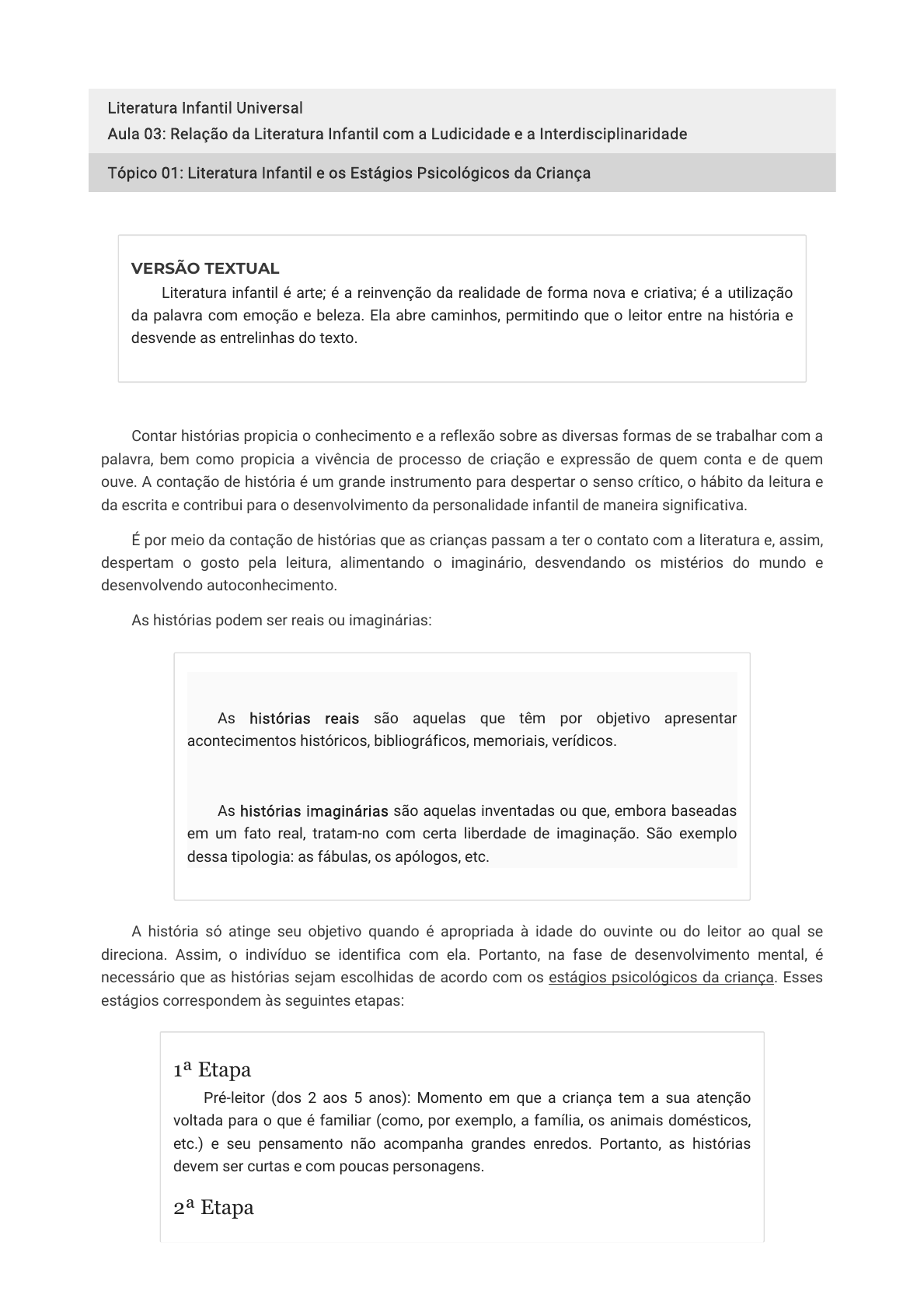 Literatura Infantil Universal Aula 03: Relação da Literatura Infantil com a Ludicidade e a Interdisciplinaridade Tópico 01: Literatura Infantil e os Estágios Psicológicos da Criança VERSÃO TEXTUAL Literatura infantil é arte; é a reinvenção da realidade de forma nova e criativa; é a utilização da palavra com emoção e beleza. Ela abre caminhos, permitindo que o leitor entre na história e desvende as entrelinhas do texto. Contar histórias propicia o conhecimento e a reflexão sobre as diversas formas de se trabalhar com a palavra, bem como propicia a vivência de processo de criação e expressão de quem conta e de quem ouve. A contação de história é um grande instrumento para despertar o senso crítico, o hábito da leitura e da escrita e contribui para o desenvolvimento da personalidade infantil de maneira significativa. É por meio da contação de histórias que as crianças passam a ter o contato com a literatura e, assim, despertam o gosto pela leitura, alimentando o imaginário, desvendando os mistérios do mundo e desenvolvendo autoconhecimento. As histórias podem ser reais ou imaginárias: Histórias reais As histórias reais são aquelas que têm por objetivo apresentar acontecimentos históricos, bibliográficos, memoriais, verídicos. Histórias imaginárias As histórias imaginárias são aquelas inventadas ou que, embora baseadas em um fato real, tratam-no com certa liberdade de imaginação. São exemplo dessa tipologia: as fábulas, os apólogos, etc. A história só atinge seu objetivo quando é apropriada à idade do ouvinte ou do leitor ao qual se direciona. Assim, o indivíduo se identifica com ela. Portanto, na fase de desenvolvimento mental, é necessário que as histórias sejam escolhidas de acordo com os estágios psicológicos da criança. Esses estágios correspondem às seguintes etapas: 1ª Etapa Pré-leitor (dos 2 aos 5 anos): Momento em que a criança tem a sua atenção voltada para o que é familiar (como, por exemplo, a família, os animais domésticos, etc.) e seu pensamento não acompanha grandes enredos. Portanto, as histórias devem ser curtas e com poucas personagens. 2ª Etapa 25 impresso_parciais LiteraturaInfantilUniversal_aula_03