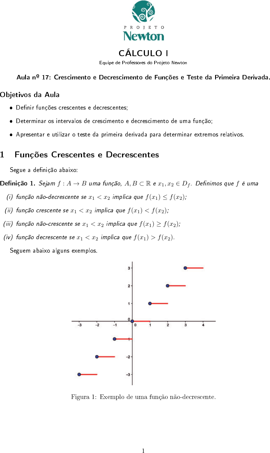 CÁLCULO I Equipe de Professores do Projeto Newton Aula nº 17: Crescimento e Decrescimento de Funções e Teste da Primeira Derivada. Objetivos da Aula � De�nir funções crescentes e decrescentes; � Determinar os intervalos de crescimento e decrescimento de uma função; � Apresentar e utilizar o teste da primeira derivada para determinar extremos relativos. 1 Funções Crescentes e Decrescentes Segue a de�nição abaixo: De�nição 1. Sejam f : A→ B uma função, A,B ⊂ R e x1, x2 ∈ Df . De�nimos que f é uma (i) função não-decrescente se x1 < x2 implica que f(x1) ≤ f(x2); (ii) função crescente se x1 < x2 implica que f(x1) < f(x2); (iii) função não-crescente se x1 < x2 implica que f(x1) ≥ f(x2); (iv) função decrescente se x1 < x2 implica que f(x1) > f(x2). Seguem abaixo alguns exemplos. Figura 1: Exemplo de uma função não-decrescente. 1 Cálculo I Aula nº 17 Figura 2: Exemplo de uma função crescente. Figura 3: Exemplo de uma função não-crescente. Figura 4: Exemplo de uma função decrescente. Existem funções que não são crescentes e nem decrescentes em todo o seu domínio, ou seja, uma função pode ser crescente em uma parte do seu domínio e decrescente em outra parte. Um exemplo de função Equipe de Professores do Projeto Newton 2 Cálculo I Aula nº 17 com essa propriedade é a função quadrática, dada por f(x) = x2 + 1 2 ; note que para x < 0 a função é decrescente e para x > 0 a função é crescente, como podemos ver no grá�co de f . Figura 5: Grá�co da função f(x) = x2 + 1 2 . 2 Intervalos de Crescimento e Decrescimento Uma das aplicações do Teorema do Valor Médio é demonstrar o teorema que nos permite obter os intervalos de crescimento e de decrescimento de uma função. Tal resultado nos diz que podemos determinar esses intervalos apenas analisando o sinal de sua derivada. Teorema 1. Seja f uma função contínua em um intervalo fechado [a, b] e derivável no aberto (a, b), então: (a) se f ′(x) > 0 para todo x ∈ (a, b), então f é crescente em (a, b). (b) se f ′(x) < 0 para todo x ∈ (a, b), então f é decrescente em (a, b). Exemplo 1. Determine o intervalo de crescimento e/ou de decrescimento da função f(x) = x2 + 1 2 . Solução: Derivando a função, temos f ′(x) = 2x. Como f ′(x) = 2x > 0 para todo x > 0, então f(x) cresce no intervalo (0,+∞). De forma análoga, como f ′(x) = 2x < 0 para todo x < 0, então f(x) decresce no intervalo (−∞, 0). � Exemplo 2. Determine o intervalo de crescimento e/ou de decrescimento da função f(x) = x3. Solução: Derivando a função, temos f ′(x) = 3x2. Como x2 ≥ 0 para todo x, o intervalo de crescimento é R = (−∞,+∞). Desta forma não temos intervalo de decrescimento. � Exemplo 3. Determine o intervalo de crescimento e decrescimento da função f(x) = 3x4−4x3−12x2+5. Solução: Derivando a função, temos: f ′(x) = 12x3 − 12x2 − 24x = 12x(x− 2)(x+ 1). Equipe de Professores do Projeto Newton 3 Cálculo I Aula nº 17 Para fazer o estudo do sinal, utilizamos o seguinte quadro abaixo: Desse modo, f é decrescente em (−∞,−1) ∪ (0, 2) e crescente em (−1, 0) ∪ (2,+∞). Observe gra�camente: Figura 6: Grá�co da função f(x) = 3x4 − 4x3 − 12x2 + 5. � Exemplo 4. Determine o intervalo de crescimento e decrescimento da função f(x) = 2 cosx + cos2 x, x ∈ [0, 2π]. Solução: Note que f ′(x) = −2 sen(x)− 2 cos(x) sen(x). Equipe de Professores do Projeto Newton 4 Cálculo I Aula nº 17 Para estudar o sinal de f ′, podemos determinar os pontos em [0, 2π] tais que f ′(x) > 0 −2 sen(x)− 2 cos(x) sen(x) > 0 sen(x) + cos(x) sen(x) < 0 sen(x)(1 + cos(x)) < 0. Note que 1+ cos(x) ≥ 0 para todo x ∈ [0, 2π], logo, para que f ′(x) < 0, devemos obter os pontos nos quais o seno de x é negativo. Dessa forma, f ′(x) > 0 se π < x < 2π. Analogamente, obtermos que f ′(x) < 0 se 0 < x < π, e assim, temos que f é decrescente em (0, π) e crescente em (π, 2π), como pode ser mostrado no grá�co abaixo: Figura 7: Grá�co da função f(x) = 2 cosx+ cos2 x. � Exemplo 5. Determine o intervalo de crescimento e decrescimento da função f(x) = 4x2 + 1 x . Solução: Note que f ′(x) = 8x− 1 x2 = 8x3 − 1 x2 . Como x2 ≥ 0 para todo x ∈ R, então o sinal de f ′ é determinado pela função que está no numerador. Fatorando, temos que 8x3 − 1 = (2x)3 − 13 = (2x− 1)(4x2 + 2x+ 1). Como o segundo fator é um polinômio irredutível de grau 2 e com concavidade para cima, então podemos concluir que 4x2 + 2x + 1 > 0 para todo x ∈ R. Logo, o sinal de f ′ é determinado pelo fator 2x − 1, que pode ser entendido como uma reta que passa pelos pontos (0,−1) e ( 1 2 , 0 ) . Perceba que f ′ não está de�nida em zero. Logo, o sinal de f ′ e os intervalos de crescimentos são dados pelo quadro a seguir: Equipe de Professores do Projeto Newton 5 Cálculo I Aula nº 17 Sendo assim, a função f decresce no intervalo (−∞, 0) ∪ ( 0, 1 2 ) e cresce no intervalo ( 1 2 ,+∞ ) . Observe gra�camente: Figura 8: Grá�co da função f(x) = 4x2 + 1 x . � 3 Teste da Primeira Derivada Mostramos anteriormente que se f tem um máximo ou mínimo local em x = c, então c deve ser um número crítico de f , mas nem todo número crítico dá origem a um máximo ou mínimo. Consequentemente, necessitamos de um teste que nos diga se f tem ou não um máximo ou mínimo local em um certo ponto crítico. Teorema 2. Suponha que c seja um número crítico de uma função derivável f . 1. Se o sinal de f ′ mudar de positivo para negativo em x = c, então f tem um máximo local em x = c. 2. Se o sinal de f ′ mudar de negativo para positivo em x = c, então f tem um mínimo local em x = c. Equipe de Professores do Projeto Newton 6 Cálculo I Aula nº 17 Exemplo 6. Determine os intervalos de crescimento ou decrescimento da função f(x) = 2x3 + 3x2 − 36x e seus extremos relativos. Solução: Deriv