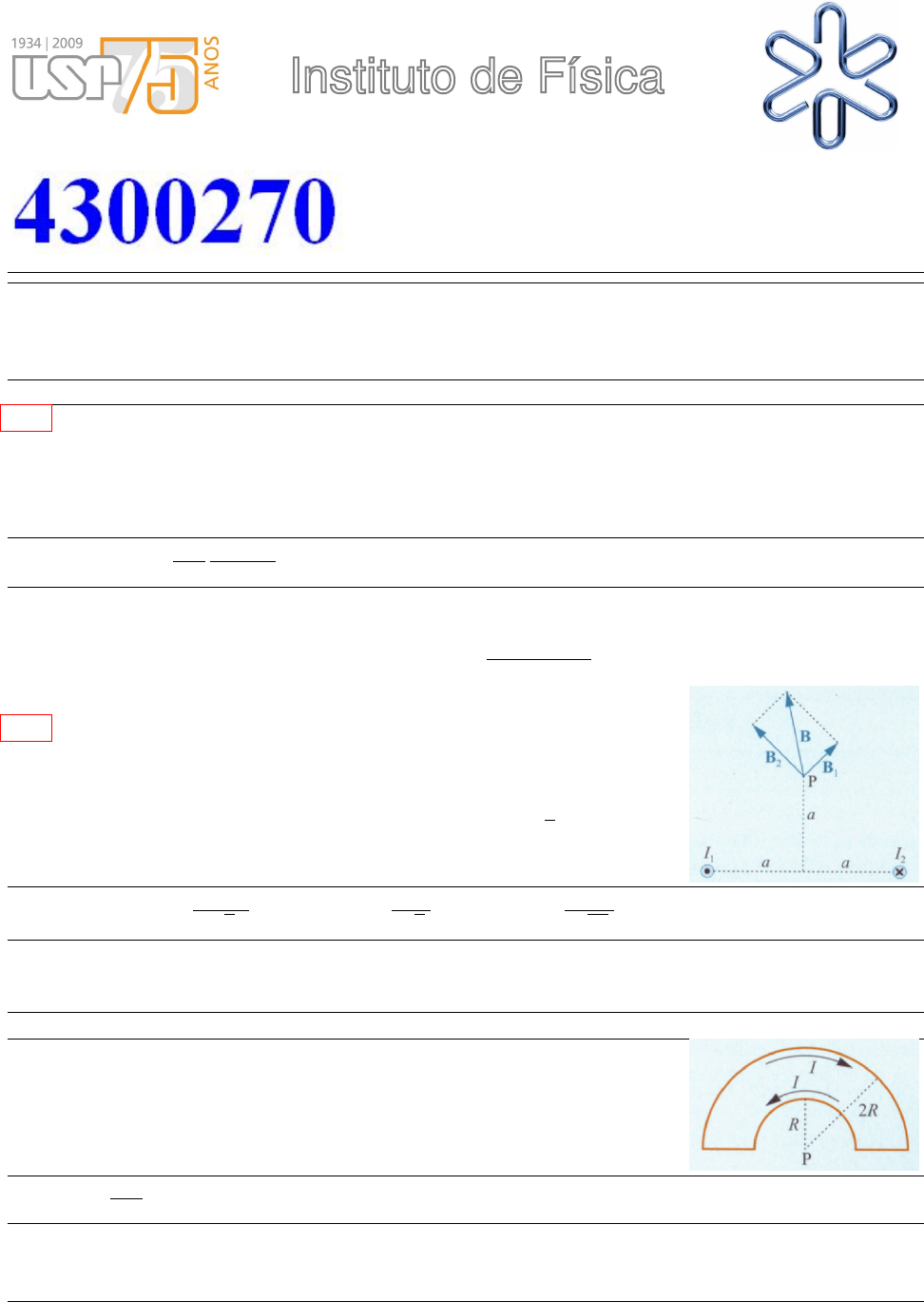 Lista de Exercı́cios 7 Lei de Ampère E8.1 Exercı́cios E8.1 Um fio de material supercondutor de raio igual a 10 µm transporta uma corrente de 100 A. Calcule o campo magnético na superfı́cie do fio. R. 2,0 T. E8.2 Dois fios paralelos separados pela distância 2a transportam correntes I de sentidos opostos. Considere que os fios são paralelos ao eixo y cortando o eixo x em x = a e x = −a, com as correntes nos sentidos de −z e +z, respectivamente. (A) Calcule o campo magnético em uma posição genérica do eixo x. Tomando a = 10 mm e I = 30 A, avalie o campo nas posições (B) x=0; (C) x=9,0 mm; (D) x=11 mm. R. (A) B(x) = µ0I π a a2 − x2 ŷ; (B) B = 1,2 mT ŷ; (C) B = 6,3 mT ŷ; (d) B = −5,7 mT ŷ. E8.3 Um fio reto e infinito está posicionado sobre o eixo z de coordenadas, e transporta uma corrente I orientada no sentido positivo do eixo. Mostre que em um ponto de coordenadas (x,y,z) o campo magnético gerado pela corrente é B = µ0I 2π(x2 + y2) (yi+ xj). E8.4 A Figura mostra dois fios paralelos conduzindo correntes de sen- tidos opostos I1 e I2, separados pela distância 2a. Calcule os cam- pos B1 e B2 e o campo total B gerados pelas correntes no ponto P sobre a mediatriz da linha que une os dois fios, deslocado da distância a desta linha. Note que P está à distância √ 2a de ambos os fios. Considere os valores I1=30 A, I2=20 A, a=2,00 cm. R. B1 = 0,21 mT −i+ j√ 2 , B2 = 0,14 mT i+ j√ 2 , B = 0,25 mT i+ 5j√ 26 E8.5 Um fio longo e retilı́neo transporta uma corrente de 10 A. Estando o fio orientado de forma ortogonal ao campo da Terra, de 0,40 G, determine os pontos em que o campo magnético é nulo. R. Sobre uma linha paralela ao fio a uma distância de 5,0 cm dele. E8.6 Calcule o campo magnético gerado pela corrente do circuito da figura no ponto P. Use k para indicar a direção que sai do papel. R. B = µ0I 8R k E8.7 Uma linha de transmissão de corrente contı́nua conduz correntes opostas em seus cabos pa- ralelos separados por 2,0 m. Sendo I=1,0×104 A a corrente em cada cabo, calcule a força de repulsão por metro linear dos cabos. 1 R. f = 10 N/m E8.8 Medida de um campo magnético. A figura mostra um circuito, na forma de retângulo, no qual circula uma corrente I . O circuito está suspenso de uma balança que permite medir a força verti- cal sobre ele. O lado inferior do circuito está numa região onde há um campo magnético uniforme B cujo módulo se pretende medir. Observa-se que, quando a corrente I vale 2,00 A, a força magnética F sobre ele tem módulo de 0,0255 N. Quanto vale B? R. B=0,255 T E8.9 Um anel de raio igual a 10 cm, de material supercondutor, conduz uma corrente de 100 A. Calcule o campo magnético (A) no centro do anel; (B) em um ponto sobre o eixo do anel, 1,0 m acima do seu centro. R. (A) B = 6,3×10−4 T (B) B = 6,3×10−7 T E8.10 (A) Calcule o dipolo magnético do circuito da figura. (B) Usando a aproximação de dipolo, calcule o campo magnético no ponto P. R. (A) µ = 1,35×10−3 Am2k (B) B = (0,54j+ 1,00k) µT E8.11 A figura mostra três pares de ı́mãs. Descreva o tipo de interação (atração, repulsão ou torque) em cada par. R. (A) torque (B) atração (C) repulsão E8.12 Calcule o torque sobre o dipolo magnético antiparalelo ao unitário j na figura. R. τ = − µ0µ 8πr3 i E8.13 Um cabo cilı́ndrico com diâmetro de 1,00 cm conduz uma corrente de 200 A. Calcule o campo magnético (A) em um ponto a 2,5 mm do eixo do cabo; (B) na superfı́cie do cabo. 2 R. (A) 4,0 mT (B) 8,0 mT E8.14 Um solenóide tem 5,0 cm de raio e 20 cm de altura, e o seu fio, no qual circula uma corrente de 0,50 A, dá 300 voltas. Calcule (A) o dipolo magnético da bobina e (B) o campo magnético no seu interior. R. (A) 1,2 Am2 (B) 0,94 mT P8.1 Problemas P8.1 Na figura, o fio se prolonga indefinidamente nas regiões em que ele é inclinado. Calcule o campo magnético no ponto P,usando k para designar a direção que sai do papel. R. B = −µ0I 2πa sen θk P8.2 A figura mostra um cabo muito longo orientado segundo o eixo z ortogonal ao papel, transportando uma corrente I (saindo do papel) que se distribui uniformemente no cabo. O cabo tem um orifı́cio cilı́ndrico, de raio r, centrado sobre o eixo x no ponto de coordenada a. Calcule o campo magnético no ponto de coorde- nadas x = 0 e y = 2R. (Sugestão: considere a corrente como a superposição de duas correntes, uma que ocupe todo o cabo e outra oposta dentro do furo.) R. B = µ0I 2π(R2 − r2) [( −R 2 + 2Rr2 4R2 + a2 ) i+ ( ar2 4R2 + a2 ) j ] P8.3 Uma corrente 2I em um fio retilı́neo muito longo se decompõe em duas correntes I ao passar por um anel, como mostra a figura. Quanto vale o campo magnético no centro do anel? R. B = 0 P8.4 A figura mostra um fio retilı́neo muito longo transportando uma corrente I . Calcule o módulo do campo magnético criado no ponto P unicamente pelo segmento do fio, de comprimento L, indicado na figura. R. B = µ0I 4πR L (L2 +R2)1/2 P8.5 Calcule o módulo do campo magnético no ponto P da figura. 3 R. B = µ0I 4πL √ 2 , entrando no papel. P8.6 Mostre que o campo magnético no centro de uma espira retangular de lados a e b na qual circula uma corrente I vale µ0I π √ 1 a2 + 1 b2 P8.7 Uma fita metálica de largura ` conduz uma corrente I . Portanto, a densidade superficial de corrente é I = I/`. Calcule a intensidade do campo magnético em pontos próximos à superfı́cie da fita. R. B = 1 2µ0I P8.8 Campo de um toróide. Um toróide é um corpo em forma de uma câmara de ar de pneu. Uma espira pode ser enrolada em torno do toróide, como mostra a figura. Neste caso, conclui-se por análise de simetria que as linhas de força do campo magnético têm a forma de cı́rculos fechados, como mostra a figura. Calcule o campo magnético (A) no interior do toróide; (B) fora do toróide. R. (A) B = µ0NI/2πr (B) B = 0 P8.9 Calcule o campo magnético no ponto P da figura, que é o centro comum dos dois semicı́rculos. R. B = 3µ
