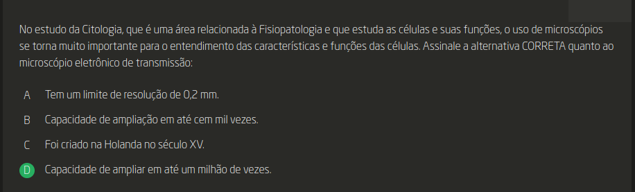 No estudo da Citologia, que é uma área relacionada à Fisiopatologia e que estuda as células e suas funções, de microscópios se torna muito importante para entendimento das características e funções das células. Assinale a alternativa CORRETA quanto ao microscópio eletrônico de transmissão: A Tem um limite de resolução de 0,2 mm. B Capacidade de ampliação em até cem mil vezes. C Foi criado na Holanda no século XV. D Capacidade de ampliar em até um milhão de vezes.