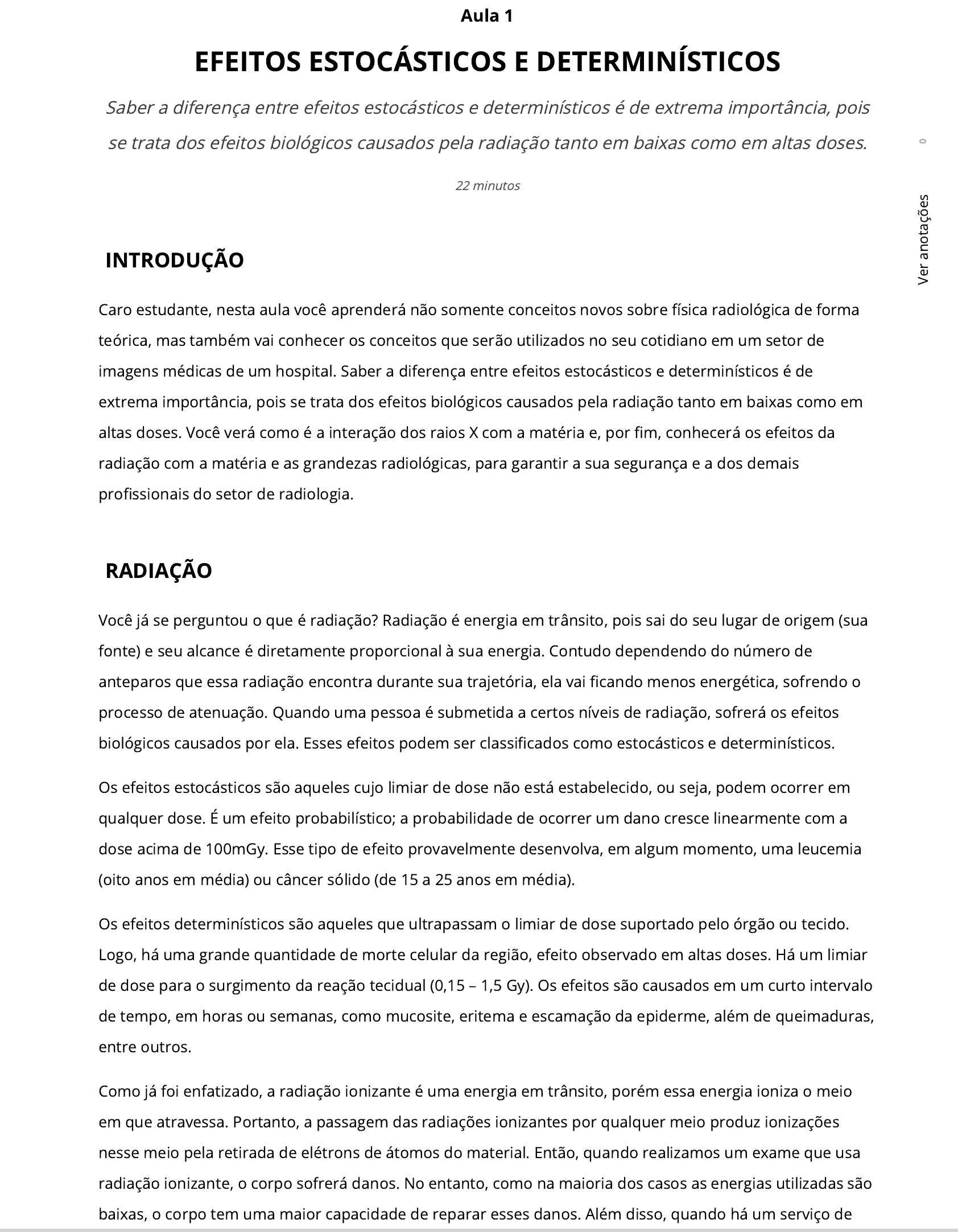 11/11/2023, 20:00 wlldd221_u3_fis_apl_rad https://www.colaboraread.com.br/integracaoAlgetec/index?usuarioEmail=eldasilva2791%40gmail.com&usuarioNome=ELDA+DA+SILVA+CARVALHO&disciplinaDescricao=&atividadeId=3834431&atividadeDescrica… 1/20 INTRODUÇÃO Caro estudante, nesta aula você aprenderá não somente conceitos novos sobre física radiológica de forma teórica, mas também vai conhecer os conceitos que serão utilizados no seu cotidiano em um setor de imagens médicas de um hospital. Saber a diferença entre efeitos estocásticos e determinísticos é de extrema importância, pois se trata dos efeitos biológicos causados pela radiação tanto em baixas como em altas doses. Você verá como é a interação dos raios X com a matéria e, por �m, conhecerá os efeitos da radiação com a matéria e as grandezas radiológicas, para garantir a sua segurança e a dos demais pro�ssionais do setor de radiologia. RADIAÇÃO Você já se perguntou o que é radiação? Radiação é energia em trânsito, pois sai do seu lugar de origem (sua fonte) e seu alcance é diretamente proporcional à sua energia. Contudo dependendo do número de anteparos que essa radiação encontra durante sua trajetória, ela vai �cando menos energética, sofrendo o processo de atenuação. Quando uma pessoa é submetida a certos níveis de radiação, sofrerá os efeitos biológicos causados por ela. Esses efeitos podem ser classi�cados como estocásticos e determinísticos. Os efeitos estocásticos são aqueles cujo limiar de dose não está estabelecido, ou seja, podem ocorrer em qualquer dose. É um efeito probabilístico; a probabilidade de ocorrer um dano cresce linearmente com a dose acima de 100mGy. Esse tipo de efeito provavelmente desenvolva, em algum momento, uma leucemia (oito anos em média) ou câncer sólido (de 15 a 25 anos em média). Os efeitos determinísticos são aqueles que ultrapassam o limiar de dose suportado pelo órgão ou tecido. Logo, há uma grande quantidade de morte celular da região, efeito observado em altas doses. Há um limiar de dose para o surgimento da reação tecidual (0,15 – 1,5 Gy). Os efeitos são causados em um curto intervalo de tempo, em horas ou semanas, como mucosite, eritema e escamação da epiderme, além de queimaduras, entre outros. Como já foi enfatizado, a radiação ionizante é uma energia em trânsito, porém essa energia ioniza o meio em que atravessa. Portanto, a passagem das radiações ionizantes por qualquer meio produz ionizações nesse meio pela retirada de elétrons de átomos do material. Então, quando realizamos um exame que usa radiação ionizante, o corpo sofrerá danos. No entanto, como na maioria dos casos as energias utilizadas são baixas, o corpo tem uma maior capacidade de reparar esses danos. Além disso, quando há um serviço de Aula 1 EFEITOS ESTOCÁSTICOS E DETERMINÍSTICOS Saber a diferença entre efeitos estocásticos e determinísticos é de extrema importância, pois se trata dos efeitos biológicos causados pela radiação tanto em baixas como em altas doses. 22 minutos 0 V e r a n o ta çõ e s 11/11/2023, 20:00 wlldd221_u3_fis_apl_rad https://www.colaboraread.com.br/integracaoAlgetec/index?usuarioEmail=eldasilva2791%40gmail.com&usuarioNome=ELDA+DA+SILVA+CARVALHO&disciplinaDescricao=&atividadeId=3834431&atividadeDescrica… 2/20 imagens médicas, existe uma grande preocupação dos órgãos de vigilância, os quais exigem que os danos não sejam superiores às vantagens que o exame oferece. Diz o princípio “alara”, do inglês as low as reasonably achievable, que as doses devem ser tão baixas quanto razoavelmente exequíveis. Como a essa radiação ioniza o meio que atravessa, é preciso entender como é o processo de interação da radiação com a matéria. Existem a radiação diretamente ionizante e a indiretamente ionizante. As diretamente ionizantes são as corpusculares, que têm massa e/ou carga. Como exemplo, há as partículas alfa, beta, prótons, pósitrons e elétrons. As indiretamente ionizantes são as que não têm massa nem carga. São fótons de raios X e gama. Nesse caso destacam-se três processos principais: efeito Compton, efeito fotoelétrico e criação de pares. Essas energias são medidas por meio das grandezas radiológicas. As grandezas são separadas em grandezas físicas, grandezas de proteção e grandezas operacionais. As grandezas físicas são: exposição, dose absorvida e Kerma. As grandezas de proteção são: dose equivalente no tecido ou órgão, dose efetiva e dose absorvida no órgão. Com a descoberta dos raios X, começou uma utilização desenfreada da radiação ionizante, pois tratava-se de um fenômeno que solucionava muitos problemas existentes. Porém, esse uso sem cautela levou a inúmeros danos biológicos. A partir disso, iniciou-se os estudos em proteção radiológica. MECANISMOS DE AÇÃO DAS RADIAÇÕES Mecanismos de ação das radiações A interação da radiação com os tecidos biológicos pode ocorrer diretamente ou indiretamente. A forma direta ocorre quando a radiação ionizante interage com os componentes do DNA, proteínas e lipídeos, provocando assim, alterações estruturais na estrutura. Esse evento é responsável por 30% das ocorrências entre a interação da radiação e célula. Já a forma indireta ocorre quando a radiação ionizante interage com componentes celulares, denominado como radiólise. A radiólise é o processo de quebra da água através da passagem da radiação ionizante. Esse evento é responsável por 70% das ocorrências entre a interação da radiação com a célula. Essa diferença em porcentagem de ocorrência se dá, devido ao fato de que a água ocupa uma parcela substancial da composição das células nos organismos vivos. Efeitos da radiação São classi�cados de duas formas: segundo a dose absorvida (efeitos estocásticos e determinísticos) e segundo o nível de dano (células somáticas ou genética