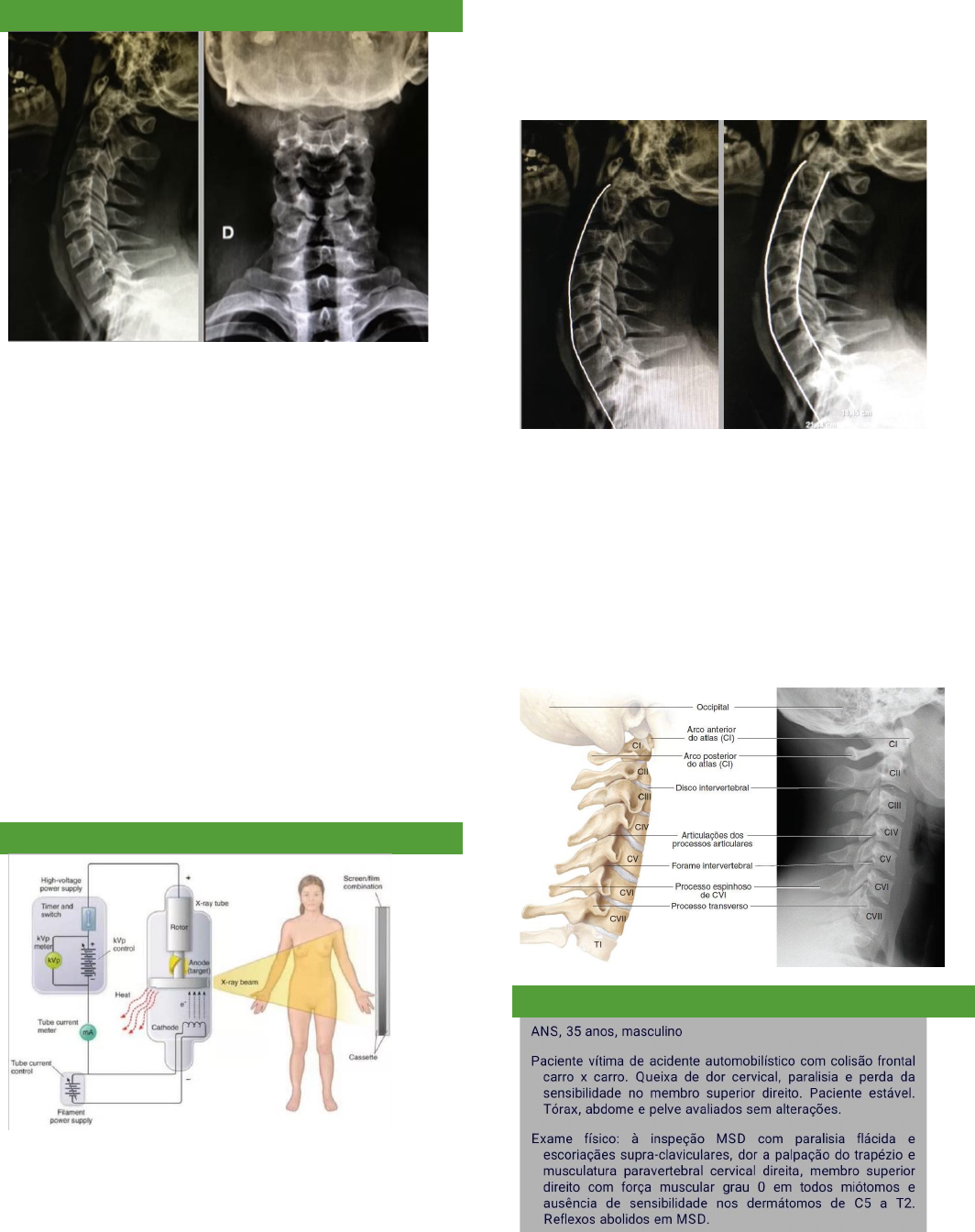 ORTOPEDIA E TRAUMATOLOGIA AULA 1B - RODRIGO NUNES 23/03/2022 PRINCÍPIOS DOS EXAMES DE IMAGEM RADIOGRAFIA • Imagem de radiografia – seguimento ósseo – coluna cervical. • A primeira está no plano sagital e a segunda no plano coronal (RX em AP e perfil, respectivamente). • Vemos o alinhamento entre as vertebras. • Na imagem, há lordose cervical normal. • Processo odontóide – axis. • Incluem o segmento distal e proximal. Elas estão bem- feitas, pois incluem a base do crânio C1 até C2 (Atlas e Axis) até o platô inferior de T1. • Temos C1, C2, C3, C4, C5, C6, C7 e T1. O RX da cervical sempre tem que ultrapassar a 1ª vértebra, incluindo até a base do crânio e ir até pelo menos o platô inferior de T1 ou até o platô superior de T2. • Incidências em perfil (lateral) e em AP (frontal) – para ortopedia. RADIOGRAFIA É a emissão de RX sobre o corpo. Ao emitir, se coloca um filme com raio isótopos, que ao receber o RX, dependendo da densidade tecidual, há emissão da sombra essa chapa da lâmina de marcador radiológico. • Como o RX ultrapassa partes moles de acordo com a densidade, teremos diferentes densidades geográficas mais hiperdensas ou mais hipodensas. • Quanto mais escuro, menos denso é o tecido (ex: tórax, pulmão). • Quanto mais claro, mais denso é o tecido. • Conseguimos através da diferença de densidade definir as estruturas e as alterações. • Ossos – vão absorver a maioria dos raios – hiperdenso. Quanto mais denso mais ela fica branca. Lordose cervical fisiológica. Linhas da silhueta cervical bem traçadas, afastando qualquer tipo de lesão nessa região. • Notamos a linha longitudinal anterior, posterior, os processos espinhos, atlas, áxis. • Temos que ter essa conformação perfeita, anatômica, harmônica e o espaço preservado entre as vértebras para dizermos que essa radiografia está normal. CASO CLÍNICO ORTOPEDIA E TRAUMATOLOGIA AULA 1B - RODRIGO NUNES 23/03/2022 • Braço é a estrutura que se compreende entre o ombro e o cotovelo. • Abaixo do cotovelo até o punho é o antebraço. • Paralisia flácida: membro esquecido, não mexe. • Força muscular igual a zero indica que ele não mobiliza nada, sem contração. • Sensibilidade dolorosa – inervados por um nervo que sai da coluna vertebral. Miótomo: sítio autonômico motor inervado por uma determinada raiz. É a unidade motora (grupo muscular ou musculo) inervado por uma determinada raiz. • Ex: raiz de C5 é responsável pela força motora de um musculo X. • Ex: tríceps inervado por C7. Dermatomo: sítio autonômico sensitivo inervado por uma determinada raiz. ⎯ Esse homem perdeu toda a parte neurológica do membro superior, ele está sem força e sem sensibilidade. Isso ocorreu desde a região do ombro até os dedos. Exames complementares para esse paciente: RX ou TC da cervical. Radiografia RX da cervical na incidência Perfil (imagem 01): C2, C3, C4 e C5. Esse RAIO-X está bom? Não! Ele não vai da base do crânio até T1 ou até o platô superior de T2. Inconclusivo pois não inclui todos os seguimentos vertebrais. O paciente do caso possui uma retificação da lordose cervical (pode estar com um colar cervical). • Alguma das táticas que podemos utilizar para retirar a silhueta dos ombros da frente no RX: o Tração para baixo dos membros superiores, tirando os ombros da frente da região cervical distal. o Incidência do nadador: elevação de um lado e faz um estresse para baixo de outro membro. Pouco usada. Para melhorar esse RX solicitamos a incidência nadador ou a incidência de contração dos membros superiores. Traciona os MMSS um para baixo e o outro para cima, aumentando esse espaço cérvico-torácico, tirando um dos ombros da frente. Como se fosse um nadador – um braço para cima e outro para baixo tracionando. Com isso, diminui a sobreposição dos ombros permitindo a visualização. Devido à má qualidade do exame vamos pedir ou um novo Rx com nadador ou na incidência de contração dos membros superiores ou uma TC (a indicação formal vem por uma limitação técnica, quando não temos clareza vamos tentar aprofundar). Tomografia • Imagem 01 – plano coronal. • Imagem 02 – plano sagital. • Imagem 03 – axial ou transverso. Nessa tomografia está tudo normal, então parece que não foi uma fratura da região cervical. TOMOGRAFIA COMPUTADORIZADA Emissão de RX sobre os diafragmas que controlam a densidade desse RX, cortando o corpo em diferentes planos. Esses detectores, em escalas de cinza, graduam as estruturas corporais de acordo com a sua densidade. o Branco – mais denso. o Preto – menos denso. o Quanto mais água mais tende ao cinza. Imagens aparecem em tons brancos a pretos com a escala gradual de cinza de acordo com a densidade do tecido. Incide em diferentes cortes, planos. ORTOPEDIA E TRAUMATOLOGIA AULA 1B - RODRIGO NUNES 23/03/2022 VOLTANDO AO CASO... ELES PEDIRAM A RM E VEIO ASSIM: • Na RNM – temos as ponderações T1 e T2. No ombro observamos um grande infiltrado inflamatório na região supraclavicular, passando pelo plexo braquial e se estende até o pescoço que é onde nascem as raízes – líquido branco – ponderação T2. A raiz marcada está cinza e do outro está branco, isso dignifica que a raiz cinza foi avulsionada (foi arrancada), sendo uma avulsão do plexo braquial – ele teve uma lesão do plexo braquial e por isso ele perdeu toda a função do membro superior. • Geralmente esses casos são irreversíveis. • Tem um prognóstico ruim essa lesão. • Pedimos RAIO-X e TC para afastar lesões cervicais que possuem eminência cirúrgica. • RM é exame de seguimento (determina gravidade), na emergência só faz RAIO-X e TC. • Na emergência tratamos risco eminente de vida ou lesão definitiva (nesse caso possui a lesão, mas tem um prognóstico ruim). Na cervical vimos que não tinha nada – RX e TC normais. O que aconteceu no braço desse paciente? • He