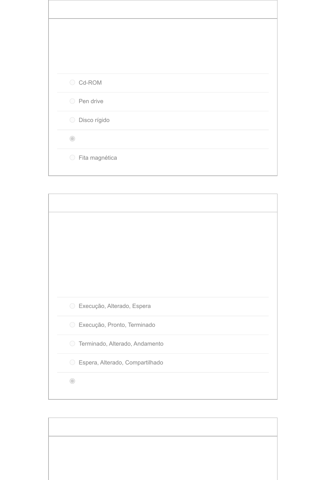 0 / 3 ptsPergunta 1 Em um método de acesso sequencial a gravação de novos registros só é possível no final do arquivo. Assinale a alternativa correta em relação a um tipo de método sequencial: Cd-ROM Pen drive Disco rígido DVD Fita magnética 3 / 3 ptsPergunta 2 Em um sistema multiprogramável, um processo deve alocar exclusivamente o processador, de modo que exista um compartilhamento no uso do processador. Desta forma, os processos passam por diferentes estados ao longo do seu processamento, em função de eventos gerados pelo sistema operacional ou pelo próprio processo. Assinale a alternativa correta em relação aos estados de um processo: Execução, Alterado, Espera Execução, Pronto, Terminado Terminado, Alterado, Andamento Espera, Alterado, Compartilhado Execução, Pronto, Espera 3 / 3 ptsPergunta 3 Dada as afirmativas, assinale V (Verdadeiro) ou F (Falso) para as alternativas: ( ) Semáforos são mecanismos de sincronização que permitem implementar, de forma simples, a exclusão mutua e a sincronização condicional ente processos. ( ) Sincronização condicional é uma situação em que o acesso ao recurso compartilhado exige a sincronização de processos vinculada a uma condição de acesso. ( ) O problema do barbeiro é um exemplo clássico de sincronização de processos proposto por Dijkstra. ( ) Monitores são mecanismos de sincronização de alto nível que tornam mais simples o desenvolvimento de aplicações concorrentes. ( ) Os monitores são mecanismos de sincronização não estruturados. Assinale a alternativa correta: V, V, F, V, F V, V, V, V, F F, F, V, F, F V, F, V, V, F V, F, V, F, V 3 / 3 ptsPergunta 4 A gerencia de dispositivos de entrada e saída é importante para o sistema operacional, pois é através da estrutura de camadas que o sistema operacional é representado como um todo. Assinale a alternativa referente a classificação das camadas: Gerência de Memória e Gerencia de Processos Hardware e Gerência de Memória Hardware e Software Software e Gerência de Processos Controlador e Sistemas de Arquivos 3 / 3 ptsPergunta 5 Em um sistema multiprogramável com apenas um processador, os processos alternam sua execução segundo critérios de escalonamento estabelecidos pelo sistema operacional. Já em sistemas com múltiplos processadores, a possibilidade do paralelismo na execução de instruções somente estende as vantagens que a programação concorrente proporciona. Assinale a alternativa correta em relação ao nome dos comandos para especificação de concorrência em um programa. Parend e Coend Cobegin e Fork Fork e Join Parbegin e Cobegin Main e Join 3 / 3 ptsPergunta 6 Em relação a forma como o arquivo está organizado, o sistema de arquivos pode recuperar os registros de várias formas através dos métodos de acesso. Assinale a alternativa correta e relação aos métodos de acesso a arquivos. Acesso Direto; Acesso Sequencial; Acesso Indexado Acesso Estático, Acesso Dinâmico, Aceso Encadeado Acesso Direto; Acesso Sequencial; Acesso Contíguo Acesso Direto; Acesso Dinâmico; Acesso Indexado Acesso Indireto, Acesso Estático, Acesso Contíguo 3 / 3 ptsPergunta 7 As informações de controle contidas dentro de um arquivo são chamadas de: Dispositivos Rotinas Processo Atributos Aplicação 3 / 3 ptsPergunta 8 I – Um sistema operacional por mais complexo que possa parecer, é apenas um conjunto de rotinas executado pelo processador, de forma semelhante aos programas dos usuários. II – A principal função de um SO é controlar o funcionamento de um computador, gerenciando a utilização e o compartilhamento dos seus diversos recursos, como processadores, memórias e dispositivos de entrada e saída. III – Os tipos de SO são monoprogramáveis, multiprogramáveis e com múltiplos processadores. IV – Os sistemas multiprogramáveis estão divididos em processamento batch, tempo compartilhado e tempo real. Assinale a alternativa correta: II, III e IV I, II e III I, II, III e IV Apenas II I e IV 0 / 3 ptsPergunta 9IncorretaIncorreta Os sistemas operacionais implementam, basicamente, três estratégias para determinar qual área livre um programa será carregado para a execução. Essas estratégias tentam evitar ou diminui o problema de fragmenta externa e são chamadas de: Worst-fit, FiFO, LIFO LIFO, Best-fit, Fisrt-fit First-fit, LIFO, Worst-fit SJF, LIFO, FIFO Best-fit, Worst-fit e Firt-fit 3 / 3 ptsPergunta 10 A evolução dos sistemas operacionais está diretamente relacionada ao desenvolvimento dos computadores. Assinale a alternativa correta em relação ao sistema operacional mais conhecido na década de 90: ULSI Elisa Ubuntu VLSI Linux