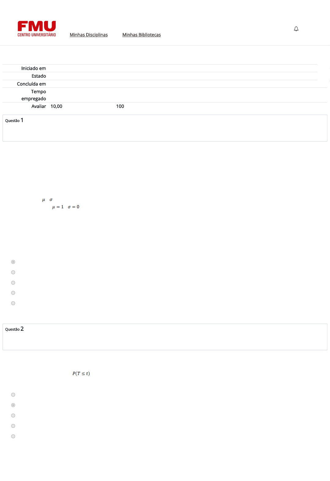 03/06/2024, 11:17 Atividade 4 (A4): Revisão da tentativa https://ambienteacademico.com.br/mod/quiz/review.php?attempt=4491140&cmid=1381572 1/5 Iniciado em segunda, 3 jun 2024, 11:08 Estado Finalizada Concluída em segunda, 3 jun 2024, 11:16 Tempo empregado 8 minutos 28 segundos Avaliar 10,00 de um máximo de 10,00(100%) Questão 1 Correto Atingiu 1,00 de 1,00 Questão 2 Correto Atingiu 1,00 de 1,00 Conforme aponta Castanheira (2013), a distribuição normal de probabilidade é uma distribuição de probabilidade contínua, simétrica em relação à média e assintótica em relação ao eixo das abscissas, em ambas as direções. É também conhecida como distribuição gaussiana e modela o comportamento de diversas variáveis aleatórias que envolvem a análise de processos empresariais ou demais fenômenos naturais, além de poder ser usada com o intuito de aproximar distribuições discretas de probabilidade. CASTANHEIRA, N. P. Estatística aplicada a todos os níveis. Curitiba: Intersaberes, 2013. De acordo com as características atribuídas a uma distribuição normal, avalie as a�rmativas a seguir. I. Uma vez que e geram uma distribuição normal, as tabelas de probabilidade normal são fundamentadas em uma distribuição normal de probabilidade, com e . II. Se uma população tem distribuição normal, conforme de�ne o teorema central do limite, a distribuição das médias amostrais retiradas dessa população também terá distribuição normal. III. Pode ser utilizada como aproximações de outras distribuições de probabilidade, como a distribuição de Poisson e a distribuição binomial. É correto o que se a�rma em: a. II e III, apenas. b. I e III, apenas. c. I, apenas. d. I e II, apenas. e. I, II e III. Se eventos ou sucessos seguem a distribuição de Poisson, podemos determinar a probabilidade de que o primeiro evento ocorra dentro de um período de tempo designado, , como o tempo para percorrer certa distância pela distribuição de probabilidade exponencial. Como estamos tratando com o tempo nesse contexto, a exponencial é uma: a. distribuição de probabilidade composta. b. distribuição de probabilidade contínua. c. distribuição de probabilidade aleatória. d. distribuição de probabilidade discreta. e. distribuição de probabilidade variável. Guia Digital Carreiras e Internacionalização NAP CPA Responsabilidade Socioambiental Minhas Disciplinas Minhas Bibliotecas GS Aces Recu https://codely-fmu-content.s3.amazonaws.com/Moodle/GuiaDigital/Guia+digital/index.html https://carreiras.fmu.br/ https://codely-fmu-content.s3.amazonaws.com/Moodle/NAP/inicial/nap/fmu/index.html https://codely-fmu-content.s3.amazonaws.com/Moodle/CPA/landing_CPA/index.html https://portal.fmu.br/sustentabilidade https://ambienteacademico.com.br/ https://ambienteacademico.com.br/ https://ambienteacademico.com.br/course/view.php?id=236 03/06/2024, 11:17 Atividade 4 (A4): Revisão da tentativa https://ambienteacademico.com.br/mod/quiz/review.php?attempt=4491140&cmid=1381572 2/5 Questão 3 Correto Atingiu 1,00 de 1,00 Questão 4 Correto Atingiu 1,00 de 1,00 A distribuição normal é fundamental para a maior parte das técnicas da estatística prática moderna, sendo a mais importante das distribuições contínuas. Uma característica importante da distribuição normal é que ela depende apenas de dois parâmetros que são a média e o desvio- padrão . Assim, podemos dizer que há uma e somente uma distribuição normal com uma dada média e um dado desvio-padrão . Figura: Curva normal com média e desvio-padrão . Fonte: COSTA NETO, P. L. O.; CYMBALISTA, M. Probabilidades. São Paulo: Edgard Blucher, 2012. Diante dessa de�nição, assinale V para as alternativas verdadeiras e F para as falsas. I. Um ponto selecionado aleatoriamente entre a e b é igual à área sob a curva entre a e b, ou seja, abaixo do grá�co da função. II. A área sob todo o grá�co é igual a 1. III. A distribuição normal com valores de parâmetros e é denominada de distribuição normal padrão. IV. Para e , temos . V. Para e , temos . A sequência correta é: a. F, V, V, F, F. b. V, V, V, F, V. c. V, F, V, V, F. d. F, F, F, V, V. e. V, V, F, F, F. Uma equação que representa a distribuição de probabilidade de uma variável aleatória contínua é denominada de função densidade de probabilidade e resulta em uma curva em forma de sino. Com base no estudo da distribuição normal, apontamos o seguinte problema: após um longo período de estudo, foi identi�cado que a vida útil de determinado componente eletrônico tem distribuição normal com média de 39 semanas e desvio-padrão de 2 semanas. Diante essa de�nição, assinale V para as verdadeiras e F para as falsas, para a probabilidade de que a vida útil de um componente eletrônico seja maior que 35 semanas. I. Devemos considerar área à direita de . II. O valor do escore z é igual a 1,00. III. Devemos considerar o valor do escore z positivo igual a 2,00. IV. A área correspondente equivale a 0,4772. V. A área correspondente equivale a 0,9772. A sequência correta é: a. V, F, V, V, F. b. V, F, V, F, V. c. F, F, V, F, V. d. F, F, V, V, V. e. V, F, V, V, V. Guia Digital Carreiras e Internacionalização NAP CPA Responsabilidade Socioambiental Minhas Disciplinas Minhas Bibliotecas GS Aces Recu https://codely-fmu-content.s3.amazonaws.com/Moodle/GuiaDigital/Guia+digital/index.html https://carreiras.fmu.br/ https://codely-fmu-content.s3.amazonaws.com/Moodle/NAP/inicial/nap/fmu/index.html https://codely-fmu-content.s3.amazonaws.com/Moodle/CPA/landing_CPA/index.html https://portal.fmu.br/sustentabilidade https://ambienteacademico.com.br/ https://ambienteacademico.com.br/ https://ambienteacademico.com.br/course/view.php?id=236 03/06/2024, 11:17 Atividade 4 (A4): Revisão da tentativa https://ambienteacademico.com.br/mod/quiz/review.php?attempt=4491140&cmid=1381572 3/5 Questão 5 Correto Atingiu 1,00 de 1,00 Questão 6 Correto Atingiu 