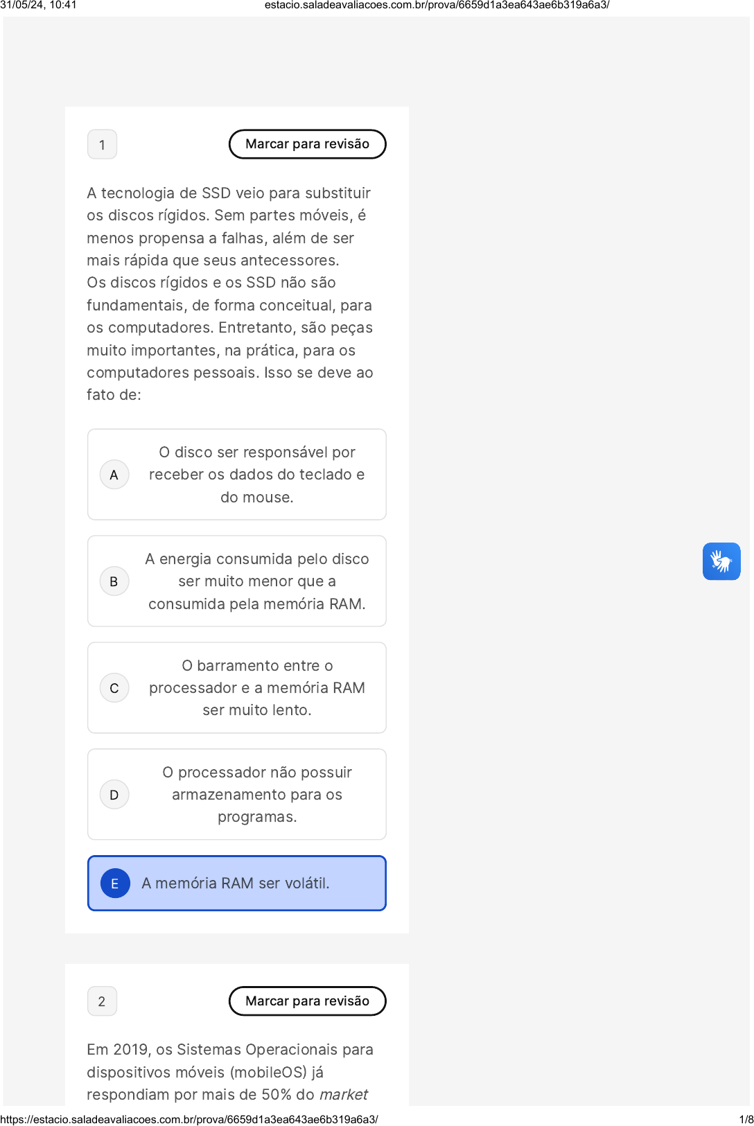 A B C D E 1 Marcar para revisão A tecnologia de SSD veio para substituir os discos rígidos. Sem partes móveis, é menos propensa a falhas, além de ser mais rápida que seus antecessores. Os discos rígidos e os SSD não são fundamentais, de forma conceitual, para os computadores. Entretanto, são peças muito importantes, na prática, para os computadores pessoais. Isso se deve ao fato de: O disco ser responsável por receber os dados do teclado e do mouse. A energia consumida pelo disco ser muito menor que a consumida pela memória RAM. O barramento entre o processador e a memória RAM ser muito lento. O processador não possuir armazenamento para os programas. A memória RAM ser volátil. 2 Marcar para revisão Em 2019, os Sistemas Operacionais para dispositivos móveis (mobileOS� já respondiam por mais de 50% do market 31/05/24, 10:41 estacio.saladeavaliacoes.com.br/prova/6659d1a3ea643ae6b319a6a3/ https://estacio.saladeavaliacoes.com.br/prova/6659d1a3ea643ae6b319a6a3/ 1/8 A B C D E share dos Sistemas Operacionais. Qual das funcionalidades a seguir é responsabilidade do mobileOS de um celular? I. Mostrar notificações. II. Calcular rotas. III. Mostrar a carga restante da bateria. IV. Ler a tela touchscreen. V. Restringir o tráfego de Broadcast. I, II e IV, apenas. III, IV e V, apenas. II e V, apenas. I, III e IV, apenas. I e II, apenas. 3 Marcar para revisão As memórias RAMs passaram por muitas mudanças durante a sua evolução. Uma memória que trouxe um grande diferencial para as então tradicionais SDRAM foi a DDR�SDRAM. Qual é a principal diferença entre a memória DDR�SDRAM e a memória SDRAM em relação ao sinal de clock? 31/05/24, 10:41 estacio.saladeavaliacoes.com.br/prova/6659d1a3ea643ae6b319a6a3/ https://estacio.saladeavaliacoes.com.br/prova/6659d1a3ea643ae6b319a6a3/ 2/8 A B C D E A B DDR�SDRAM não usa sinal de clock. DDR�SDRAM transfere dados na subida e na descida do sinal de clock. SDRAM transfere dados tanto na subida quanto na descida do sinal de clock. DDR�SDRAM transfere dados apenas na subida do sinal de clock. Não há diferença no uso do sinal de clock entre elas. 4 Marcar para revisão Os processadores funcionam através de ordens simples e básicas, tais como: Efetuar a soma de dois números. Mover um dado de um local para outro. Adicionar 1 ao valor do número. Transferir 1 byte de dados da memória para uma porta de saída. Essas ordens são transmitidas ao hardware para serem interpretadas e executadas por meio de sinais elétricos que representam o bit 0 ou o bit 1, que chamamos formalmente de: Combinação. Atuação. 31/05/24, 10:41 estacio.saladeavaliacoes.com.br/prova/6659d1a3ea643ae6b319a6a3/ https://estacio.saladeavaliacoes.com.br/prova/6659d1a3ea643ae6b319a6a3/ 3/8 C D E A B C D E Instrução. Junção. Arrumação. 5 Marcar para revisão Uma empresa de tecnologia está implementando um novo sistema de computação e está focada em entender como os diferentes tipos de dados são representados e armazenados. O que os sistemas de computação utilizam para representar caracteres em um nível mais próximo do usuário? Unidades de informação. Caracteres. Bits. Sistemas de numeração. Palavras. 6 Marcar para revisão A tabela-verdade é um conceito fundamental na lógica booleana e no design de circuitos digitais. 31/05/24, 10:41 estacio.saladeavaliacoes.com.br/prova/6659d1a3ea643ae6b319a6a3/ https://estacio.saladeavaliacoes.com.br/prova/6659d1a3ea643ae6b319a6a3/ 4/8 A B C D E A B Qual é o propósito de uma tabela- verdade na lógica digital? Listar todos os componentes de um circuito. Descrever a relação entre a entrada e a saída de um circuito lógico. Fornecer a sequência de inicialização do circuito. Medir a tensão dos circuitos lógicos. Calcular a corrente elétrica através de um circuito. 7 Marcar para revisão Uma equipe de desenvolvimento está analisando a Taxonomia de Flynn para escolher a arquitetura mais adequada para seu novo software de análise de dados. Eles precisam de um sistema que execute a mesma operação em múltiplos conjuntos de dados simultaneamente. SIMD atende a necessidade deSIMD atende a necessidade de operações paralelas emoperações paralelas em múltiplos dados.múltiplos dados. MIMD é otimizado para executar a mesma operação em dados diferentes. 00 hora : 40 min : 30 seg Ocultar Questão 10 de 10 Respondidas �10� Em branco �0� Finalizar prova 1 2 3 4 5 6 7 8 9 10 SM2 Arquitetura De Computadores 31/05/24, 10:41 estacio.saladeavaliacoes.com.br/prova/6659d1a3ea643ae6b319a6a3/ https://estacio.saladeavaliacoes.com.br/prova/6659d1a3ea643ae6b319a6a3/ 5/8 C D E A B C MISD é mais adequado para operações em múltiplos conjuntos de dados. SISD seria a escolha ideal para essa necessidade. SMP não se aplica à classificação de Flynn, sendo inadequado aqui. 8 Marcar para revisão O surgimento de processadores com arquitetura RISC foi fundamental para o desenvolvimento de smartphones, tablets, "smartwatches" entre muitos outros. Com a restrição de espaço para construir esses equipamentos, a abordagem RISC foi fundamental pois: Diminui o uso de memória, priorizando o disco rígido. Permite o uso de SSD, acelerando a busca de dados. Priorizava execução em registradores, aumentando a eficiência dos programas. 31/05/24, 10:41 estacio.saladeavaliacoes.com.br/prova/6659d1a3ea643ae6b319a6a3/ https://estacio.saladeavaliacoes.com.br/prova/6659d1a3ea643ae6b319a6a3/ 6/8 D E A B C Tem um conjunto amplo de instruções, facilitando a programação dos equipamentos. Possui integração com tecnologia sem fio, possibilitando a plena conexão à internet. 9 Marcar para revisão O endereçamento IPv4 �Internet Protocol Address versão 4� é um sistema endereçamento muito utilizado na Internet. O que é o endereço IPv4 e qual é sua função na comunicação em rede? É uma sequência de seis números usados fisicamente na placa de redes para identificar unicamente um computador ap