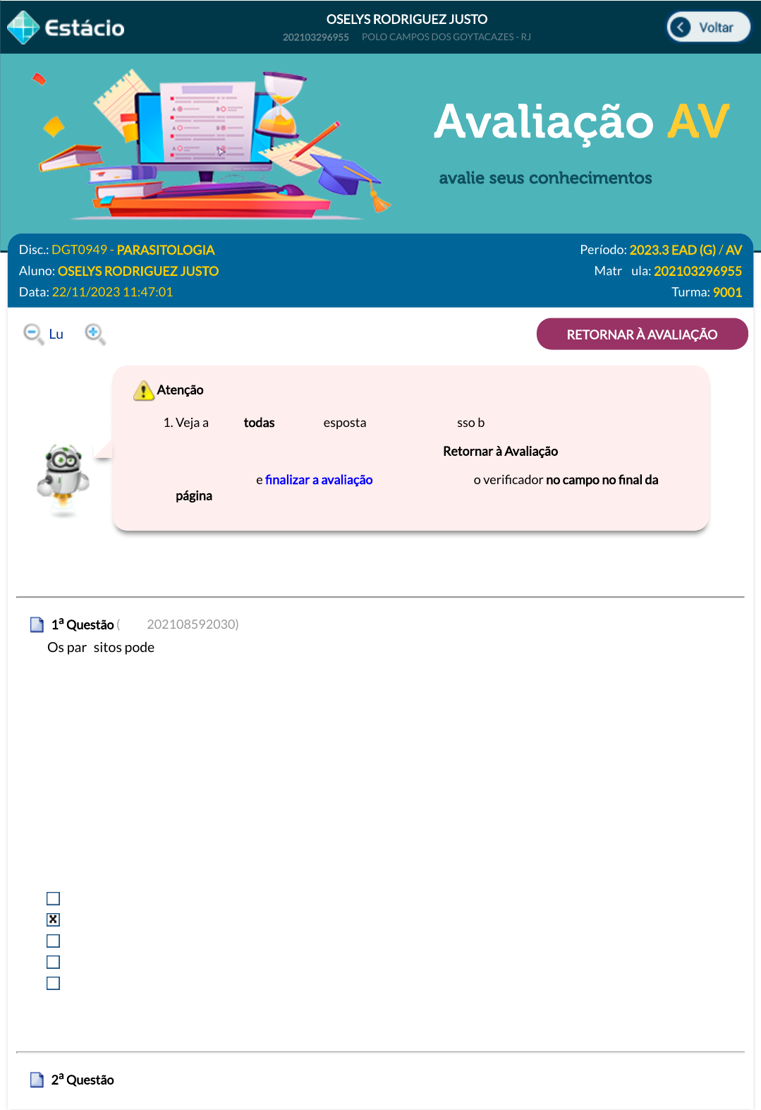2. Caso você queira voltar à prova clique no botão "Retornar à Avaliação".