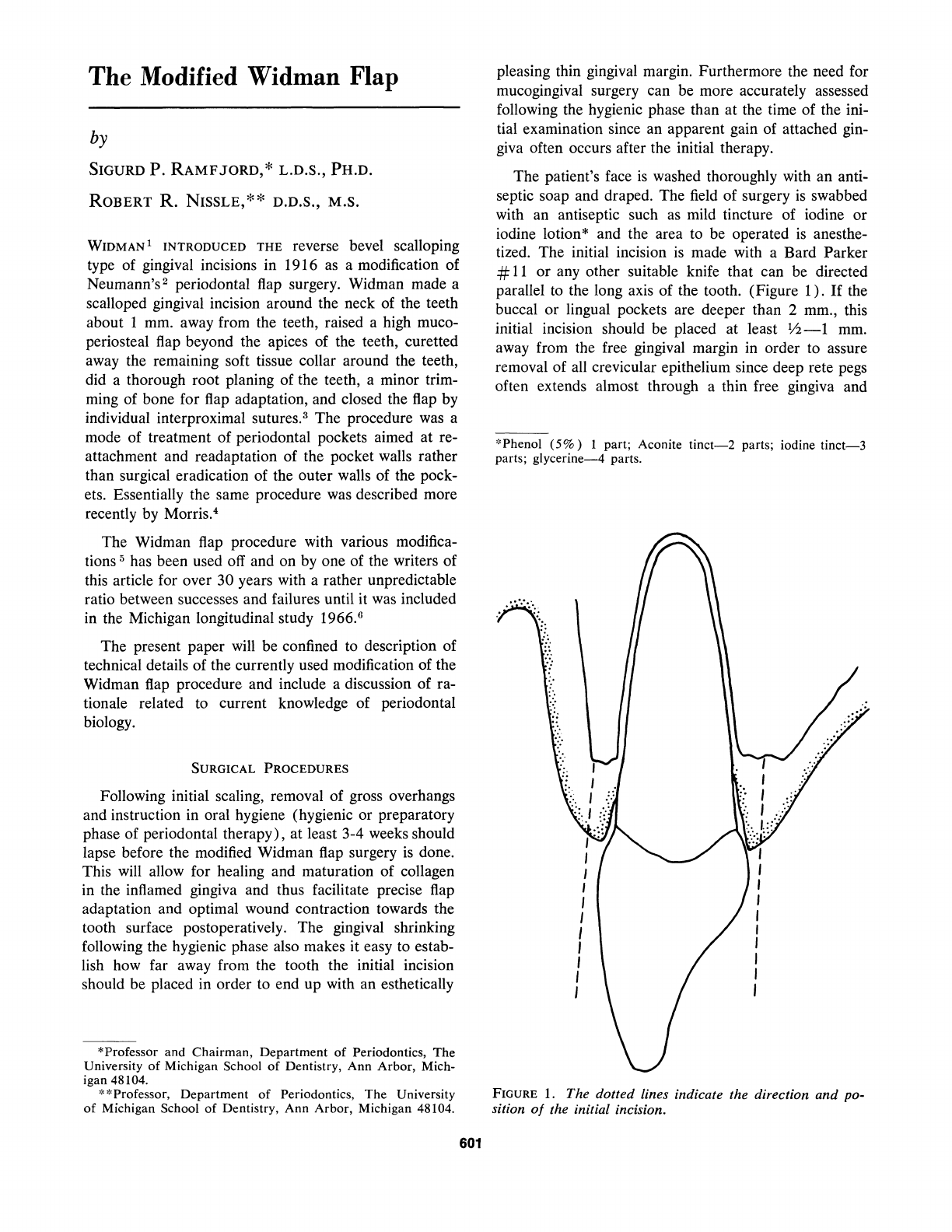 The Modified Widman Flap by S I G U R D P. R A M F J O R D , * L . D . S . , P H . D . R O B E R T R. N I S S L E , * * D . D . S . , M . S . W I D M A N 1 I N T R O D U C E D T H E reverse bevel scalloping type of gingival incisions in 1916 as a modification of Neumann's 2 periodontal flap surgery. Widman made a scalloped gingival incision around the neck of the teeth about 1 mm. away from the teeth, raised a high muco- periosteal flap beyond the apices of the teeth, curetted away the remaining soft tissue collar around the teeth, did a thorough root planing of the teeth, a minor trim ming of bone for flap adaptation, and closed the flap by individual interproximal sutures.3 The procedure was a mode of treatment of periodontal pockets aimed at re attachment and readaptation of the pocket walls rather than surgical eradication of the outer walls of the pock ets. Essentially the same procedure was described more recently by Morris. 4 The Widman flap procedure with various modifica tions 5 has been used off and on by one of the writers of this article for over 30 years with a rather unpredictable ratio between successes and failures until it was included in the Michigan longitudinal study 1966.6 The present paper will be confined to description of technical details of the currently used modification of the Widman flap procedure and include a discussion of ra tionale related to current knowledge of periodontal biology. S U R G I C A L P R O C E D U R E S Following initial scaling, removal of gross overhangs and instruction in oral hygiene (hygienic or preparatory phase of periodontal therapy), at least 3-4 weeks should lapse before the modified Widman flap surgery is done. This will allow for healing and maturation of collagen in the inflamed gingiva and thus facilitate precise flap adaptation and optimal wound contraction towards the tooth surface postoperatively. The gingival shrinking following the hygienic phase also makes it easy to estab lish how far away from the tooth the initial incision should be placed in order to end up with an esthetically pleasing thin gingival margin. Furthermore the need for mucogingival surgery can be more accurately assessed following the hygienic phase than at the time of the ini tial examination since an apparent gain of attached gin giva often occurs after the initial therapy. The patient's face is washed thoroughly with an anti septic soap and draped. The field of surgery is swabbed with an antiseptic such as mild tincture of iodine or iodine lotion* and the area to be operated is anesthe tized. The initial incision is made with a Bard Parker #11 or any other suitable knife that can be directed parallel to the long axis of the tooth. (Figure 1). If the buccal or lingual pockets are deeper than 2 mm., this initial incision should be placed at least 1/2—1 mm. away from the free gingival margin in order to assure removal of all crevicular epithelium since deep rete pegs often extends almost through a thin free gingiva and * Phenol (5%) 1 part; Aconite tinct—2 parts; iodine tinct—3 parts; glycerine—4 parts. FIGURE 1. The dotted lines indicate the direction and po sition of the initial incision. *Professor and Chairman, Department of Periodontics, The University of Michigan School of Dentistry, Ann Arbor, Mich igan 48104. ** Professor, Department of Periodontics, The University of Michigan School of Dentistry, Ann Arbor, Michigan 48104. 601 602 Ramfjord, Nissle J. Periodontol. August, 1974 would prevent reattachment of the pocket wall to the tooth. When buccal pockets are shallow, and/or esthetic considerations are important, one may use an intra- crevicular incision or incise at the free gingival margin (Figure 2 ) . The scalloping effect of the incision should be exag gerated on the palatal aspect in order to insure flap adaptation interproximally later (Figure 3) . Also be sure to direct the scalpel slightly palatal to the long axis of the tooth aiming for the alveolar process 1-2 mm. palatally to the alveolar crest (Figure 4 ) , otherwise flap adaptation and flap contour will not be satisfactory. It is important for postoperative flap adaptation to remove the very minimum of interproximal tissues needed for elimination of epithelial lining of the pockets. This is especially important from the palatal side since this flap cannot be stretched. However, in the middle of the interproximal areas the epithelial projections often come close to meet between the mesial and the distal FIGURE 2. Intracrevicular incision indicated by dotted lines. Used for shallow pockets and thin free gingiva. FIGURE 3. Schematic cross-section through maxillary front teeth. Dotted lines indicate the initial incision which will separate completely some of the interproximal areas from the future flaps. Note the exaggerated palatal scalloping effect. The interproximal flaps may overlap slightly after suturing. aspects of the papillae (Figure 5) . In order to promote connective tissue reattachment all interproximal struc tures infiltrated by epithelium must be removed. When the roots of the teeth are situated closely together it is FIGURE 4. The dotted line indicates the reverse bevel char acter of the palatal incision in order to secure good con tour and flap adaptation postsurgically. 603 Modified Widman Flap Volume 45 Number 8 therefore advisable to make the initial incision in such a manner that some interproximal tissues remain with the collar of tissues which separates the flaps from the teeth (Figure 3) . Vertical releasing incisions through the interdental papillae and into the attached gingiva should be ex tended 2-3 mm. apically to the initial incision at each end of the flap. Avoid vertical incisions in the palate in the second bicuspid, first and second molar areas. Use mucoperiosteal elevators to raise a full thickness flap only for 2-3 mm. or the minimum needed to deflect the flap enough to gain later access to the surfaces of the teeth, to the alveolar crest and
