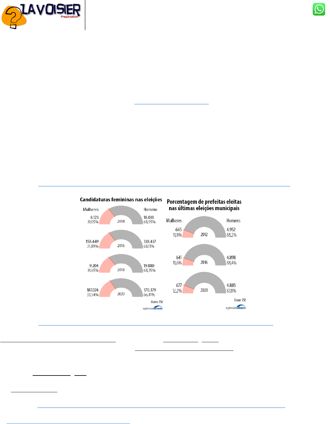 99 99165-2562 PROPOSTA DE REDAÇÃO A partir da leitura dos textos motivadores e com base nos conhecimentos construídos ao longo de sua formação, redija um texto dissertativo-argumentativo em modalidade escrita formal da língua portuguesa sobre o tema “O espaço das mulheres no cenário político”, apresentando proposta de intervenção que respeite os direitos humanos. Selecione, organize e relacione, de forma coerente e coesa, argumentos e fatos para defesa de seu ponto de vista. TEXTO I Deputadas e especialistas criticaram nesta sexta-feira (27) a baixa representatividade feminina na política brasileira. O tema foi debatido pelo Observatório Nacional da Mulher na Política, da Secretaria da Mulher da Câmara dos Deputados. Procuradora da Mulher da Câmara, a deputada Tereza Nelma (PSDB-AL) lamentou o percentual ainda pequeno de mulheres no Parlamento brasileiro, em comparação com países conhecidos por negarem direitos às mulheres. “Somos apenas 15% dos integrantes na Câmara Federal. E o Brasil perde para quase todos os países da América Latina em percentuais de participação política de mulheres. Vejam só, até neste momento difícil do Afeganistão, principalmente para as mulheres e crianças, vemos que lá o Parlamento tem 27% de mulheres”, declarou. Em julho, o Brasil ocupava a posição de número 140 no que se refere à participação política feminina, em ranking que contempla 192 países pesquisados pela União Interparlamentar. O País está atrás de todas as nações da América Latina, com exceção do Paraguai e do Haiti. No Brasil, a Câmara dos Deputados possui apenas 15% de mulheres; e o Senado Federal,12%. Em âmbito municipal, 900 municípios não tiveram sequer uma vereadora eleita nas eleições de 2020. Disponível em: <https://www.camara.leg.br/noticias/800827-especialistas-lamentam-baixa-representatividade-feminina-na-politica/> TEXTO II Disponível em: <https://www12.senado.leg.br/noticias/infomaterias/2022/05/aliados-na-luta-por-mais-mulheres-na-politica/> TEXTO III Primeira mulher a ser eleita governadora de Pernambuco, Raquel Lyra (PSDB) montou o secretariado com o maior número de mulheres da história do estado. Dos 27 nomes escolhidos para a equipe, 13 são mulheres. A maioria da equipe, porém, é composta por homens: eles são 14 em todo o secretariado. O número de mulheres, no entanto, é bem superior aos demais governos. A equipe que encerrou o mandato do ex-governador Paulo Câmara (PSB) tinha cinco mulheres entre 23 secretários (21,73% da equipe). Desde 1995, entre os times anunciados após as posses dos governadores, o que tinha mais mulheres era o composto por Eduardo Campos no segundo mandato, em 2011. A gestão começou com quatro mulheres entre 27 secretários. Uma delas era a própria Raquel Lyra, então secretária especial de Articulação Social. Disponível em:<https://www.gazetadopovo.com.br/republica/lula-tem-numero-recorde-de-mulheres-em-ministerios-alto-escalao/> TEXTO IV : A Emenda Constitucional (EC) nº 97/2017 vedou, a partir de 2020, a celebração de coligações nas eleições proporcionais para a Câmara dos Deputados, Câmara Legislativa, assembleias legislativas e câmaras municipais. Um dos principais reflexos da mudança se dará no ato do pedido de registro de candidaturas à Justiça Eleitoral, especialmente porque, com o fim das coligações, cada partido deverá, individualmente, indicar o mínimo de 30% de mulheres filiadas para concorrer no pleito. Segundo o Glossário Eleitoral, coligação é a união de dois ou mais partidos com vistas à apresentação conjunta de candidatos a determinada eleição. Quando é celebrada uma coligação, esse grupo de partidos passa a se relacionar com a Justiça Eleitoral de uma maneira única. Contudo, com as alterações promovidas pela EC 97, nas eleições proporcionais, cada agremiação partidária terá de indicar seus candidatos. De acordo com o secretário Judiciário do Tribunal Superior Eleitoral (TSE), Fernando Alencastro, a partir de 2020, as legendas deverão encaminhar à Justiça Eleitoral, juntamente com o Demonstrativo de Regularidade de Atos Partidários (DRAP), a lista de candidatas que concorrerão no pleito, respeitando-se o percentual mínimo de 30% e o máximo de 70% para candidaturas de cada sexo. A regra está prevista no artigo 10, parágrafo 3º da Lei nº 9.504/1997 (Lei das Eleições). “Antes, a indicação de mulheres para participar das eleições era por coligação e, agora, será por partido. A mudança vai impactar principalmente o fomento à participação feminina na política, muito incentivado pela legislação. Agora, o partido não vai poder ter como escudo outros partidos para que, enquanto coligação, eles atingissem os 30%”, observa Alencastro. Participa Mulher Para incentivar o protagonismo feminino na política a Comissão Gestora de Política de Gênero do TSE (TSE Mulheres) criou o projeto #ParticipaMulher. A página na internet dessa campanha permanente da Justiça Eleitoral reúne informações sobre a história do voto feminino, as primeiras mulheres a conquistar espaços de relevância no meio político e notícias que abordam a atualidade dessa participação. A Comissão TSE Mulheres foi instituída em 2019 para atuar no planejamento e no acompanhamento de ações relacionadas ao incentivo à participação feminina na política e na Justiça Eleitoral. A ideia é inspirar mulheres a ocuparem cargos políticos e mostrar que o aumento de lideranças femininas é bom para toda a sociedade. TEXTO V : A sub-representação da mulher na política não é apenas injusta, é também prejudicial ao país (...). “Isso tem que mudar. É uma sub-representação não apenas injusta, mas que tem consequências indesejáveis para o nosso país. Digo isso porque acredito que a maior participação das mulheres — além de fazer avançar as pautas femininas, evidentemente — traz um novo olhar para a políti