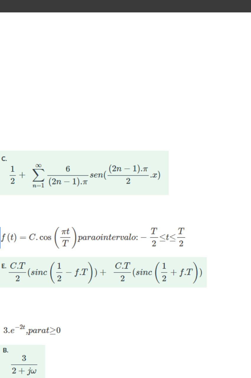 Calcule a transformada de Fourier para a função 𝑓(𝑡)=𝐶.cos(πt𝑇)para𝑜intervalo:−𝑇2≤𝑡≤𝑇2