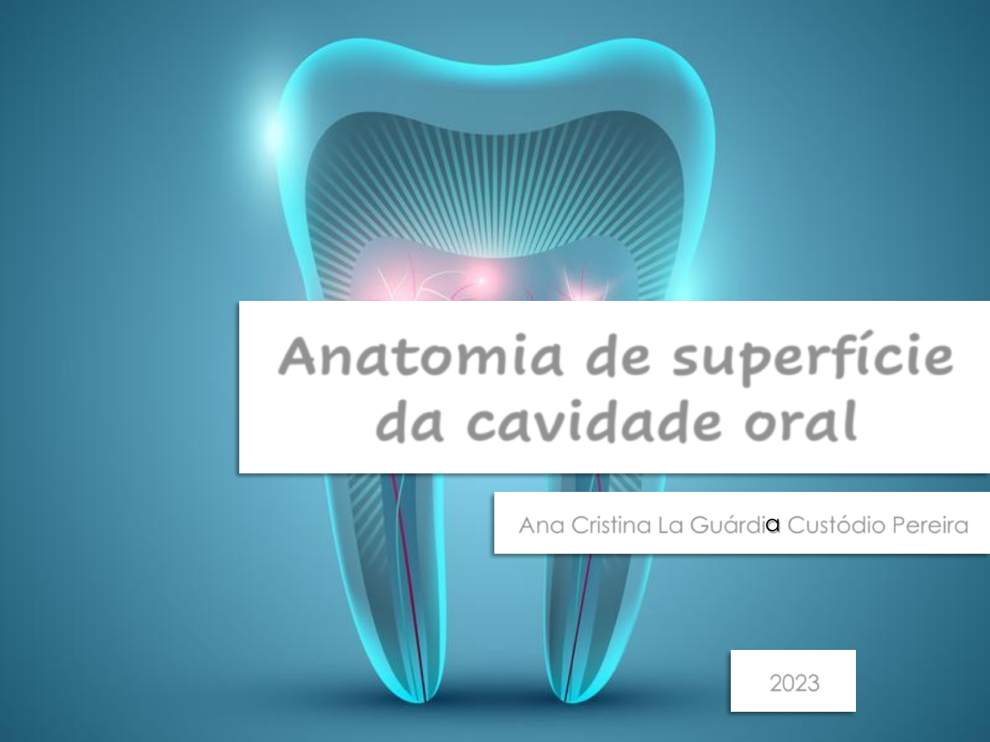 Anatomia de superfície da cavidade oral Ana Cristina La Guárdia Custódio Pereira 2023 Cavidade oral ✓ Vestíbulo; ✓ Cavidade oral propriamente dita. Vestíbulo da boca ✓ Fórnice do vestíbulo; ✓ Mucosa alveolar; ✓ Gengiva; ✓ Junção mucogengival; ✓ Sulco gengival; ✓ Papila interdental; ✓ Papila retromolar. Mucosa oral ✓ É constituída por tecido epitelial e por uma fina faixa de tecido conjuntivo conhecida como lâmina própria; ✓ Na interface desses tecidos localiza uma estrutura que viabiliza a nutrição do tecido epitelial: a membrana basal; ✓ O epitélio da cavidade oral é do tipo pavimentoso estratificado, sendo constituído por queratinócitos. Mucosa oral A arquitetura básica da mucosa oral embora seja relativamente constante, em alguns sítios específicos da cavidade oral pode haver variação no seu padrão organizacional. Mucosa oral ✓ Epitélio não queratinizado: lábios, bochechas, processo alveolar, palato mole, soalho de boca e face inferior da língua; ✓ Submucosa: face inferior da língua (se observa as glândulas salivares menores dispersa na matriz conjuntiva com abundância de fibras colágenas); ✓ Mucosa mastigatória: reveste a gengiva e palato duro apresenta epitélio queratinizado. Mucosa oral ✓ Região de palato: processo palatino da maxila e às lâminas horizontais dos ossos palatinos: epitélio ortoqueratinizado. ✓ Gengival marginal e inserida: epitélio paraqueratinizado. Anatomia de superfície da cavidade oral Limites da cavidade oral: ✓ Lábios – anteriormente; ✓ Bochechas – lateralmente; ✓ Palato – superiormente; ✓ Soalho da boca – inferiormente; ✓ Arcos palatoglosso e palatofaríngeo – posteriormente. Limite anterior - lábios ✓ Lábios superior e inferior limitam anteriormente a cavidade oral, entre elas a rima oral; ✓ Na extremidade os lábios se encontram formando o ângulo da boca (ou comissura labial); ✓ O limite do lábio superior é a base do nariz; ✓ Da linha mediana existe o sulco raso denominado filtro. Limite anterior - lábios ✓ Os sulcos nasolabiais: delimitam lateralmente o lábio superior (asa do nariz às comissuras); ✓ Tubérculo do lábio superior: projeção inferior da zona vermelha. Limite anterior - lábios 1) Rima da boca; 2) Ângulo da boca; 3) Filtro; 4) Sulco nasolabial; 5) Sulco labiomarginal. Limite anterior - lábios Limite anterior - lábios ✓ Lábio inferior: limitado inferiormente pelo sulco labiomentual; ✓ Sulco labiomarginal: limite lateral (comissura labial à base da mandíbula); ✓ Na margem livre dos lábios está a zona vermelha, é coberta por mucosa aglandular, ricamente vascularizada e inervada. Perda da dimensão vertical Limite anterior - lábios Lábios - camadas ✓ Pele: glândulas sebáceas e sudoríparas; ✓ Tecido subcutâneo: fáscia superficial (tecido conjuntivo frouxo e gordura); ✓ Camada muscular: músculo orbicular da boca; ✓ Submucosa: vasos sanguíneos e glândulas salivares menores. Lábios - camadas Túnica mucosa: ✓ Glândulas sebáceas ectópicas = grânulos de Fordyce que aparecem como manchas amarelas separadas ou formando placas. Frênulos São feixes de tecido fibroso revestidos por mucosa e se apresentam como pregas. Frênulos laterais chamados bridas. Frênulo do lábio superior. Frênulo do lábio inferior. ✓ Pacientes desdentados, os frênulos se situam ao nível do rebordo residual Palato duro – palato mole Limite Superior Rafe palatina Rafe incisiva Rafe palatina Palato duro – palato mole Limite Superior 1) Papila incisiva; 2) Pregas palatinas transversas; 3) Rafe palatina; 4) Mucosa do palato. Bochechas – composição ✓ Pele: presença de glândulas sebáceas e sudoríparas; ✓ Tecido subcutâneo: corpo adiposo da bochecha; ✓ Camada muscular: músculo bucinador; ✓ Submucosa: presença de glândulas salivares e vasos sanguíneos; ✓ Túnica mucosa: possibilidade de glândulas sebáceas ectópicas. Bochechas – composição 1) Dente superior; 2) Dente inferior; 3) Fórnice do vestíbulo; 4) Bochecha; 5) Prega pteriogomandibular. Bochechas – limite lateral Tecido subcutâneo: ✓ Músculo bucinador; ✓ Corpo adiposo da bochecha; ✓ Ducto parotídeo; ✓ Músculos da expressão facial. Soalho da boca - limite inferior ✓ Frênulo lingual; ✓ Carúnculas sublinguais; ✓ Pregas sublinguais; ✓ Músculo milo-hioideo + revestimento mucoso. Soalho da boca - limite inferior ✓ Músculos: músculos gênio-hioideos, músculos milo- hioideos, músculos hioglossos, ventre anterior do músculo digástrico, juntamente com seu tendão intermediário. Anquilogossia - Rânula Soalho da boca 1) Face inferior da língua; 2) Freio da língua; 3) Carúncula sublingual; 4) Prega franjada. Soalho da boca 1) Margem da língua; 2) Freio da língua; 3) Carúncula sublingual; 4) Prega sublingual; 5) Mucosa do soalho bucal. Limite Posterior ✓ O limite entre o palato duro e o palato mole pode ser reconhecido facilmente pela diferença de coloração; ✓ Na borda livre do palato mole (véu palatino), na sua porção mediana, encontramos uma projeção cônica de comprimento variável chamada de úvula; ✓ Lateralmente temos os arcos palatinos do istmo da garganta; Limite Posterior O palato mole é formado, de ambos os lados, pelos músculos elevador e tensor do véu palatino, palatoglosso, palatofaríngeo e da úvula. Limite Posterior Arco palatoglosso Tonsila palatina (amigdala) Arco palatofaríngeo Limite Posterior 1) Palato mole; 2) Úvula; 3) Arco palatoglosso; 4) Arco palatofaríngeo; 5) Istmo da garganta. Obrigada! anaclaguardia@gmail.com Slide 1 Slide 2 Slide 3 Slide 4 Slide 5 Slide 6 Slide 7 Slide 8 Slide 9 Slide 10 Slide 11 Slide 12 Slide 13 Slide 14 Slide 15 Slide 16 Slide 17 Slide 18 Slide 19 Slide 20 Slide 21 Slide 22 Slide 23 Slide 24 Slide 25 Slide 26 Slide 27 Slide 28 Slide 29 Slide 30 Slide 31 Slide 32