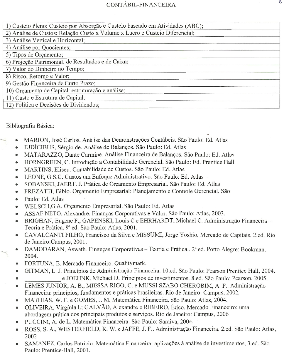 CONTABIL-FINANCEIRA 1) Custeio Pleno: Custeio por Absorção e Custeio baseado em Atividades (ABC); 2) Análise de Custos: Relação Custo x Volume x Lucro e Custeio Diferencial; 3) Análise Vertical e Horizontal; 4) Análise por Quocientes; 5) Tipos de Orçamento; 6) Projeção Patrimonial, de Resultados e de Caixa; 7) Valor do Dinheiro no Tempo; 8) Risco, Retorno e Valor; 9) Gestão Financeira de Curto Prazo; 10) Orçamento de Capital: estruturação e análise; 11) Custo e Estrutura de Capital; 12) Política e Decisões de Dividendos; Bibliografia Básica: MARION, José Carlos. Análise das Demonstrações Contábeis. São Paulo: Ed. Atlas IUDÍCIBUS, Sérgio de. Análise de Balanços. São Paulo: Ed. Atlas MATARAZZO, Dante Carmine. Análise Financeira de Balanços. São Paulo: Ed. Atlas HORNGREEN, C. Introdução a Contabilidade Gerencial. São Paulo: Ed. Prentice Hall MARTINS, Eliseu. Contabilidade de Custos. São Paulo: Ed. Atlas LEONE, G.S.C. Custos um Enfoque Administrativo. São Paulo: Ed. Atlas SOBANSKI, JAERT. J. Prática de Orçamento Empresarial. São Paulo: Ed. Atlas FREZATTI, Fábio. Orçamento Empresarial: Planejamento e Controle Gerencial. São Paulo: Ed. Atlas WELSCH,G.A. Orçamento Empresarial. São Paulo: Ed. Atlas ASSAF NETO, Alexandre. Finanças Corporativas e Valor. São Paulo: Atlas, 2003. BRIGHAN, Eugene F., GAPENSKI, Louis C e EHRHARDT, Michael C. Administração Financeira — Teoria e Prática. 9º ed. São Paulo: Atlas, 2001. se CAVALCANTI FILHO, Francisco da Silva e MISSUMI, Jorge Yoshio. Mercado de Capitais. 2.ed. Rio de Janeiro:Campus, 2001. e DAMODARAN, Aswath. Finanças Corporativas — Teoria e Prática.. 2º ed. Porto Alegre: Bookman, 2004, eo FORTUNA, E. Mercado Financeiro. Qualitymark. e GITMAN,L.J. Princípios de Administração Financeira. 10.ed. São Paulo: Pearson Prentice Hall, 2004. º e JOEHNK, Michael D. Princípios de investimentos. 8.ed. São Paulo: Pearson, 2005. e LEMES JUNIOR, A. B., MIESSA RIGO, C. e MUSSI SZABO CHEROBIM, A. P.. Administração Financeira: princípios, fundamentos e práticas brasileiras. Rio de Janeiro: Campus, 2002. e MATHIAS, W.F .e GOMES, J. M . Matemática Financeira. São Paulo: Atlas, 2004. e OLIVEIRA, Virginia I ; GALVÃO, Alexandre e RIBEIRO, Érico. Mercado Financeiro: uma abordagem prática dos principais produtos e serviços. Rio de Janeiro: Campus, 2006 PUCCINI, A . de L . Matemática Financeira. São Paulo: Saraiva, 2004. ROSS, S. A., WESTERFIELD, R. W. e JAFFE, J. F.. Administração Financeira. 2.ed. São Paulo: Atlas, 2002 e SAMANEZ, Carlos Patricio. Matematica Financeira: aplicações a análise de investimentos, 3.ed. São Paulo: Prentice-Hall, 2001.