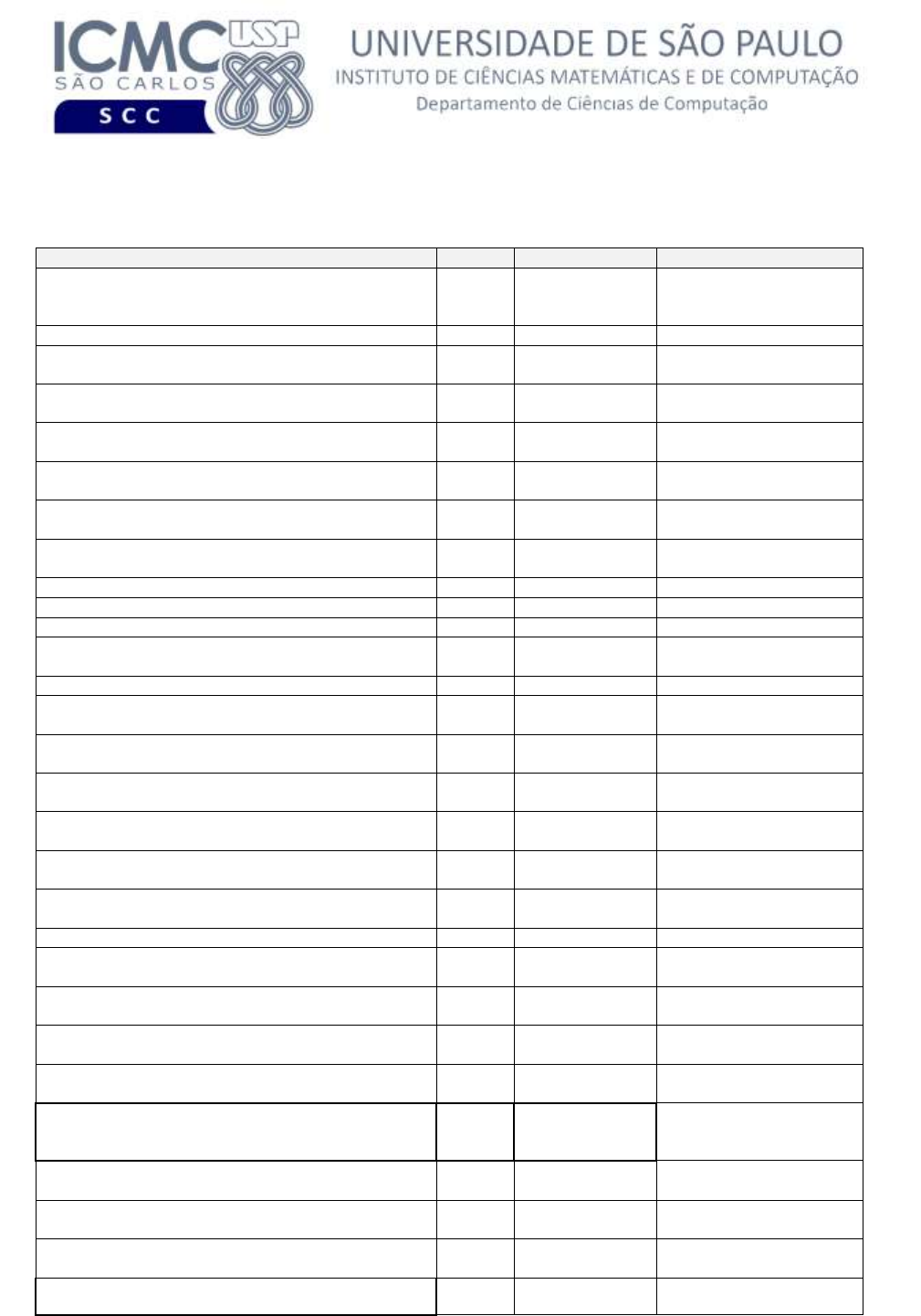 Av. Trabalhador São-carlense, 400 . centro. Cx. Postal 668. cep 13560-970 . São Carlos – SP. Brasil www.icmc.usp.br Disciplinas a cargo do SCC a serem ofertadas no PAE no 2ºSem/2024 Disciplinas Turma Horário Docente PRG0018 - Processamento de Linguagem Natural (oferecimento online e síncrono) (sem limite de matriculados) Qua. 16:20/18:00 Thiago Alexandre S. Pardo SCC0122 – Estrutura de Dados 01 A definir André de Freitas Smaira SCC0201 – Introdução à Ciência de Computação II 01 Seg. 08:10/09:50 Qui. 10:10/11:50 Diego Raphael Amancio SCC0201 – Introdução à Ciência de Computação II 02 Seg. 10:10/11:50 Qui. 08:10/09:50 Marcelo Garcia Manzato SCC0202 – Algoritmos e Estruturas de Dados I 01 Seg. 10:10/11:50 Qui. 08:10/09:50 Rudinei Goularte SCC0202 – Algoritmos e Estruturas de Dados I 02 Seg. 08:10/09:50 Qui. 10:10/11:50 Rudinei Goularte SCC0205 – Teoria da Computação e Linguagens Formais 01 Ter. 10:10/11:50 Sex. 08:10/09:50 Renato Moraes Silva SCC0205 – Teoria da Computação e Linguagens Formais 02 Ter. 08:10/09:50 Sex. 10:10/11:50 Renato Moraes Silva SCC0207 - Computadores e Sociedade I 01 Qua. 08:10/09:50 Bruna Carolina R. da Cunha SCC0207 - Computadores e Sociedade I 02 Qua. 10:10/11:50 Bruna Carolina R. da Cunha SCC0209 – Empreendedores em Informática 01 A definir Solange Oliveira Rezende SCC0211 – Laboratório de Algoritmos Avançados II 01 Sex. 14:20/16:50 João do Espírito Santo B. Neto SCC0213 – Metodologia de Pesquisa em computação 01 Ter. 19:00/20:40 Agma Juci Machado Traina SCC0218 – Algoritmos Avançados e Aplicações 01 Sex. 10:10/11:50 João do Espírito Santo B. Neto SCC0218 – Algoritmos Avançados e Aplicações 02 Sex. 08:10/09:50 João do Espírito Santo B. Neto SCC0219 – Introdução ao Desenvolvimento Web 01 Seg. 08:10/ 09:50 Qua. 14:20/16:00 Dilvan de Abreu Moreira SCC0220 – Laboratório de Introdução à Ciência de Computação II 01 Sex. 14:20/16:00 Sex. 16:20/18:00 André de Freitas Smaira SCC0223 - Estruturas de dados I 01 Ter. 08:10/09:50 Qui. 08:10/09:50 Thiago Alexandre S. Pardo SCC0227 – Seminários de Computação I (quinzenal) 01 Qua. 14:20/16:00 Maria Cristina F. de Oliveira SCC0229 – Seminários de Computação III (quinzenal) 01 Qua. 14:20/16:00 Diego Furtado Silva SCC0230 – Inteligência Artificial 01 Ter. 08:10/09:50 Sex. 10:10/11:50 Alneu de Andrade Lopes SCC0230 – Inteligência Artificial 02 Ter. 10:10/11:50 Sex. 08:10/09:50 Alneu de Andrade Lopes SCC0233 - Aplicações de Aprendizado de Máquina e Mineração de Dados 01 A definir Diego Furtado Silva SCC0241 – Laboratório de Bases de Dados (EM LÍNGUA INGLESA) 01 A definir José Fernando Rodrigues Junior SCC0244 – Mineração a partir de Grandes Bases de Dados 01 Ter. 16:20/19:00 Caetano Traina Jr SCC0250 - Computação Gráfica 01 Seg. 08:10/09:50 Qua. 08:10/09:50 Jean Roberto Ponciano SCC0252 - Visualização Computacional 01 Ter. 13:30/16:00 Maria Cristina Ferreira de Oliveira SCC0260 – Interação Humano Computador 01 A definir Kamila Rios da Hora Rodrigues SCC0271 – Introdução à Bioinformática 01 A definir Ricardo Cerri Av. Trabalhador São-carlense, 400 . centro. Cx. Postal 668. cep 13560-970 . São Carlos – SP. Brasil www.icmc.usp.br SCC0273 – Robôs Móveis e Inteligentes 01 A definir Roseli Ap Francelin Romero SCC0275 – Introdução à Ciência de Dados 01 A definir Roseli Ap Francelin Romero SCC0277 - Competições de Ciência de Dados 01 A definir Ricardo Cerri SCC0283 - Introdução à Web Semântica (espelhada com SCC5929) 01 A definir Dilvan de Abreu Moreira SCC0284 - Sistemas de Recomendação (espelhada com SCC5966) 01 A definir Marcelo Garcia Manzato SCC0287 – Mineração de Dados Não Estruturados 01 A definir Ricardo Marcondes Marcacini SCC0289 – Projeto de Intercâmbio I 01 --- Solange Oliveira Rezende (2cr) Diego Furtado Silva (1cr) Dilvan de Abreu Moreira(1cr) SCC0290 – Projeto de Intercâmbio II 01 --- Agma Juci Machado Traina Jean Roberto Ponciano SCC0291 – Estágio Supervisionado I 01 ---- Bruna Carolina R. da Cunha (1cr) Thiago Alexandre S. Pardo (1cr) Diego Raphael Amancio (2cr) SCC0292 – Estágio Supervisionado II 01 ---- Alneu de Andrade Lopes Elaine Parros Machado de Sousa João do Espírito Santo B. Neto João Luís Garcia Rosa SCC0293 – Projeto de Graduação I 01 ---- Kamila Rios H. Rodrigues (1cr) Marcelo Garcia Manzato (1cr) Maria Cristina F. de Oliveira (2cr) SCC0294 – Projeto de Graduação II 01 ---- Caetano Traina Jr Moacir Antonelli Ponti Ricardo Cerri Rudinei Goularte SCC0300 – Projeto Empreendedor I 01 ---- Ricardo Marcondes Marcacini Roseli Ap Francelin Romero SCC0302 – Projeto Empreendedor II 01 ---- Jose Fernando Rodrigues Jr (1cr) Thiago Alexandre S. Pardo (2cr) Renato Moraes Silva (1cr) SCC0502 – Algoritmos e Estruturas de Dados I 01 Seg. 21:00/22:40 Qui. 19:00/20:40 Moacir Antonelli Ponti SCC0540 – Bases de Dados 01 Ter. 19:00/20:40 Qui. 21:00/22:40 Elaine Parros Machado de Sousa SCC0560 - Interação Humano-Computador e Experiência do Usuário 01 Qua. 19:00/20:40 Sex. 21:00/22:40 Bruna Carolina R. da Cunha SCC0580 – Acessibilidade em Sistemas Computacionais 01 Ter. 19:00/20:40 Kamila Rios H. Rodrigues Av. Trabalhador São-carlense, 400 . centro. Cx. Postal 668. cep 13560-970 . São Carlos – SP. Brasil www.icmc.usp.br SCC0604 – Programação Orientada a Objetos 01 Ter. 10:10/11:50 Sex. 08:10/09:50 Anderson Canale Garcia SCC0607 – Estruturas de Dados III 01 Ter. 16:20/18:00 Qui. 10:10/11:50 Anderson Canale Garcia SCC0640 – Bases de Dados 01 Seg. 14:20/16:00 Qua. 10:10/11:50 Elaine Parros Machado de Sousa SCC0641 – Laboratório de Bases de Dados 01 Seg. 19:00/20:40 Seg. 21:00/22:40 Caetano Traina Jr SCC0650 – Computação Gráfica 01 Qua. 13:20/16:00 Jean Roberto Ponciano SCC0910 – Tópicos Avançados em Ciências de Computação I (espelhada com SCC5977) (tópico: Aprendizado de Máquina para Séries Temporais) 01 A definir Diego Furta