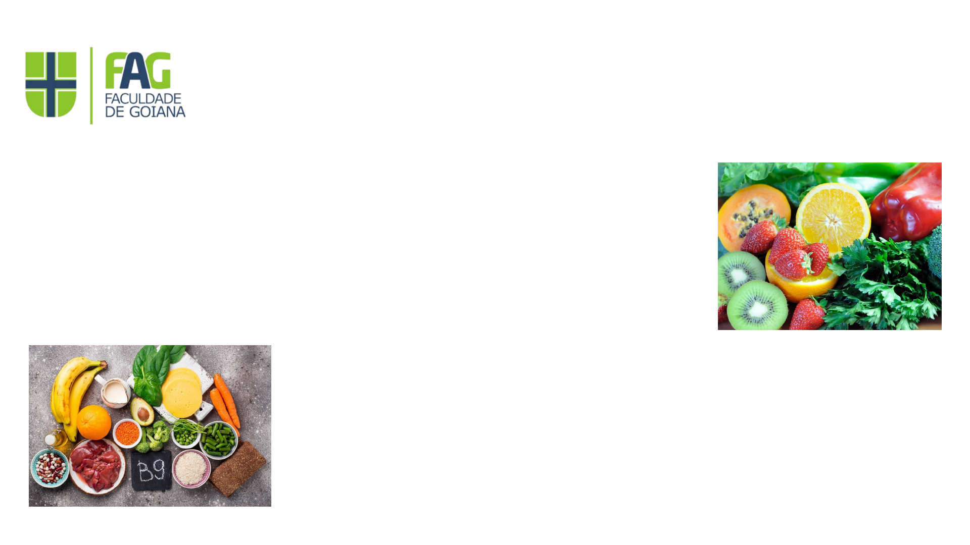 Vitaminas C e B9 FACULDADE DE GOIANA – FAG CURSO: Bacharelado em Enfermagem DISCIPLINA: Nutrição Aplicada à Enfermagem EQUIPE: Ana Claudia : Eloisa : Isabel Cristina : Vânia Regina DOCENTE: Kelly Cristina Muniz Goiana, 09/2023 Introdução Este trabalho abordará as principais fontes das vitaminas C e B9 (Acido Fólico), mostrando as suas funções e atuações no organismo humano e quais seus benefícios nutricionais e efeitos colaterais se consumidas em excesso. 1. Funções e Atuação no Organismo; 2. Fontes Alimentares; 3. Doses Diárias Recomendadas; 4. Alterações por Carência; 5. Alterações por Excesso. Objetivo Entender como as vitaminas agem de forma positiva em nosso organismo e também identificar os sinais e sintomas de sua carência e seu excesso para serem aplicados na pratica como profissionais de Enfermagem. Vitamina C A vitamina C, também chamada de ácido ascórbico, é um nutriente solúvel em água, ou seja, sua absorção pelo organismo requer a associação a líquidos, uma das vitaminas essenciais para o bom funcionamento do nosso organismo. Uma de suas principais funções é contribuir para a formação de componentes fundamentais, como músculos, vasos sanguíneos e estruturas ósseas. Funções e Atuação da Vitamina C Devido sua potente ação antioxidante (neutraliza os radicais livres), previne o envelhecimento precoce e protege o corpo contra diversas doenças, como por exemplo o câncer; Melhora o sistema imunológico, aumentando assim as defesas do organismo; Fortalece as paredes dos vasos sanguíneos; Ajuda na absorção do ferro com baixa biodisponibilidade (não-heme); Melhora a consistência dos ossos, tendões, cartilagens e dentes; É importante para formação de colágeno(importante para cicatrização de lesões); Funções e Atuação da Vitamina C Auxilia na formação das hemácias (células sanguíneas); Auxilia na regulação do metabolismo dos aminoácidos; Participa da síntese da carnitina, aminoácido que atua na utilização da gordura como fonte de energia; Favorece a memória e a cognição; Diminui o Colesterol LDL “ruim” Auxilia no Controle da PA; Ajuda no Combate á Anemia. Principais Fontes de Vitamina C - Maracujá - Laranja - Limão - Mamão - Caju - Kiwi - Melão - Pimentão - Agrião - Salsa - Couve - Alface - Repolho - Fava - Tomate - Cenoura - Couve-flor - Batatas - Brócolis - Nabo - Espinafre - Abobrinha Doses Diárias De Vitamina C Recomendadas Crianças: 0-6 meses: 40mg/dia 7-12 meses: 50mg/dia 1-03 anos: 15mg/dia 4-8 anos: 25mg/dia 9-13 anos: 45mg/dia Doses Diárias De Vitamina C Recomendadas Adolescentes: Mulheres de 14 a 18 anos: 65mg/dia Homens de 14 a 18 anos: 75mg/dia Adultos: Homens de 19 anos a mais: 90mg/dia Mulheres de 19 anos a mais: 75mg/dia Alterações no Organismo por Carência de Vitamina C Escorbuto: Fraqueza; Dores Musculares; Irritabilidade; Hemorragia na Gengiva; Dentes Amolecidos; Alterações na Pele; Edema na Articulações; Infecção; Dificuldade na Cicatrização; Alterações no Organismo por Excesso de Vitamina C Envolvendo o Sistema Digestório: Diarreia; Náusea; Vômito; Azia; Dor abdominal. Riscos de: Aumento da Absorção de Ferro; Dificuldade na Absorção Intestinal de Vitamina B12; Atua alterando a concentração de certos fármacos, afetando o metabolismo renal; Cálculos Renais. Vitamina B9 (Á. Fólico) A vitamina B9, também conhecida como ácido fólico ou folacina, possui fundamental importância para o nosso organismo já que é responsável pela formação de proteínas e hemoglobina. O ácido fólico é uma vitamina hidrossolúvel importante para diversas funções do organismo. Funções e Atuação da Vitamina B9 (Á. Fólico) Fornecimento de Energia; Melhora nos Transtornos de Humor (eleva os níveis de serotonina); Protege os Ossos e o Coração (reduz níveis de homocisteína); Previne Queda de Cabelo Grave e no tratamento de Acnes; Atua no metabolismo de aminoácidos, na síntese dos ácidos nucleicos e na formação de células sanguíneas e de outros constituintes do sistema nervoso; Fundamental para o Crescimento Saudável do Feto. Funções e Atuação da Vitamina B9 (Á. Fólico) Principais Fontes de Vitamina B9 ou Ácido Fólico - Aspargo - Couve-flor - Laranja - Ervilha - Abacate - Salmão - Atum - Soja - Sementes de - Fígado Girassol - Milho - Frutos do Mar - Amendoim - Produção por Bactérias da Flora Intestinal. Doses Diárias De Vitamina B9 Recomendadas Homens: 400mcg/dia; Mulheres: 400mcg/dia; Gravidez: 800mcg/dia; Lactação: 500mcg/dia. Alterações no Organismo por Carência de Vitamina B9 (Á. Fólico) Cansaço; Insônia; Ulcerações na Cavidade Oral; Cefaleia; Falta de Ar; Fraqueza; Mal Formação Fetal (espinha bífida); Esterilidade Masculina; Anemia por carência de Á. Fólico e seus sintomas: Cansaço e fraqueza persistente; Diarreia; Perda de Peso; Textura diferenciada na Língua; Irritabilidade; Palidez; Tontura; Letargia; Perda de Apetite. Alterações no Organismo por Carência de Vitamina B9 (Á. Fólico) Alterações no Organismo por Excesso de Vitamina B9 (Á. Fólico) Transtornos do Sono; Erupções na Pele; Irritabilidade; Confusão; Desconfortos Abdominais; Diarreia; Convulsões; Cãibras Abdominais; Náuseas. Conclusão Concluímos que o conhecimento sobre as vitaminas é um importante recurso terapêutico e holístico para o profissional de enfermagem, na prevenção, controle de doenças e na promoção a saúde, melhorando assim a qualidade de vida dos pacientes. Referencias https://www.mundoboaforma.com.br/falta-de-acido-folico-sintomas-causa-fontes-e-dicas https://www.passeidireto.com/arquivo/65256746/vitaminas https://www.cpt.com.br/saude/vitamina-b9-importancia-fontes-de-alimentos-valores-nutricionais-carencia-e-excesso https://brasilescola.uol.com.br/biologia/vitamina-c.htm https://www.google.com/search?q=sintomas+do+excesso+de+acido+foliico https://www.benegrip.com.br/saude/vitaminas/vitamina-c https://blog.c